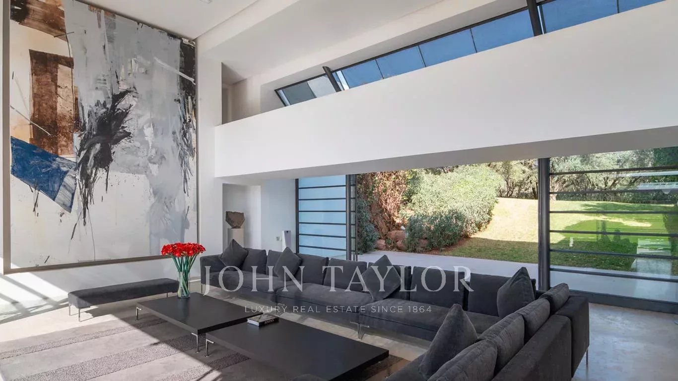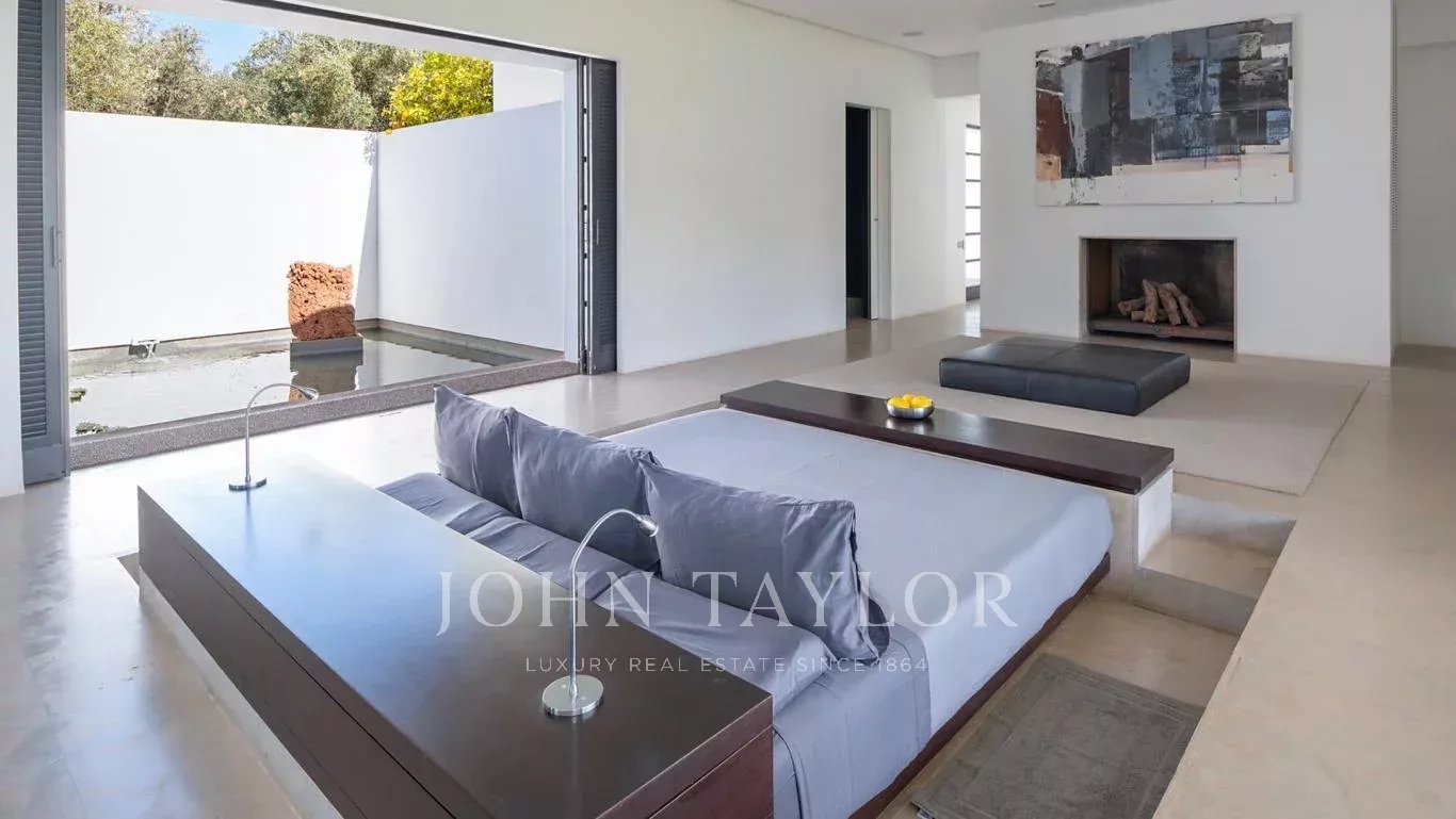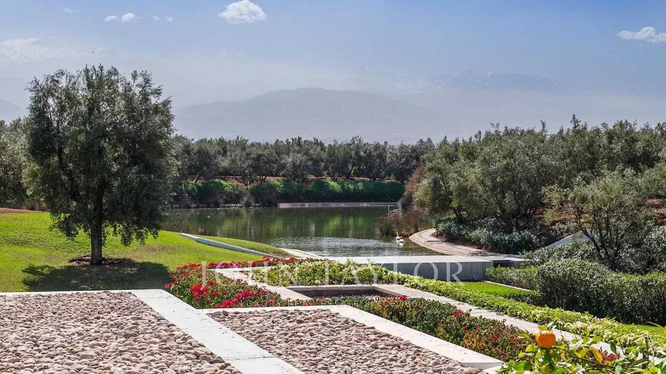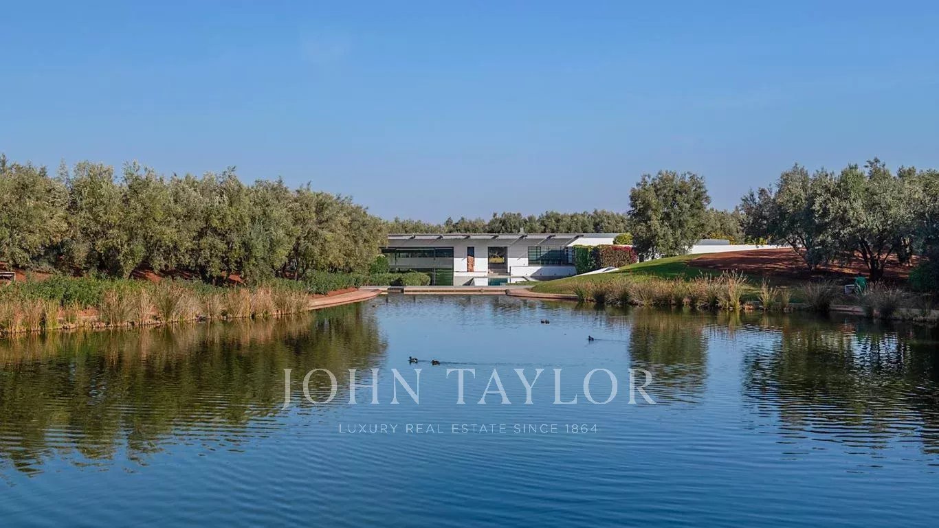 Built on a beautifully landscaped 4 hectare plot housing an impressive 5 000 sqm lake, an oasis of olive trees and a 50m swimming-pool, the villa with minimalist lines delights with splendid views over the snow-covered peaks of the Atlas.