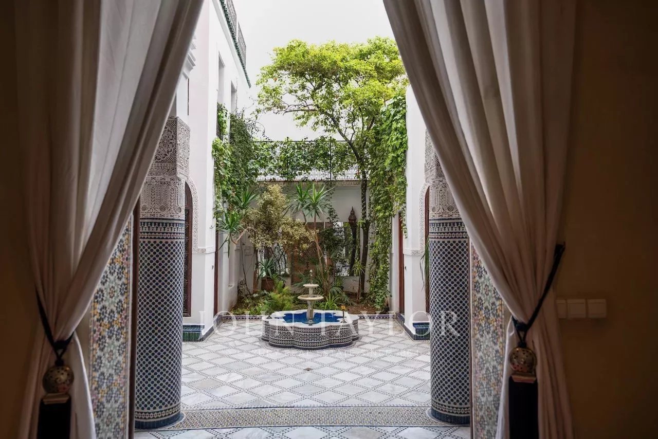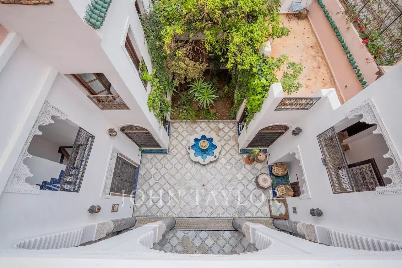 Boasting a 190 sqm footprint, the Riad comprises around a handsome leafy courtyard with marble fountain: a kitchen, several lounges as well as 6 ensuite bedrooms.