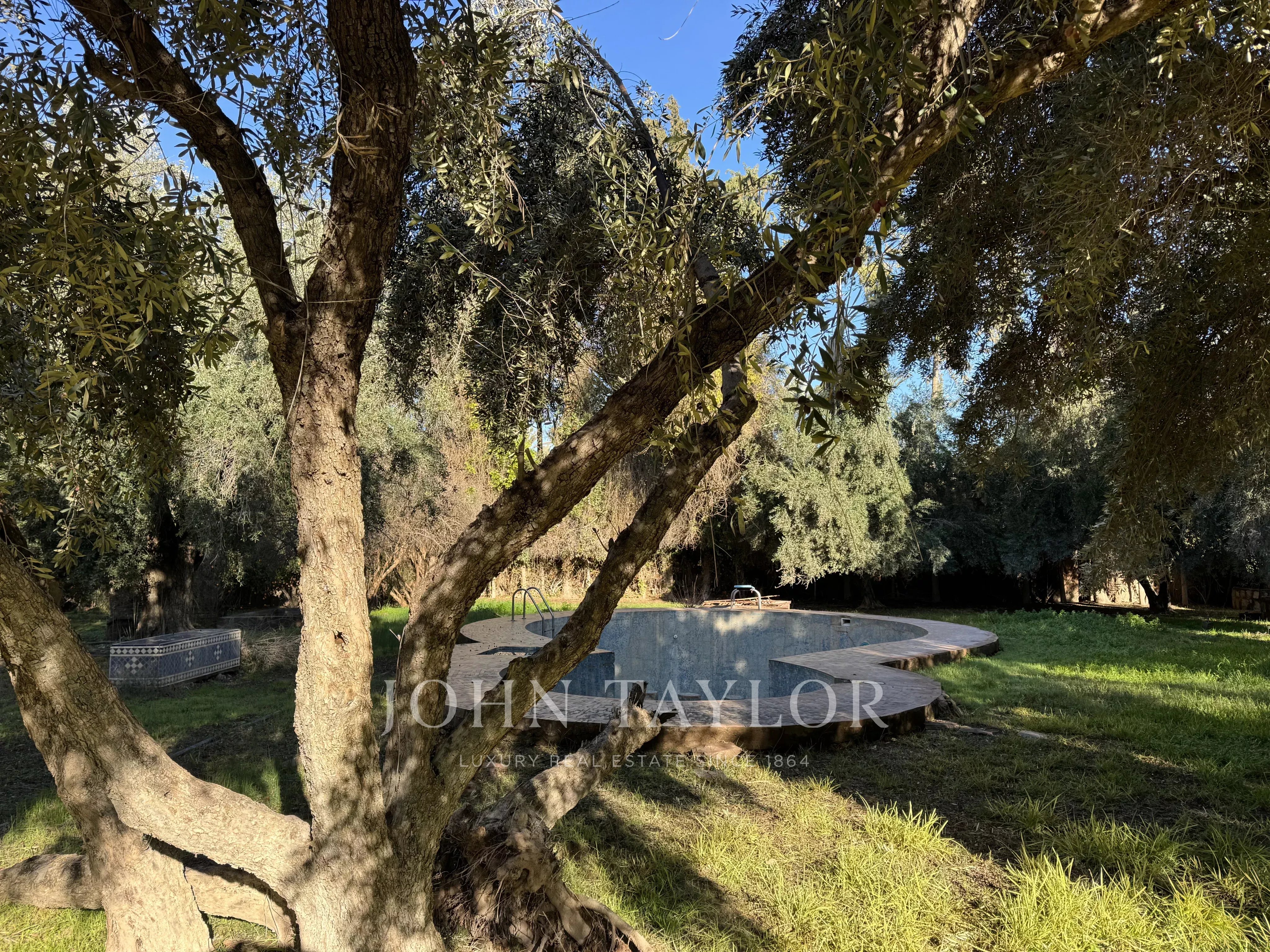 Nestled within a magnificent one-hectare park of mature olive and palm trees, this titled villa for sale in the Palmeraie of Marrakech captures the essence of Moroccan gardens and tranquility. The property includes a main villa, a vintage swimming pool, and a charming pavilion, all surrounded by lush, established gardens offering privacy and serenity.
