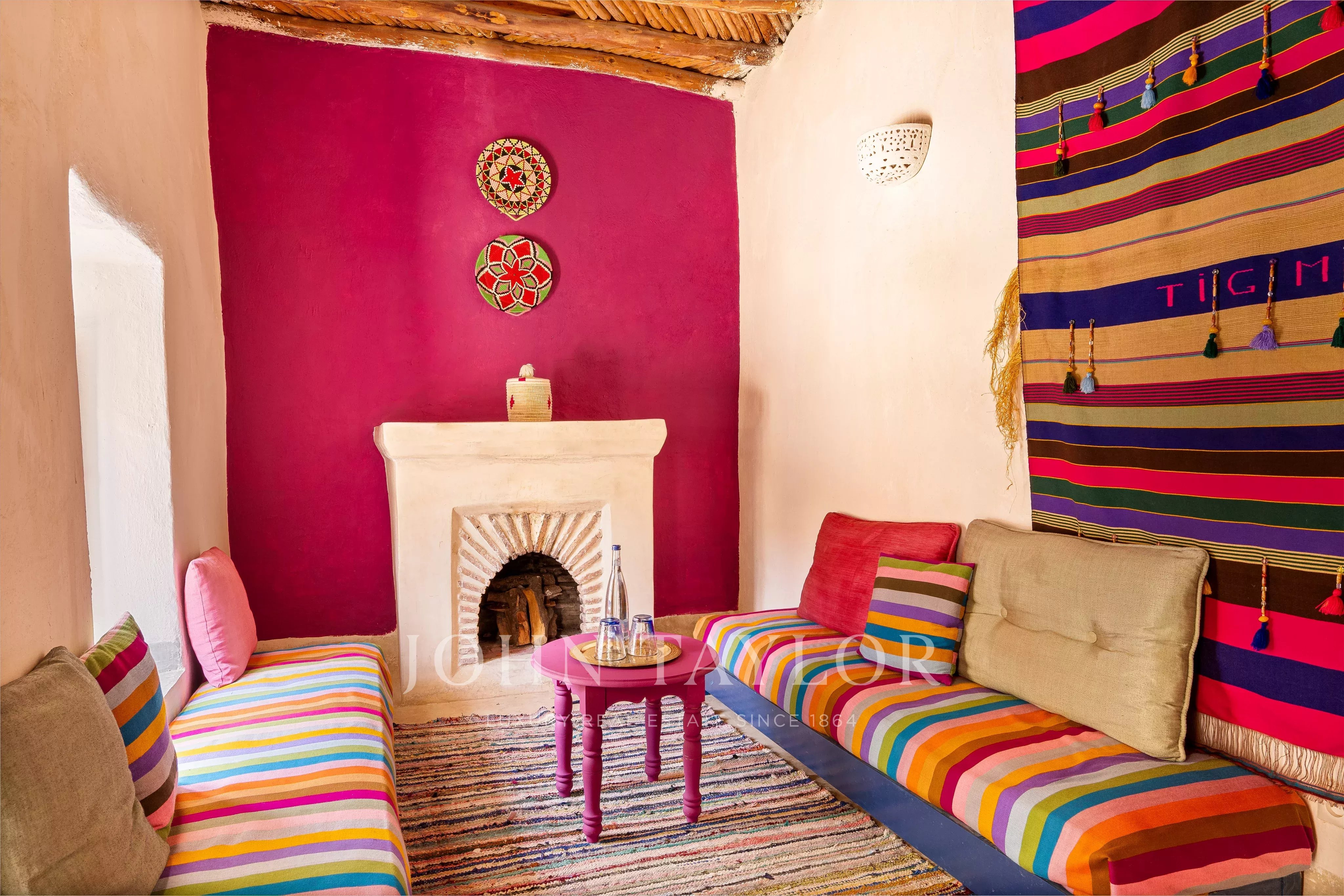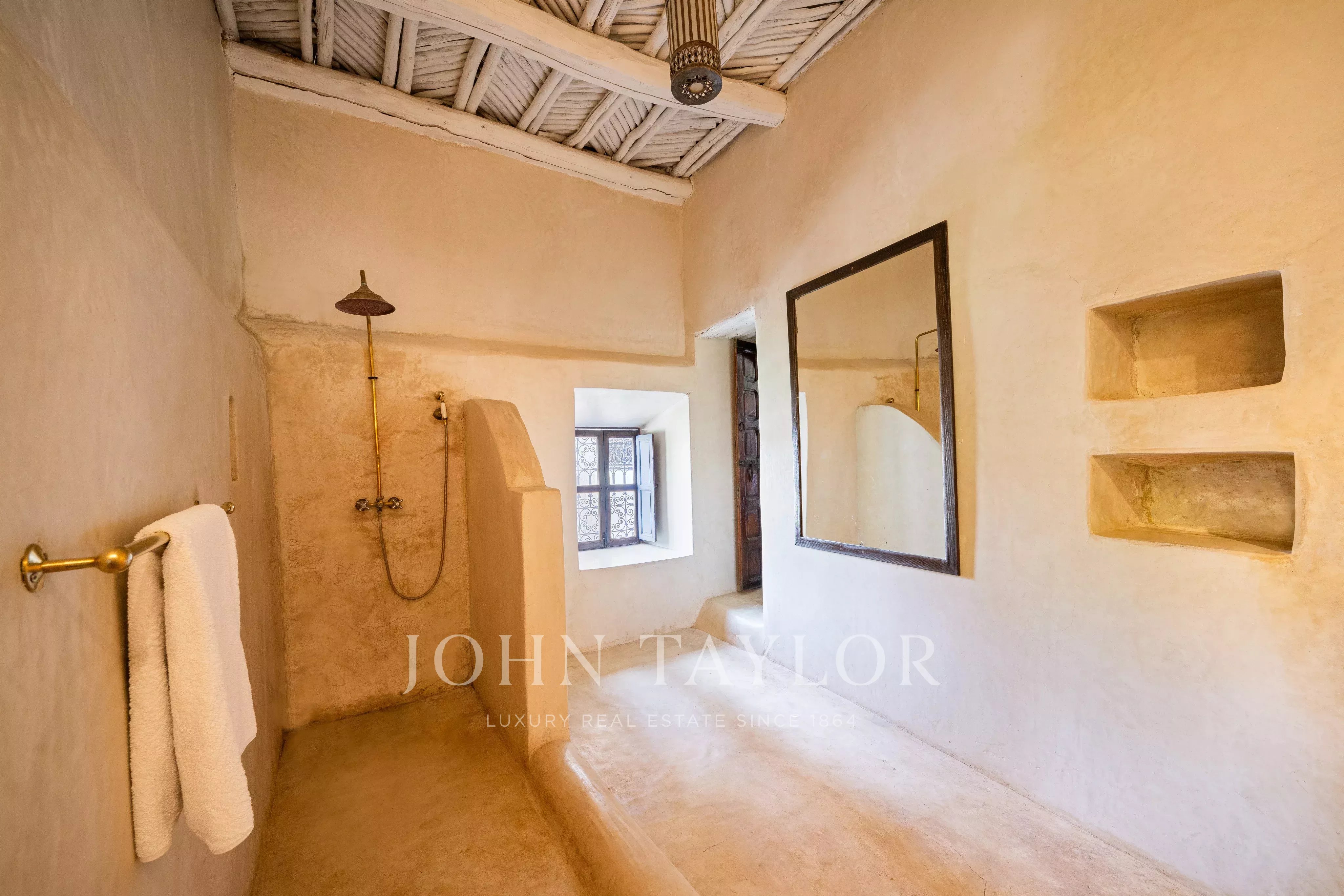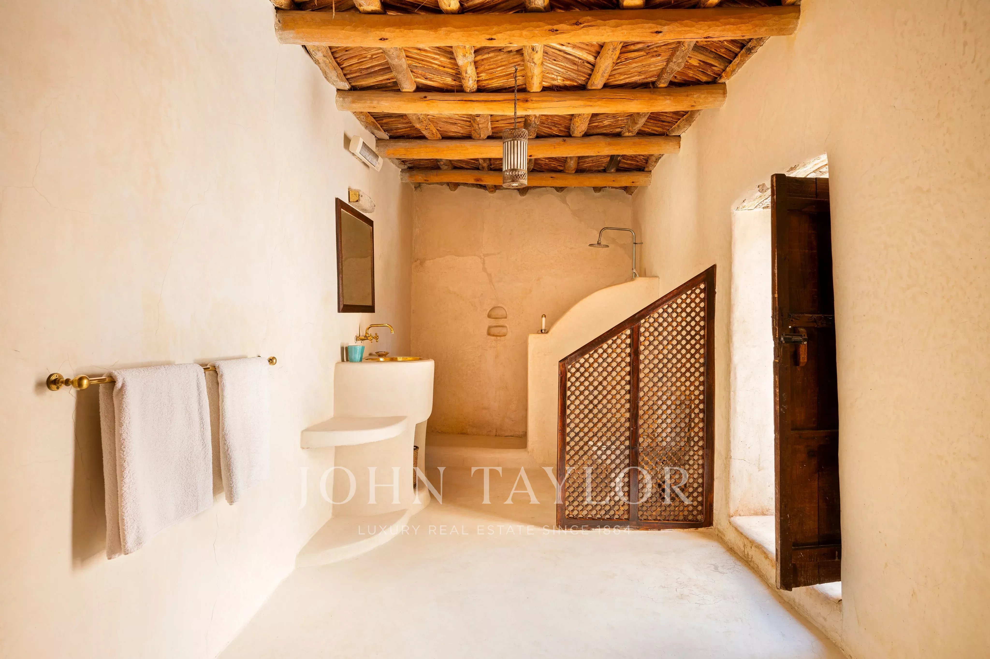 Designed in the most charming and authentic Berber style consisting of succession of interlacing courtyards, the 2 building combine rammed earth and tadelakt, with wood beamed ceilings: it perfectly blends in its local environment.