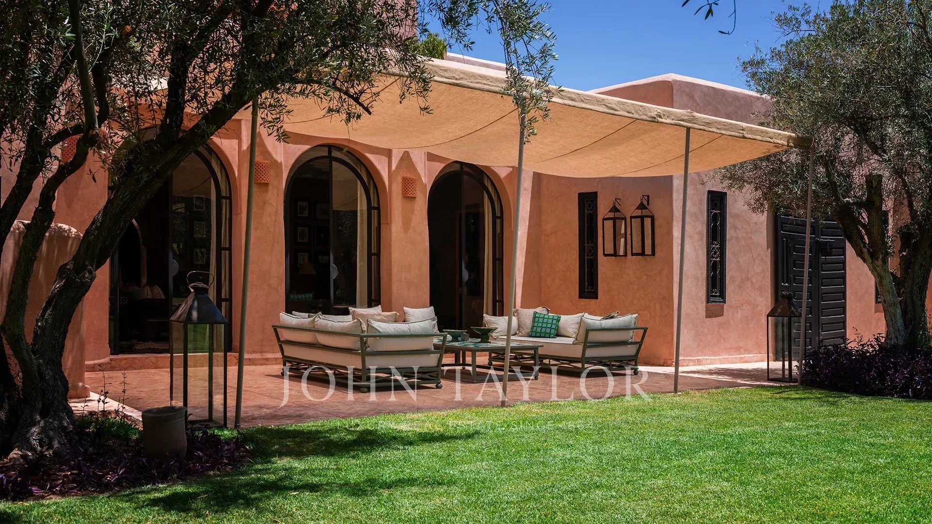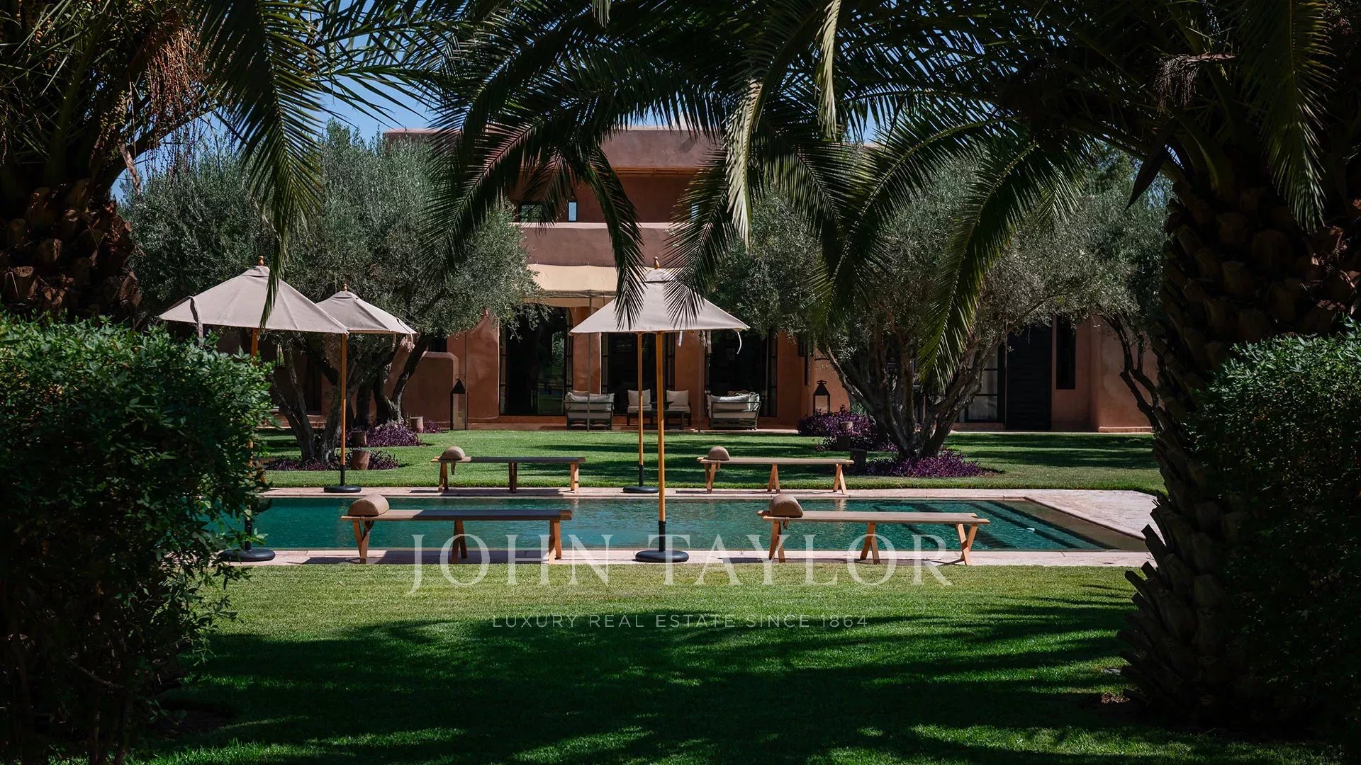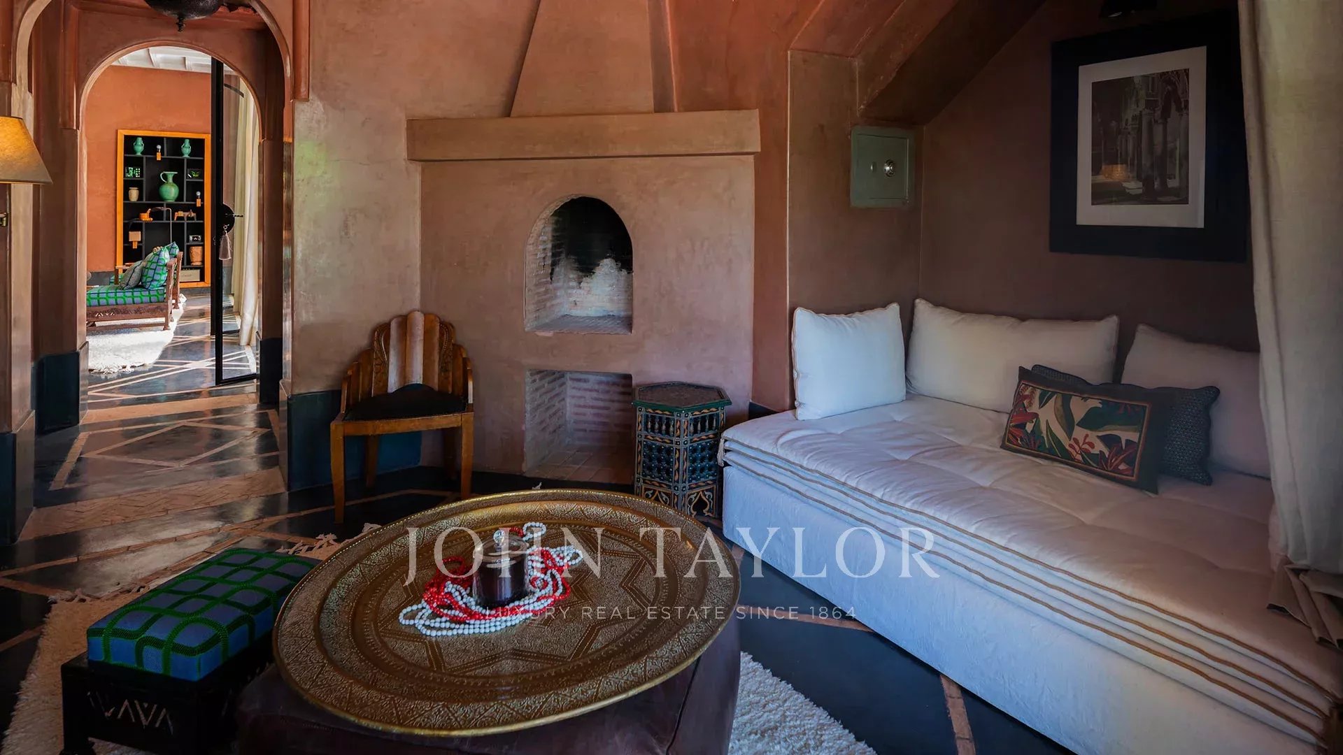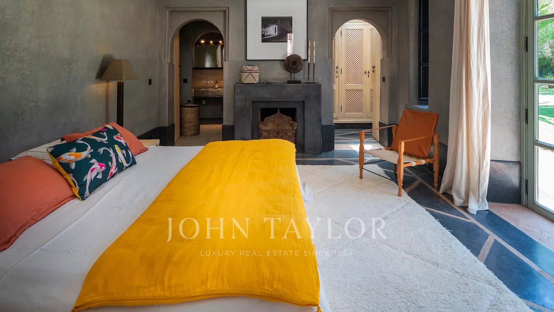 The 450 m² main villa features a beautiful entrance hall, a cosy living room with fireplace, a dining room, a TV area, a fully-equipped kitchen and 4 large suites with private terraces, a staff area, a roof terrace with fireplace and a magnificent view of the Atlas Mountains.