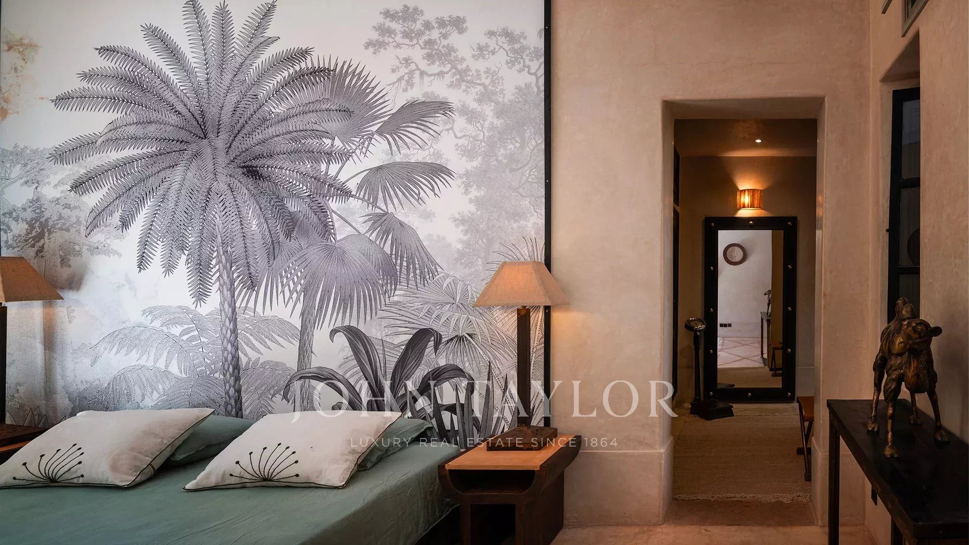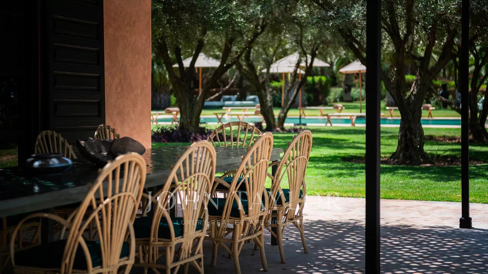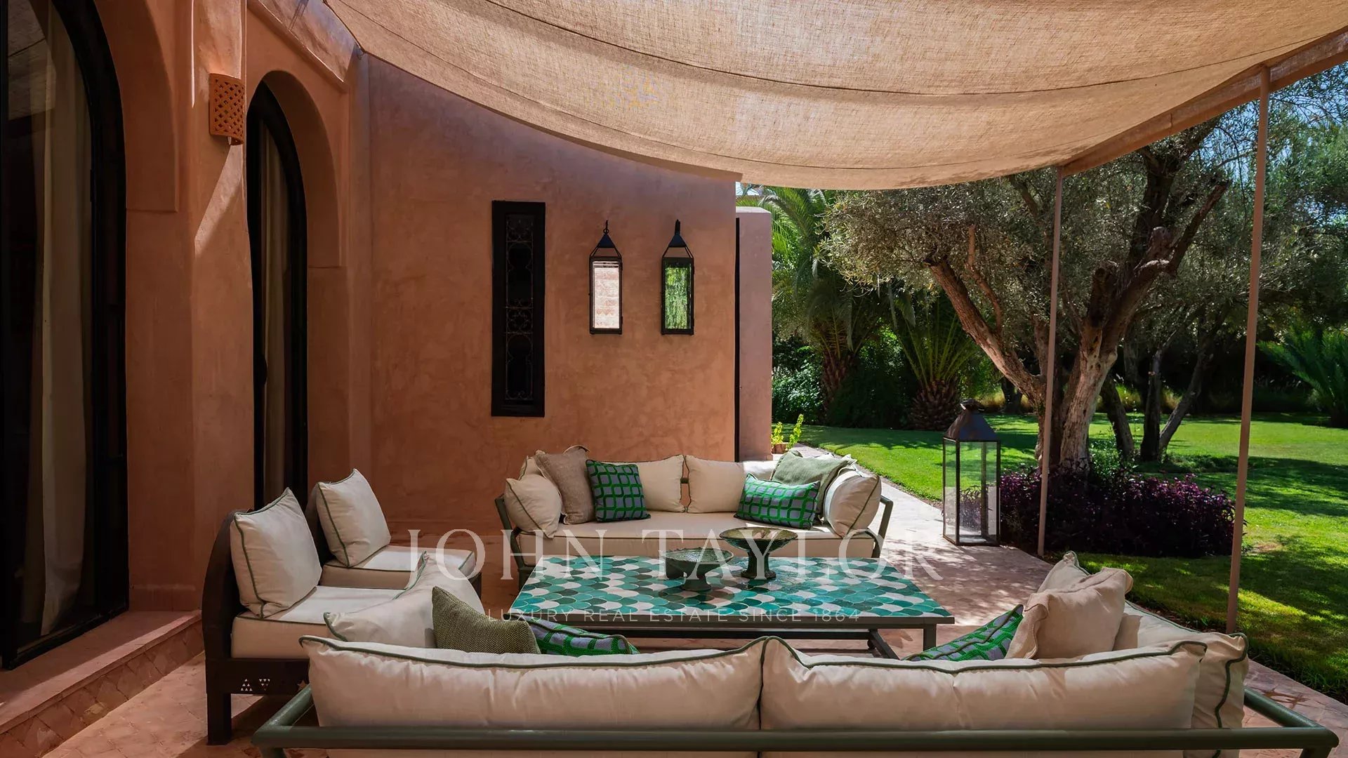 The 450 m² main villa features a beautiful entrance hall, a cosy living room with fireplace, a dining room, a TV area, a fully-equipped kitchen and 4 large suites with private terraces, a staff area, a roof terrace with fireplace and a magnificent view of the Atlas Mountains.