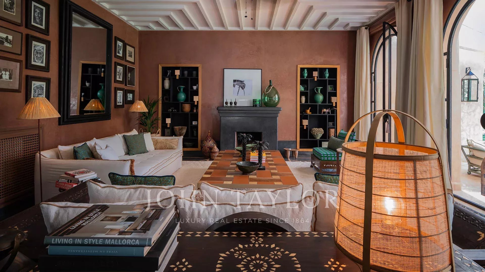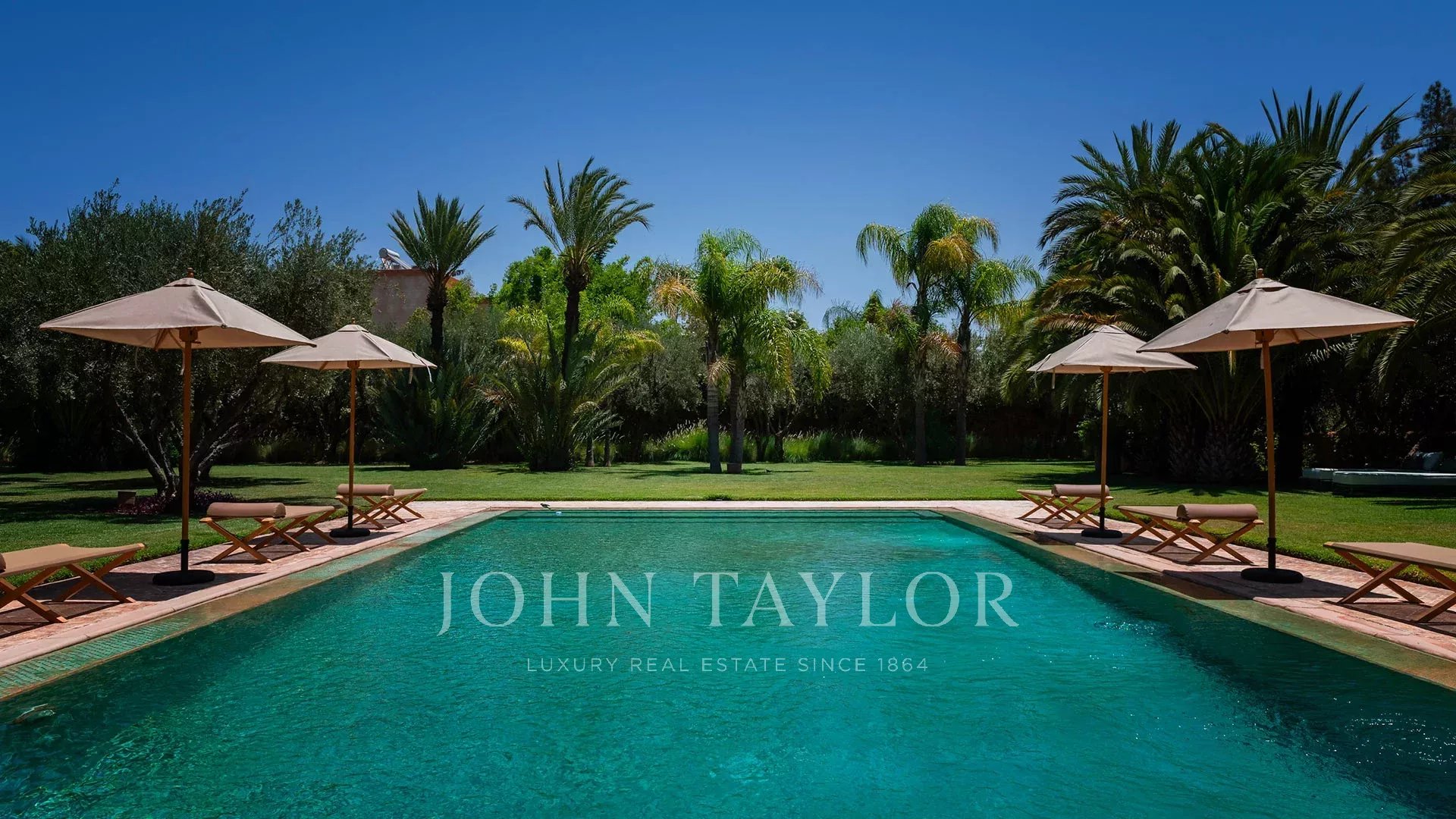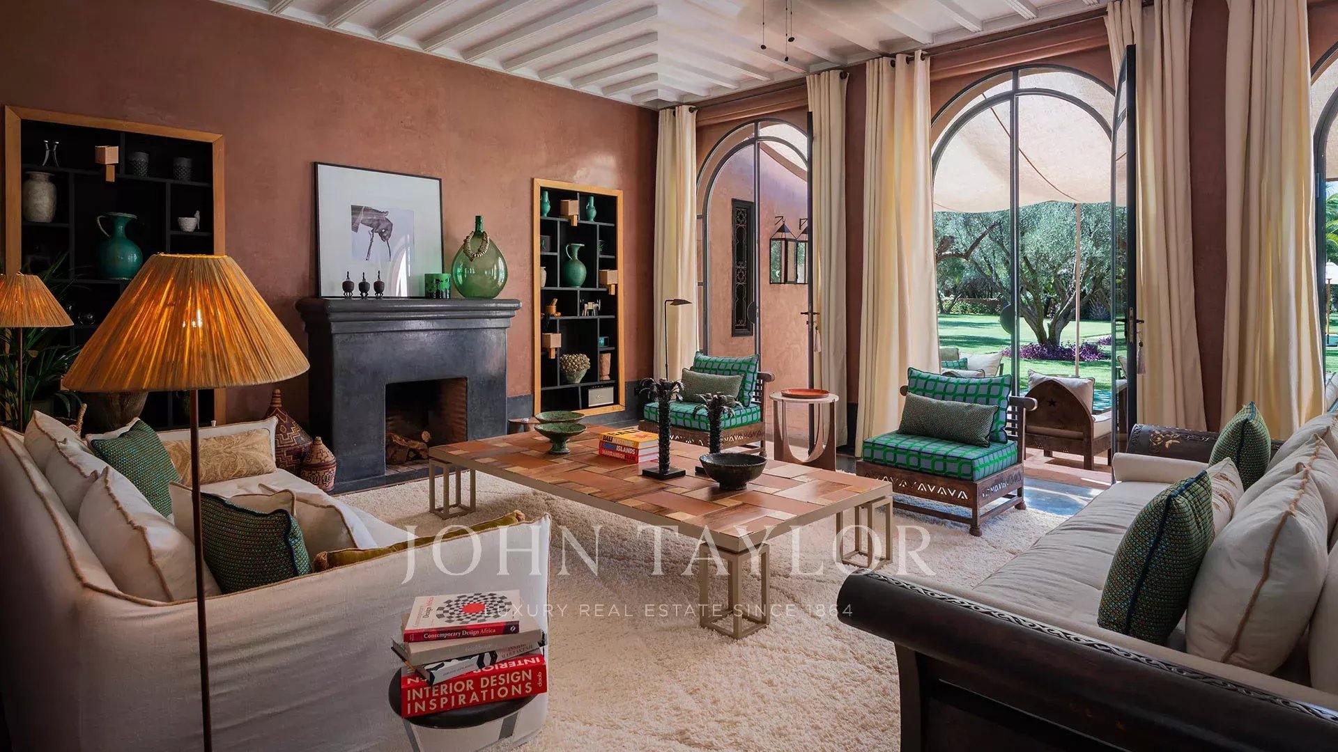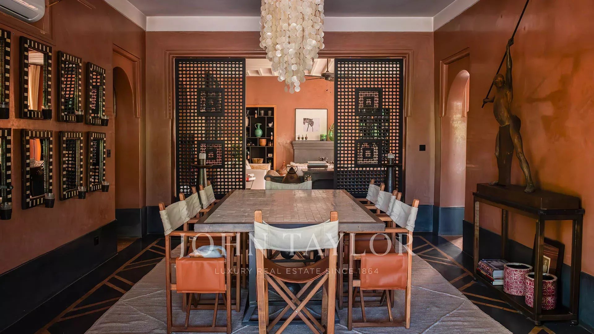 The 450 m² main villa features a beautiful entrance hall, a cosy living room with fireplace, a dining room, a TV area, a fully-equipped kitchen and 4 large suites with private terraces, a staff area, a roof terrace with fireplace and a magnificent view of the Atlas Mountains.