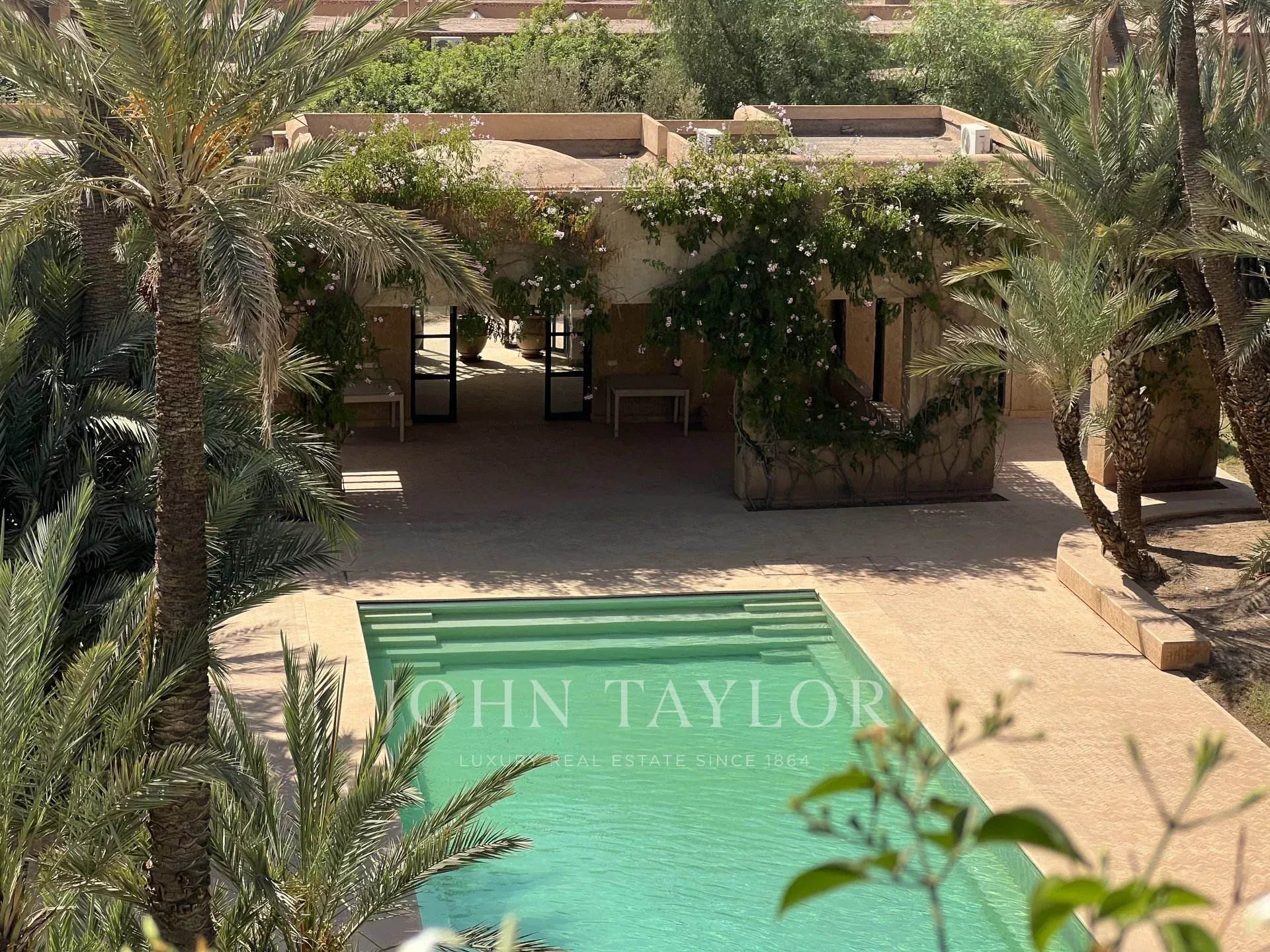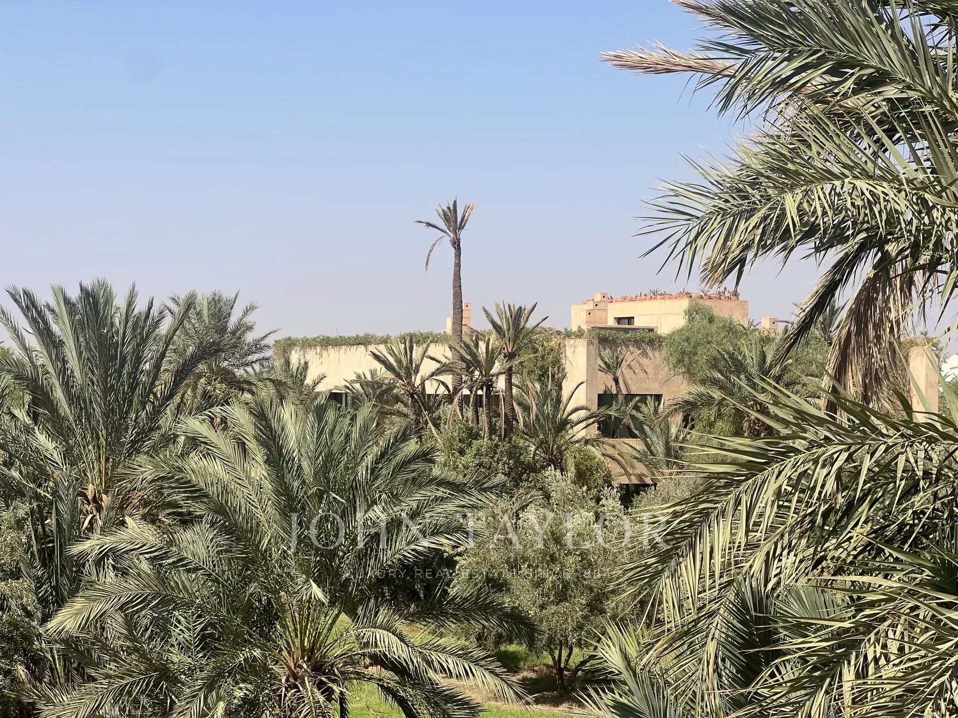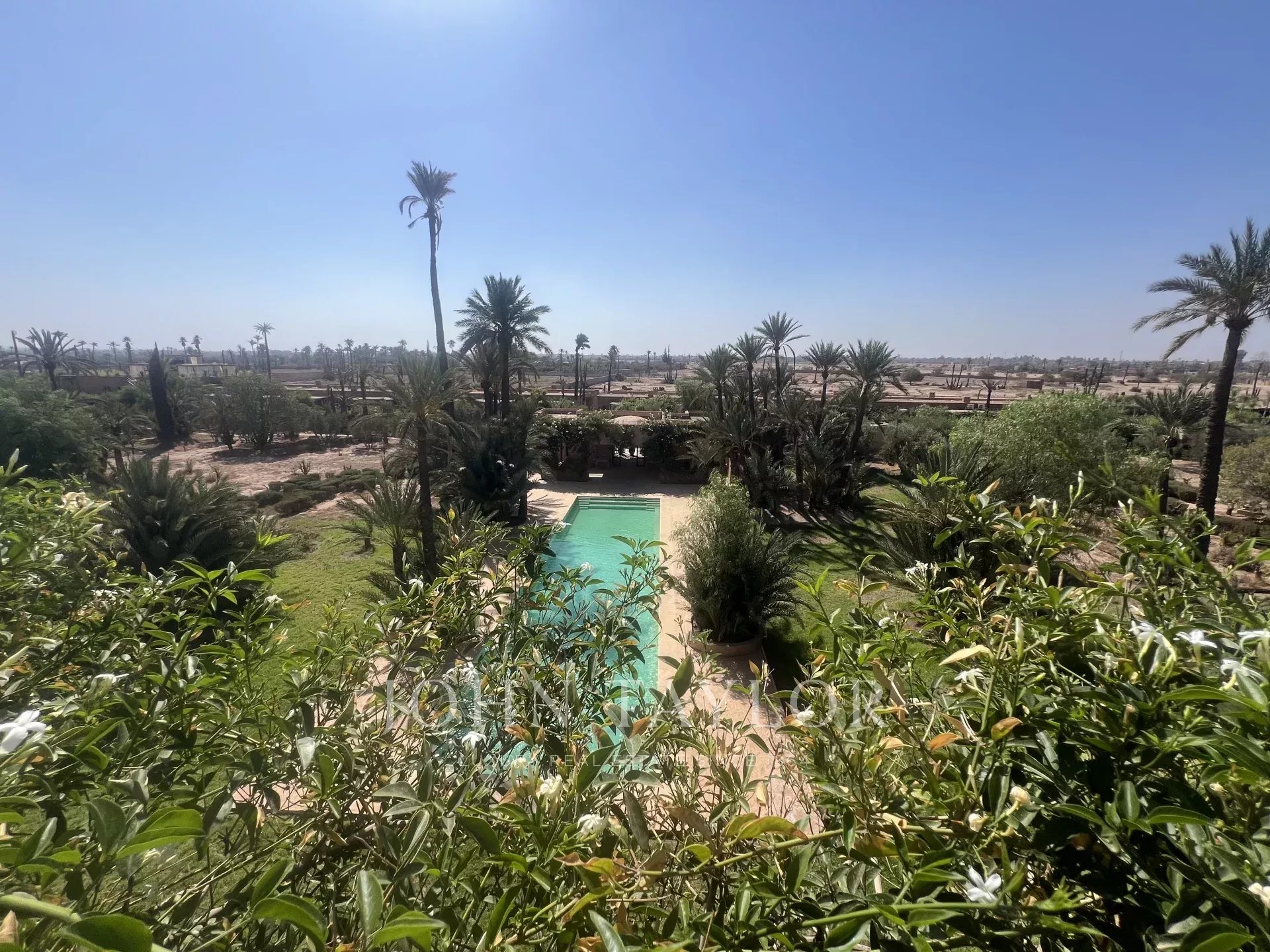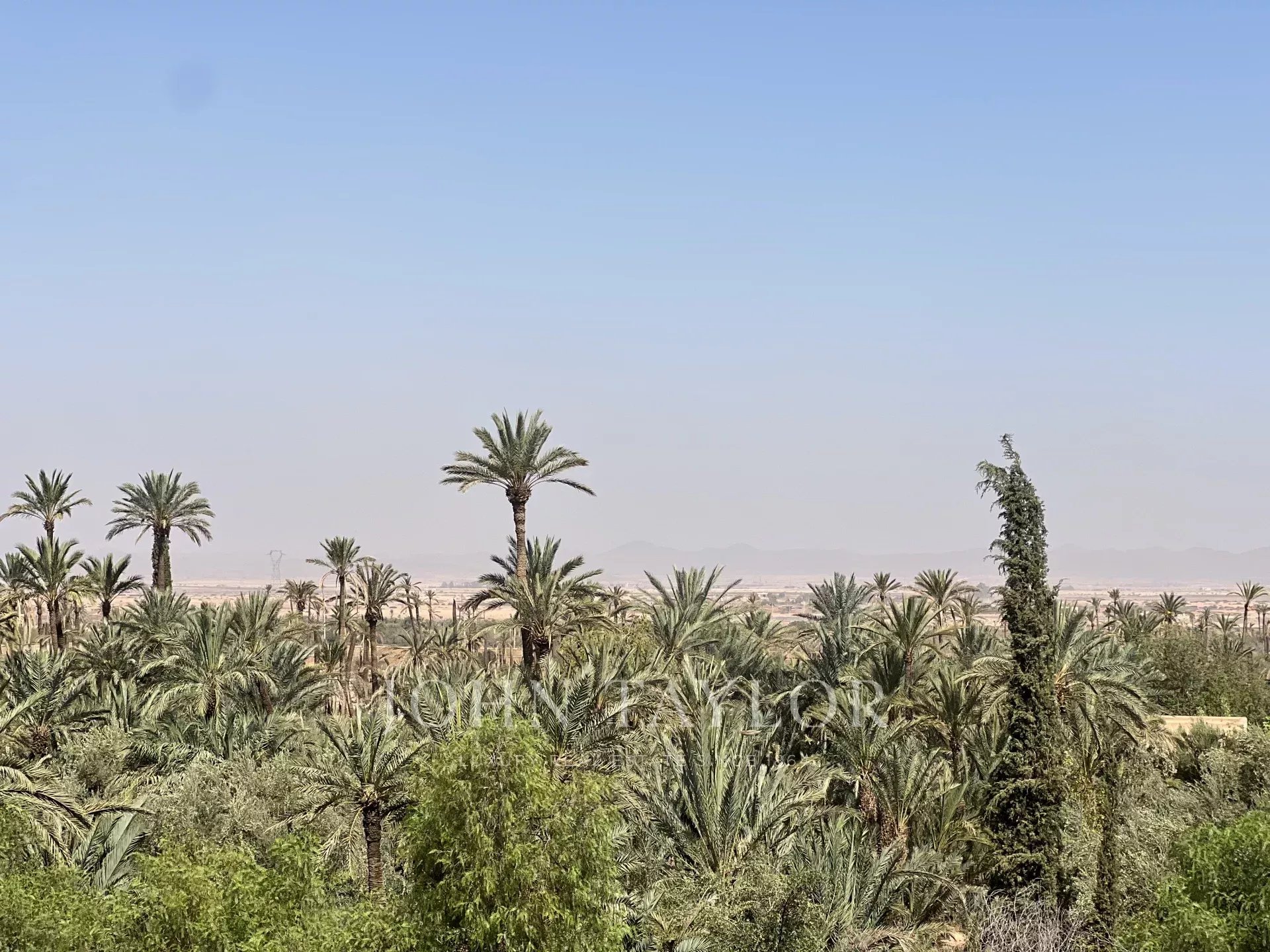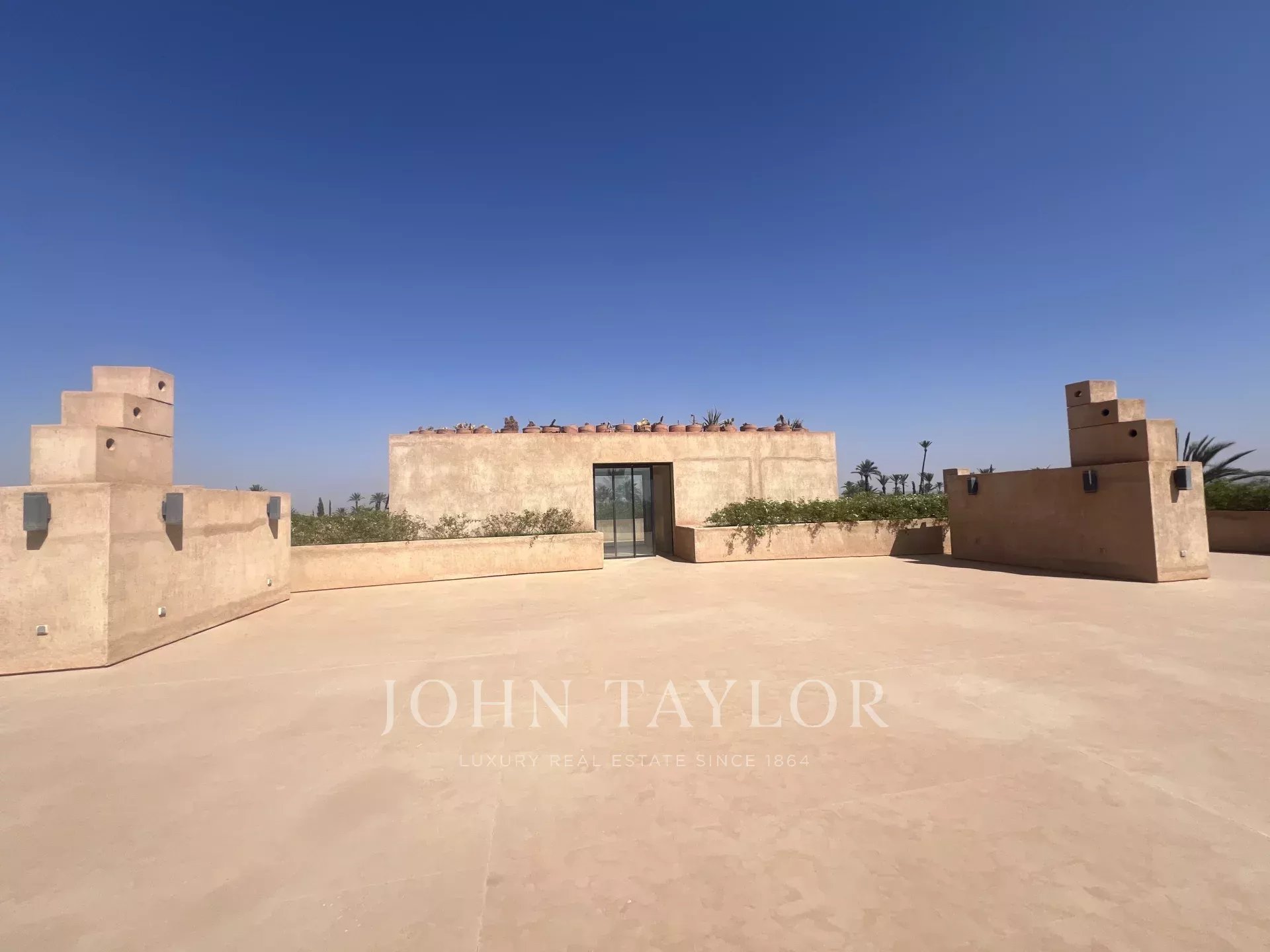 Very large roof terrace with 360-degree views of the Atlas Mountains and surrounding palm grove.