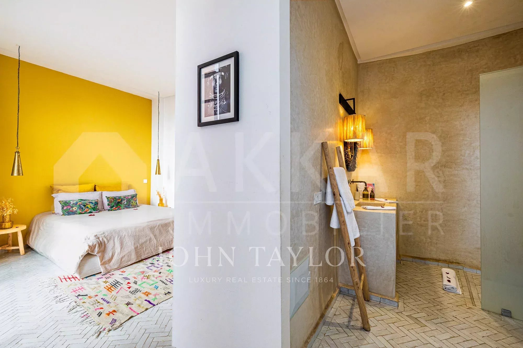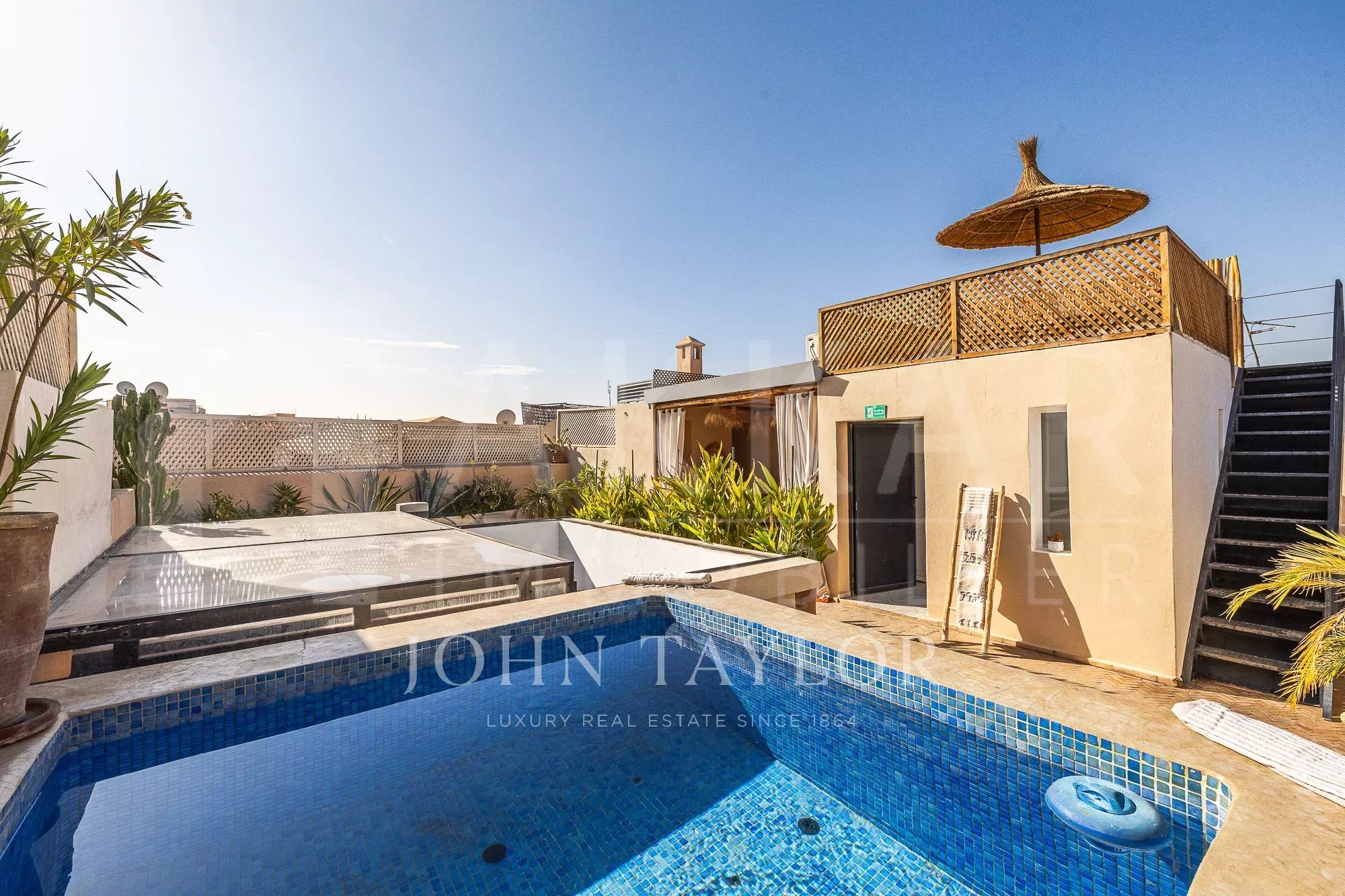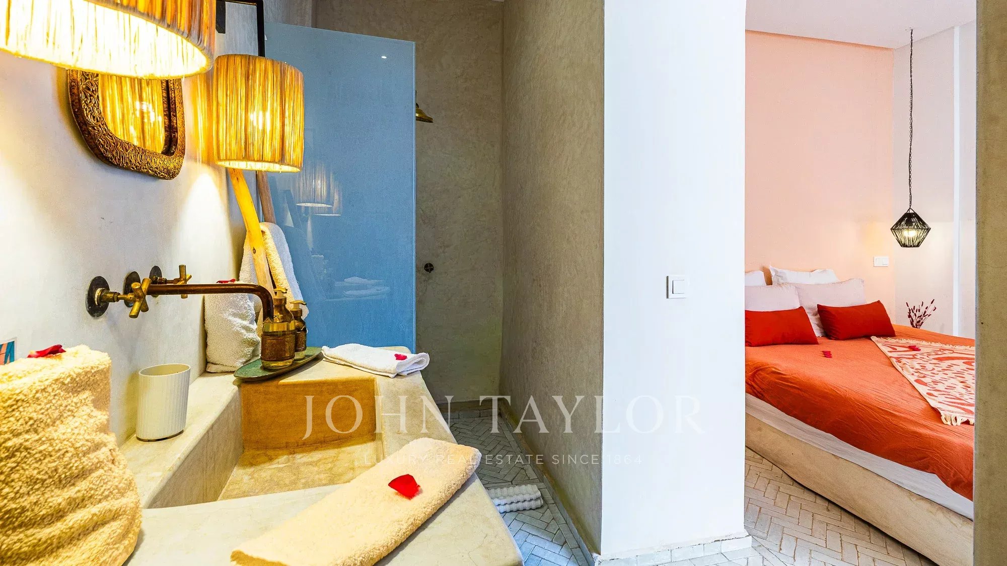 The upper floor features a lovely roof-terrace hosting a shaded dining with fireplace, an outdoor shower and a plunge-pool. Noteworthy: an upper platform delights with panoramic views over the surrounding Medina and the Atlas mountains.