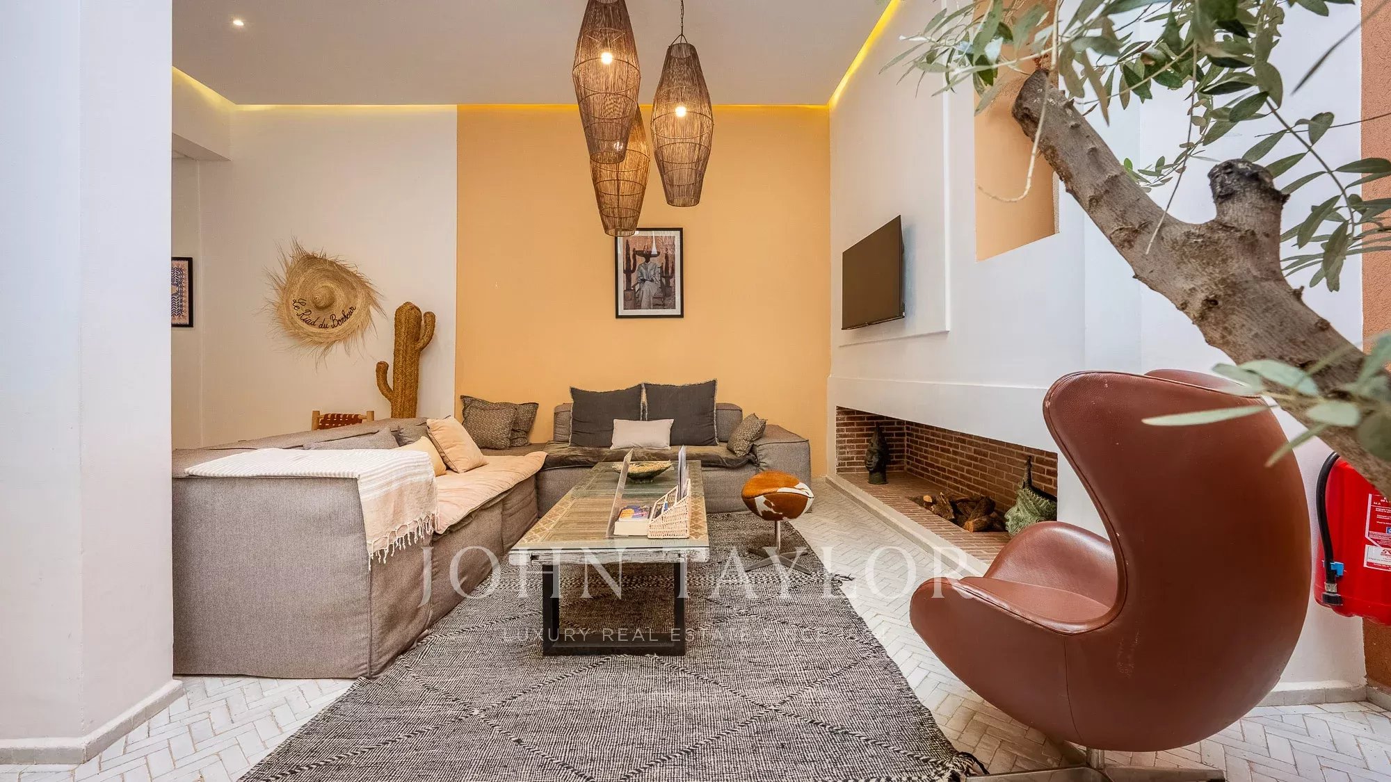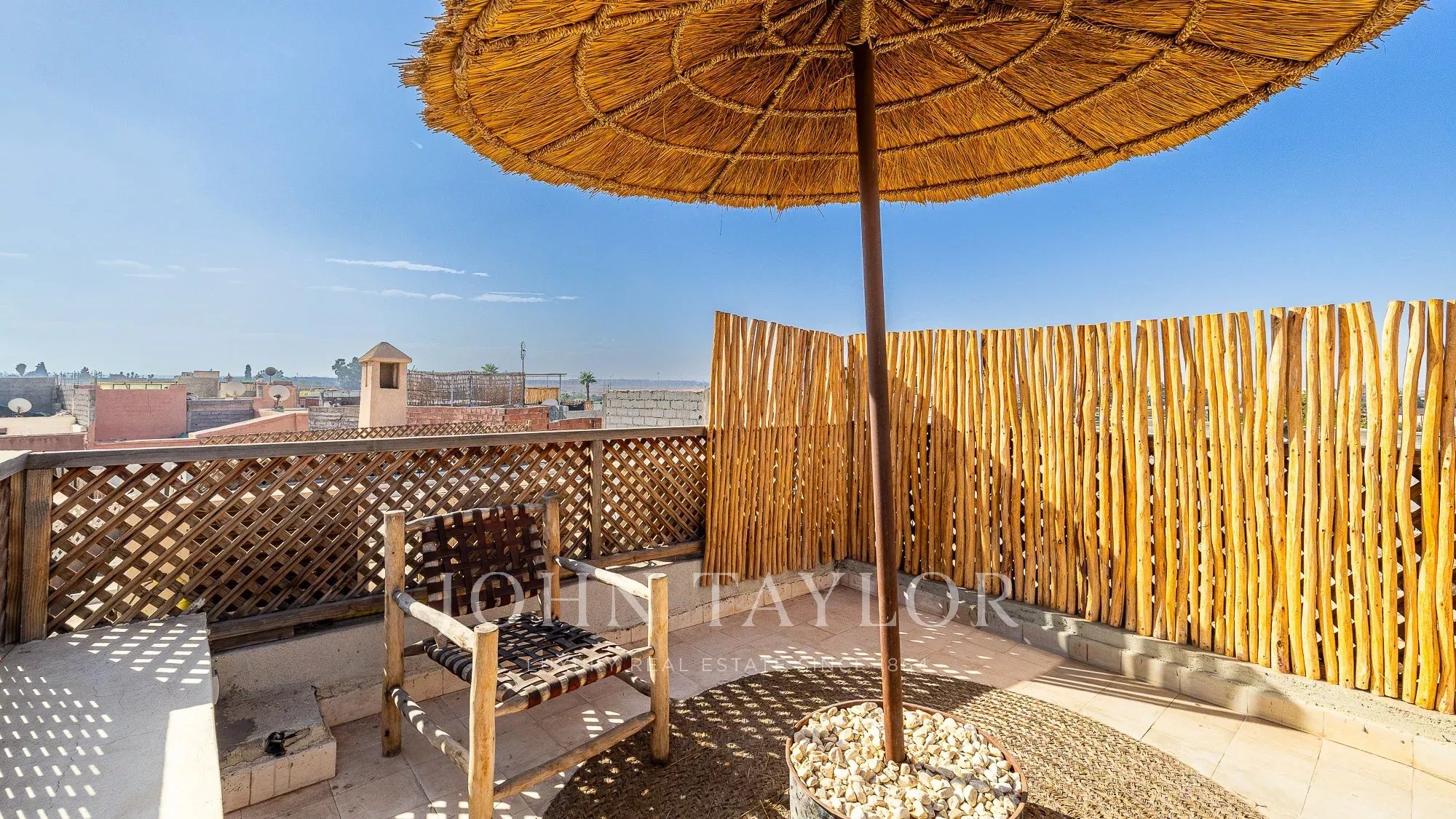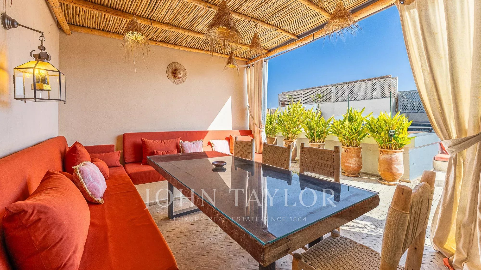 The upper floor features a lovely roof-terrace hosting a shaded dining with fireplace, an outdoor shower and a plunge-pool. Noteworthy: an upper platform delights with panoramic views over the surrounding Medina and the Atlas mountains.