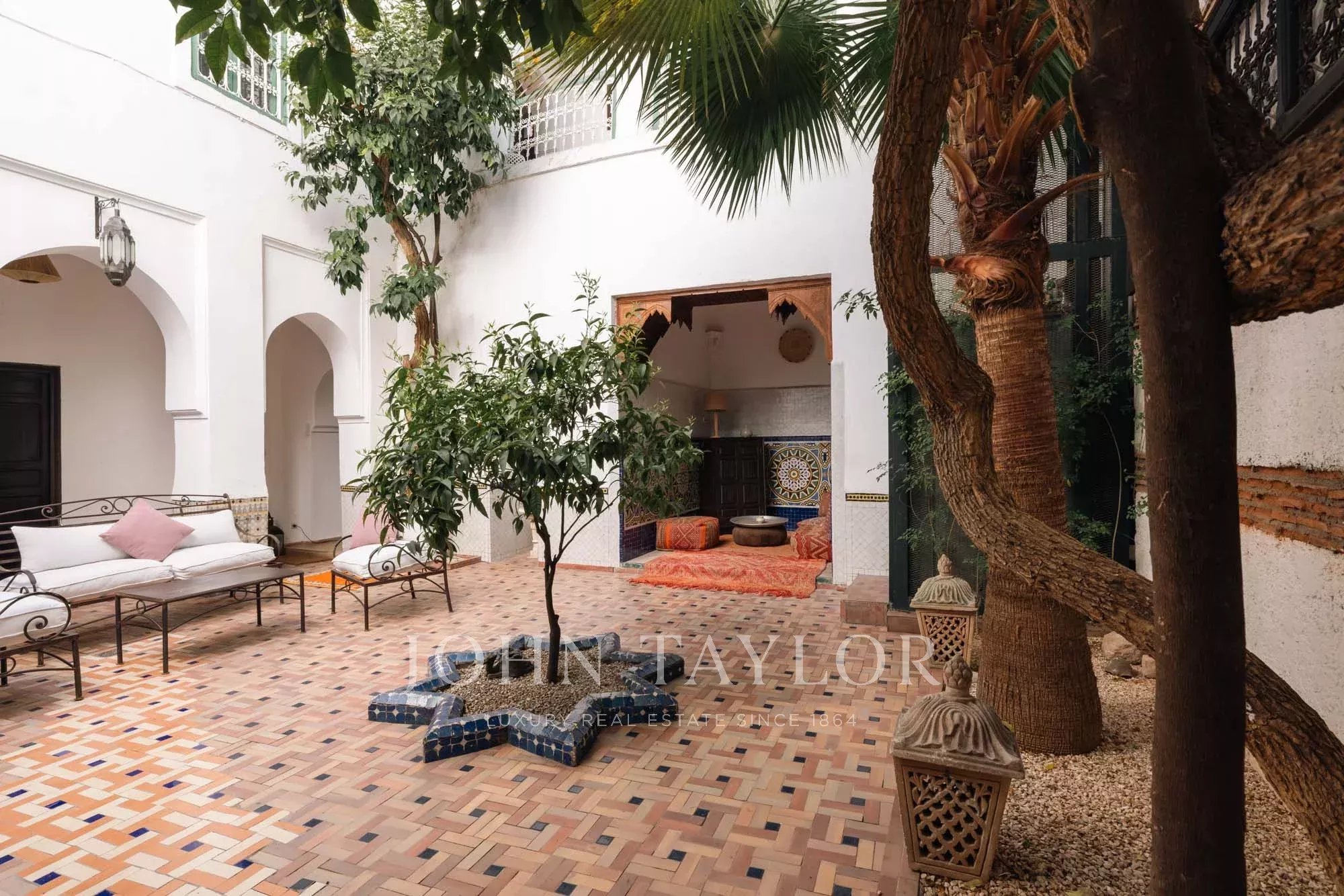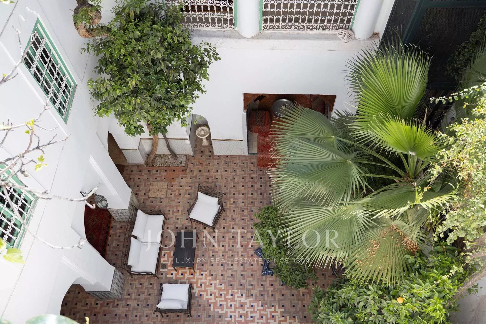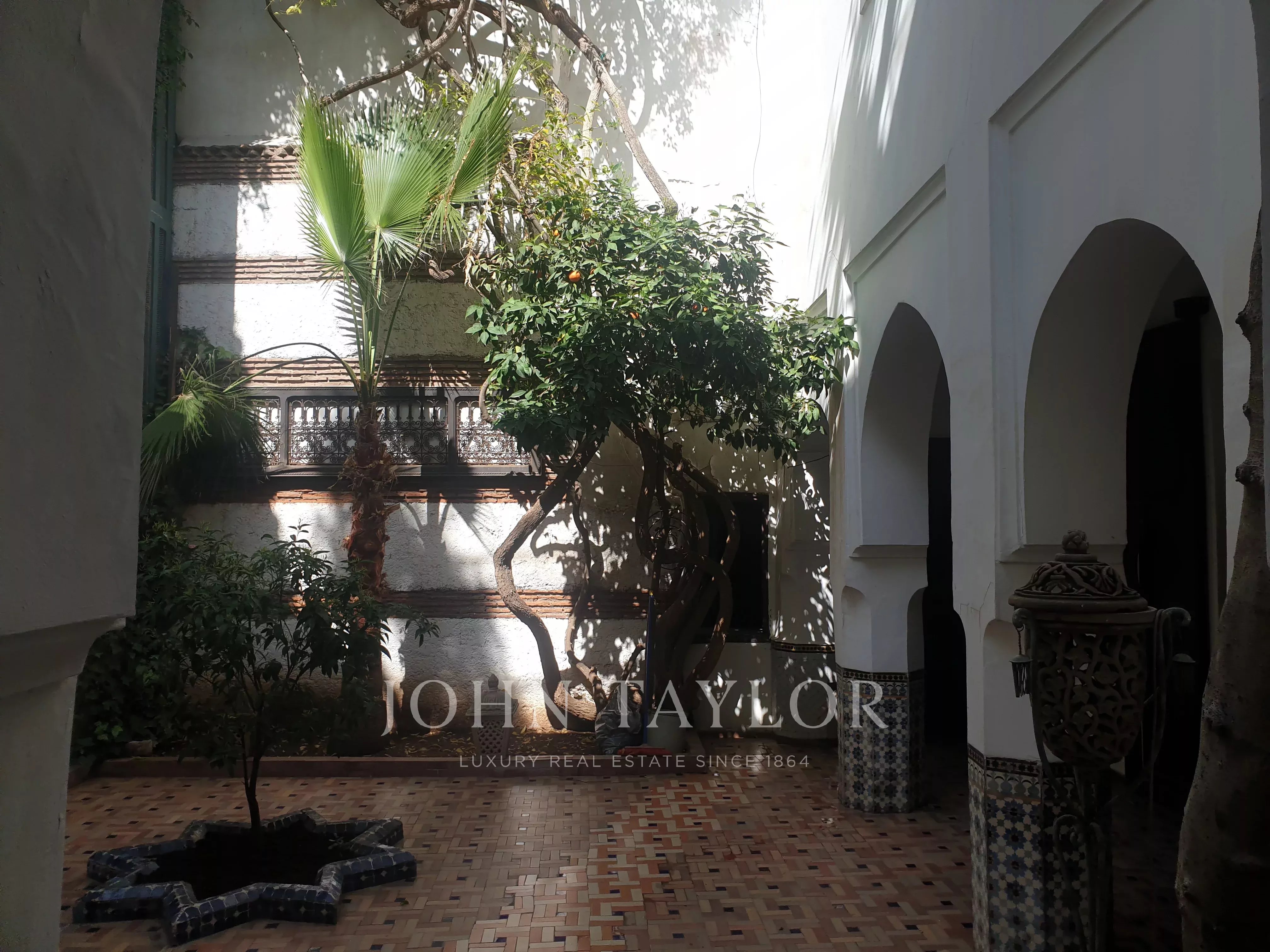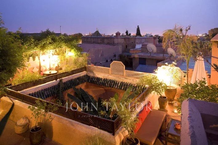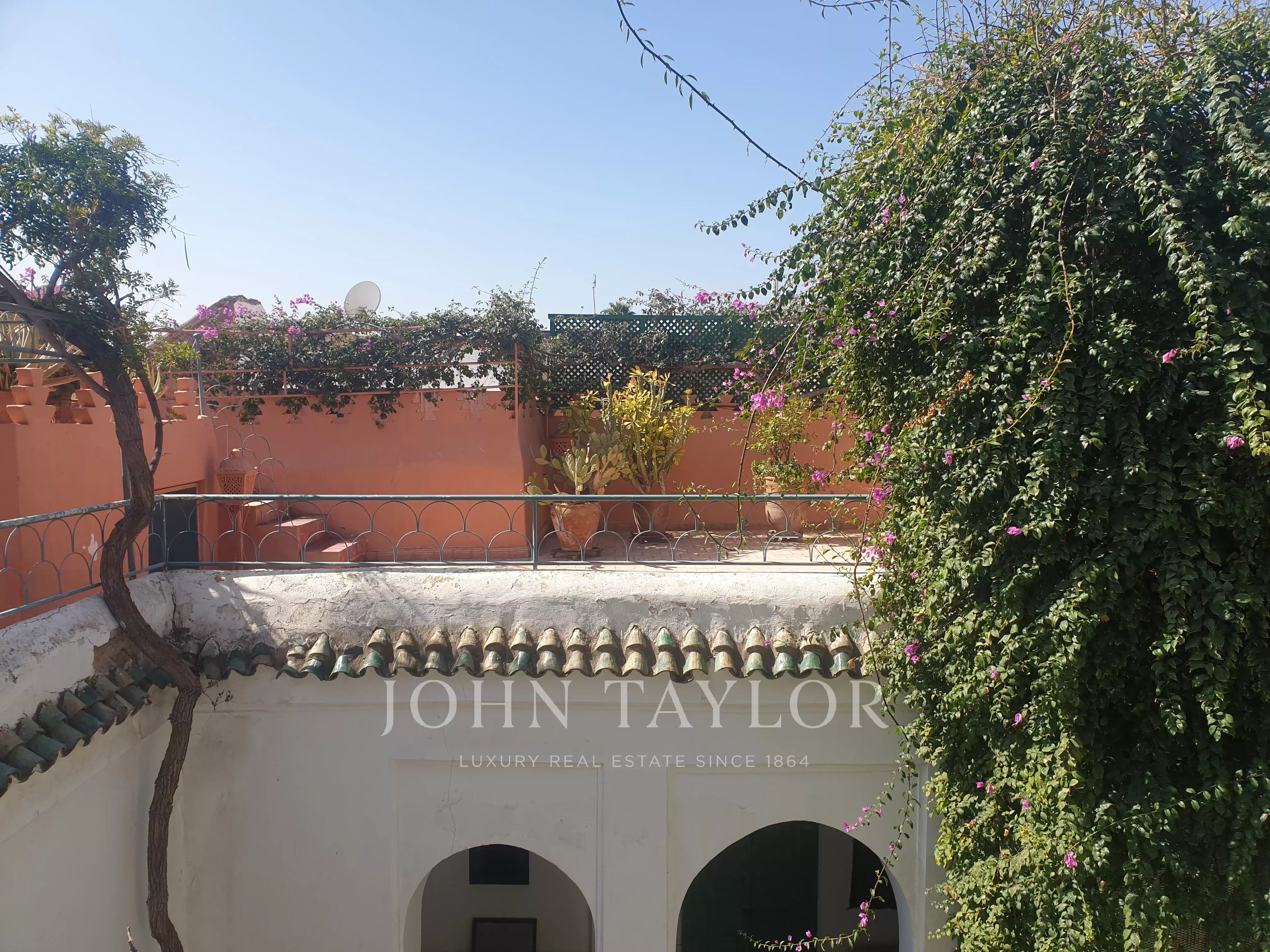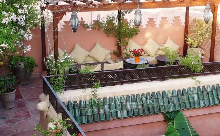 It combines 2 adjacent titled Riad with common entrance and connecting roof-terraces: