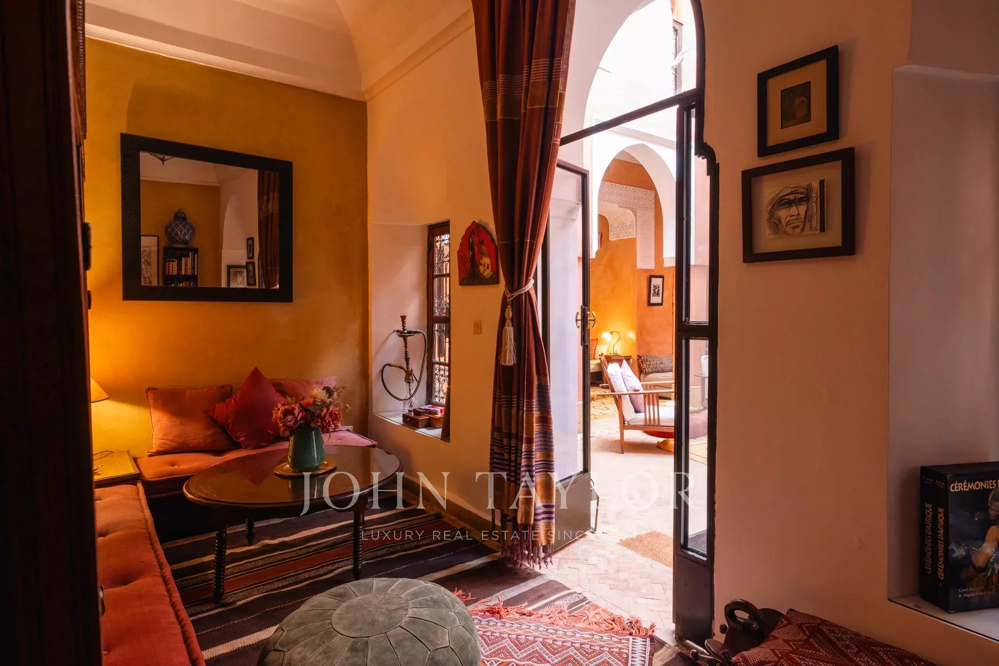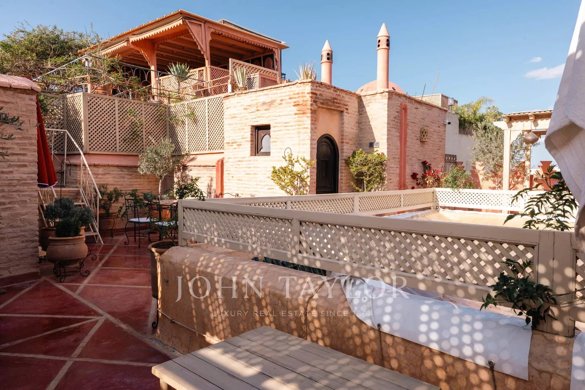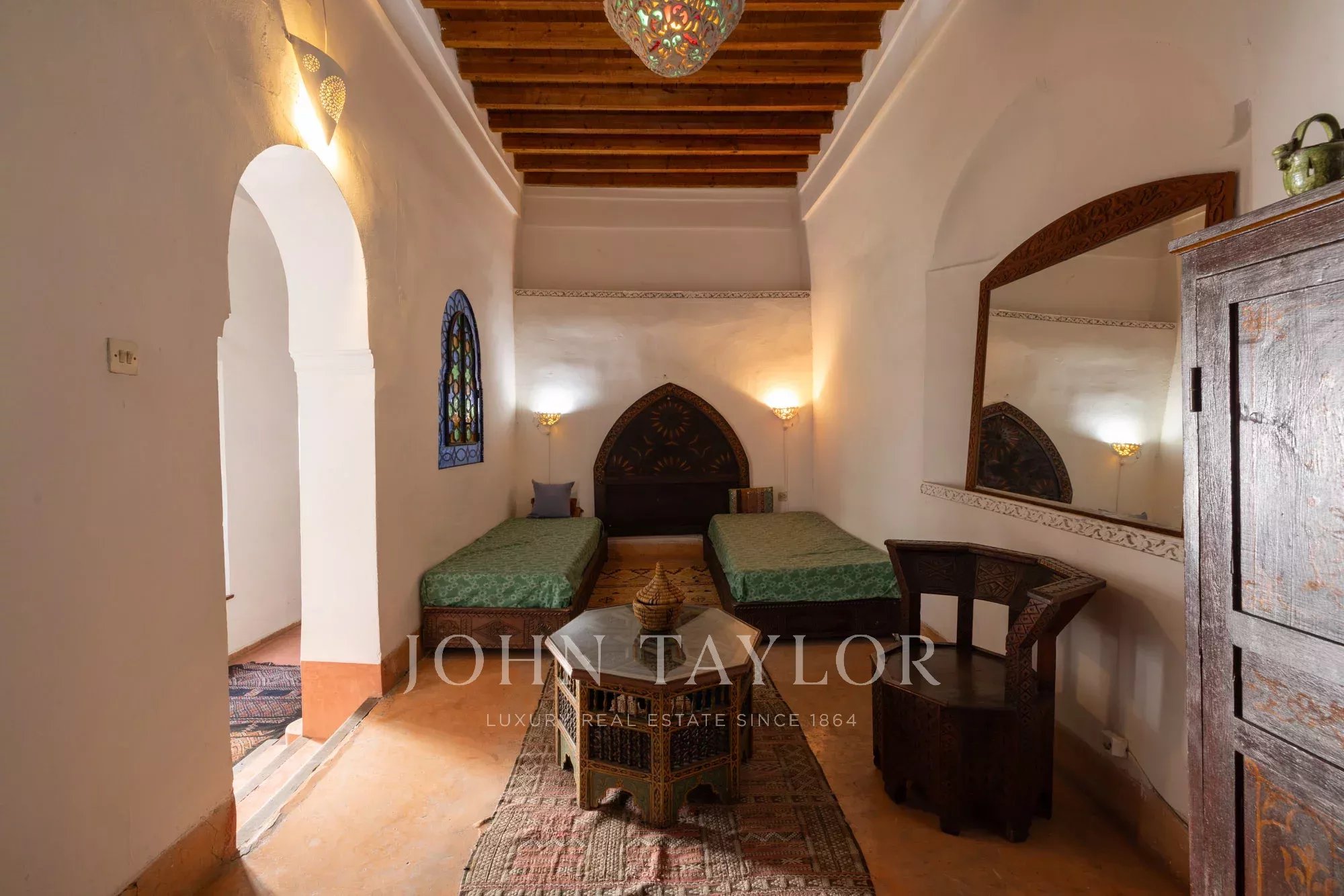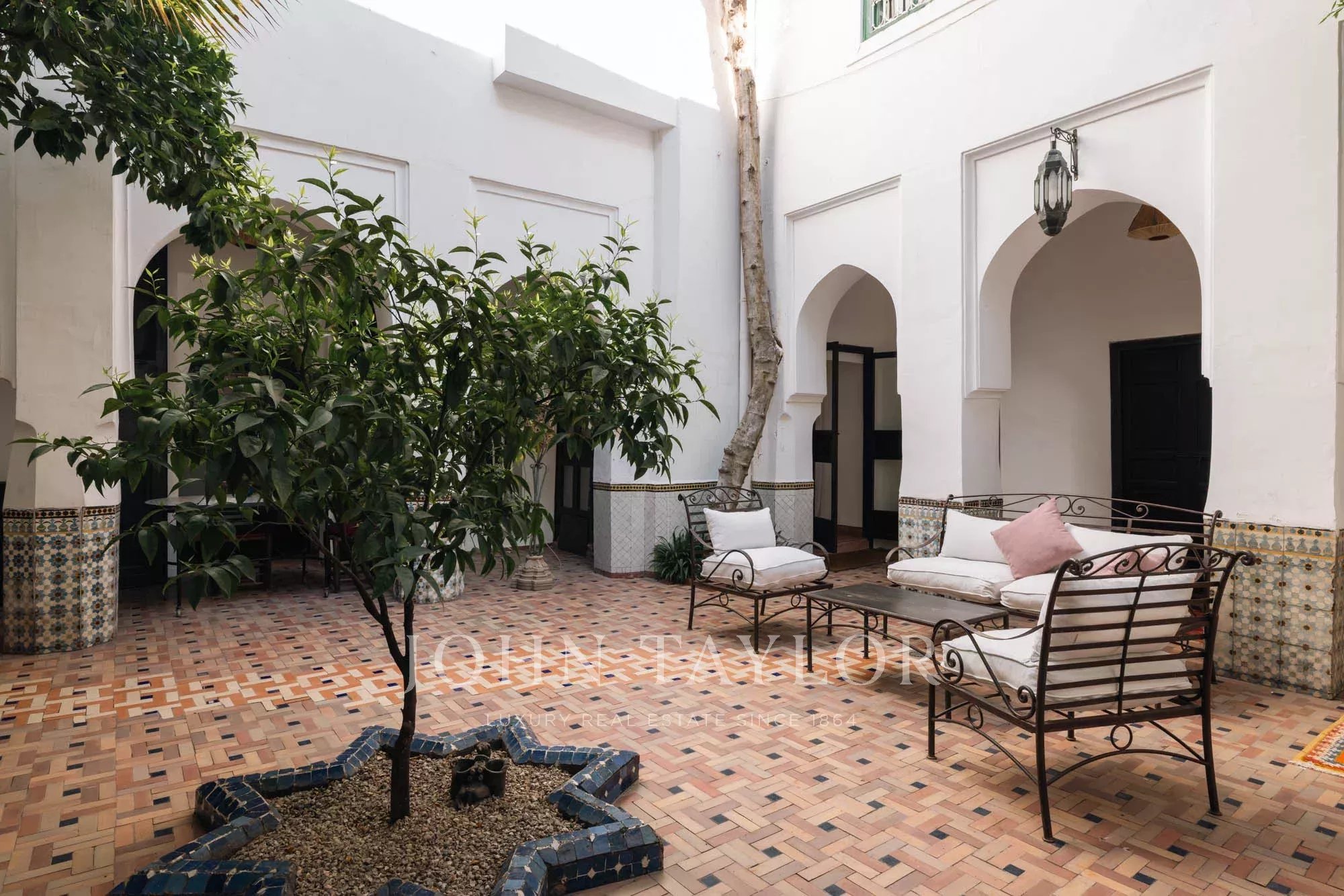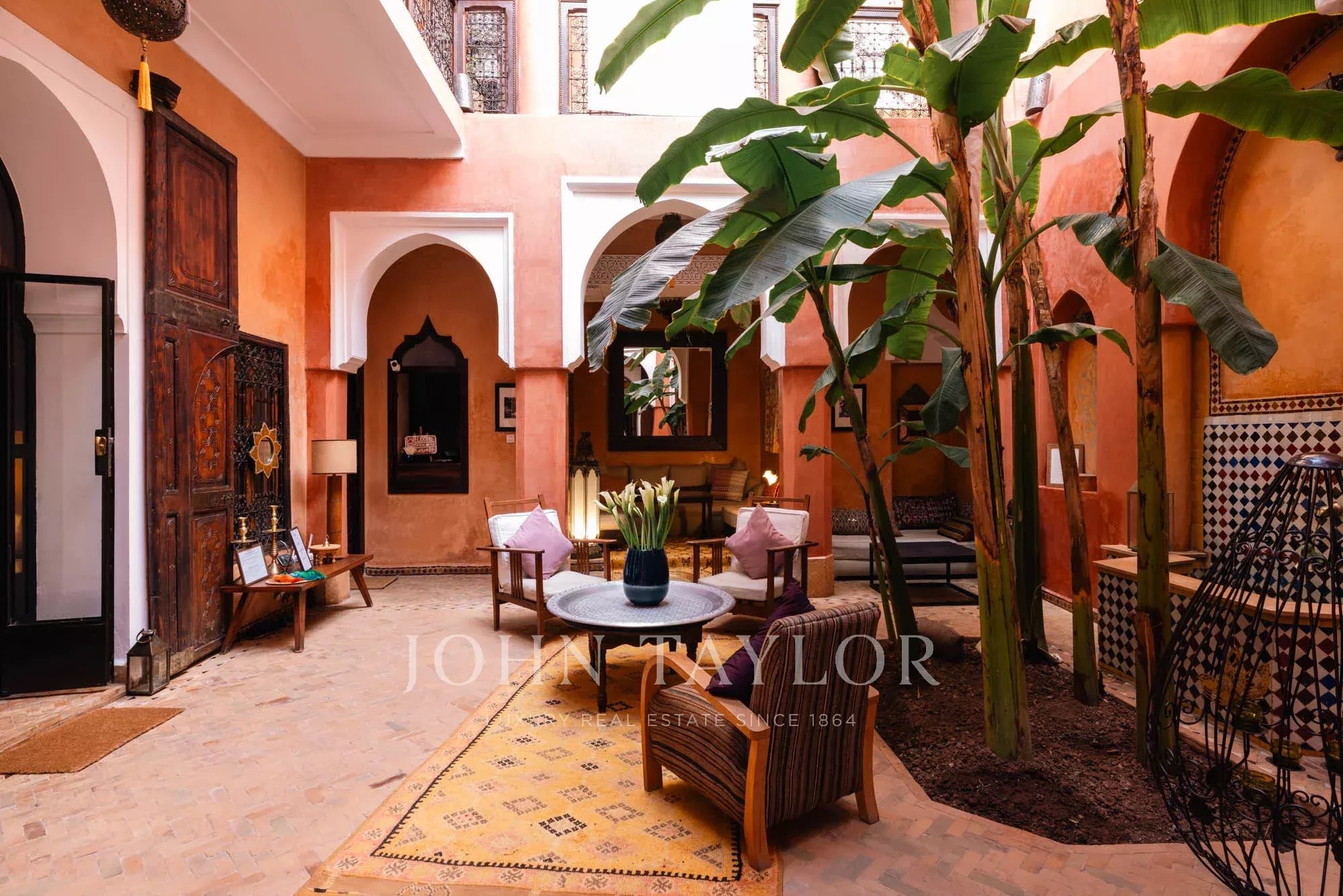 It combines 2 adjacent titled Riad with common entrance and connecting roof-terraces: