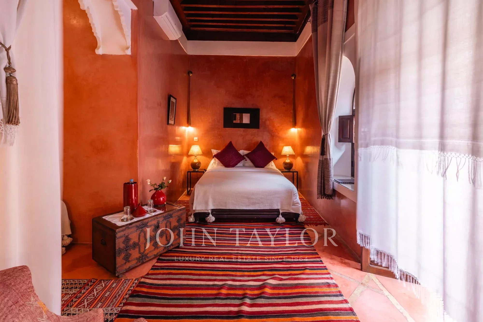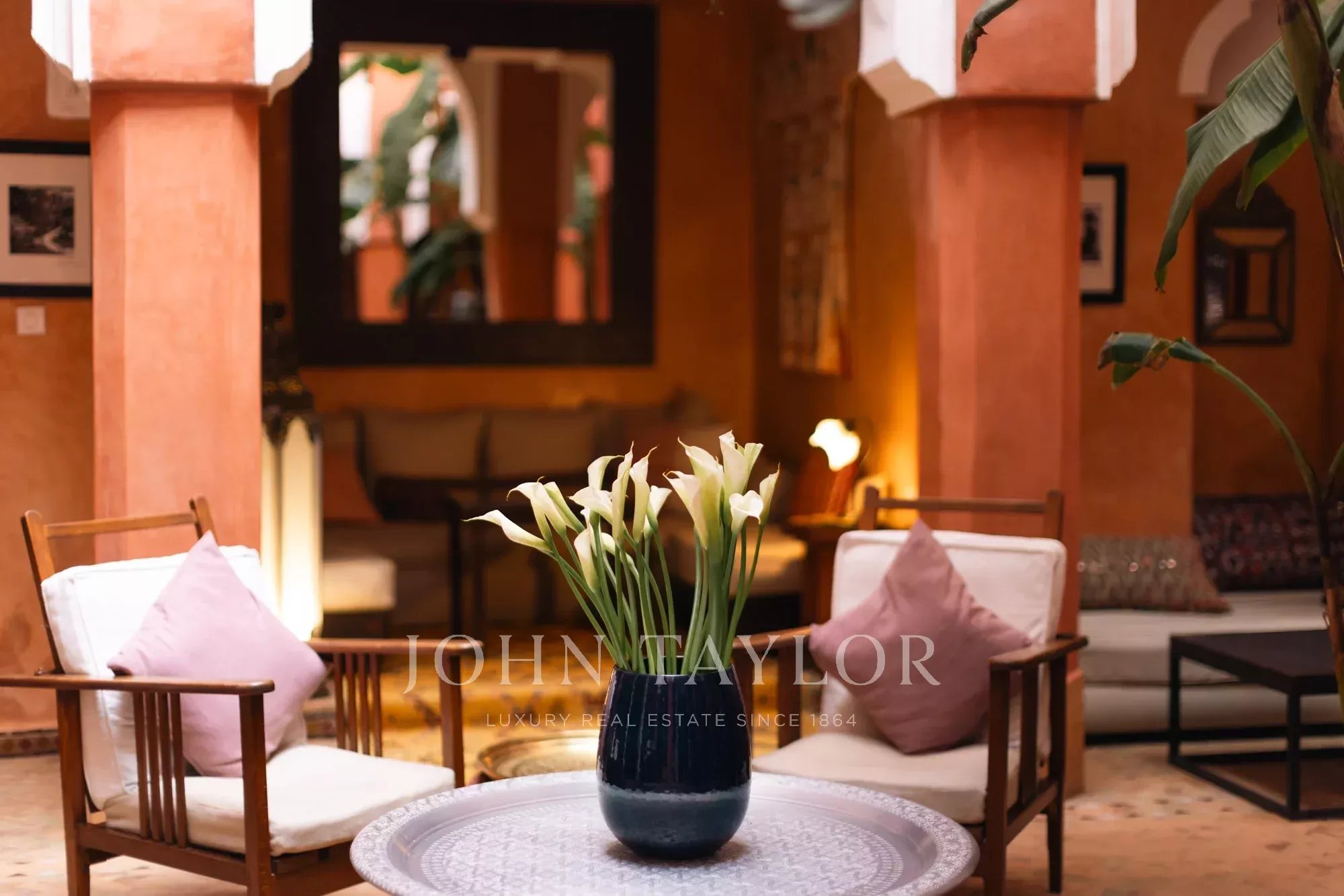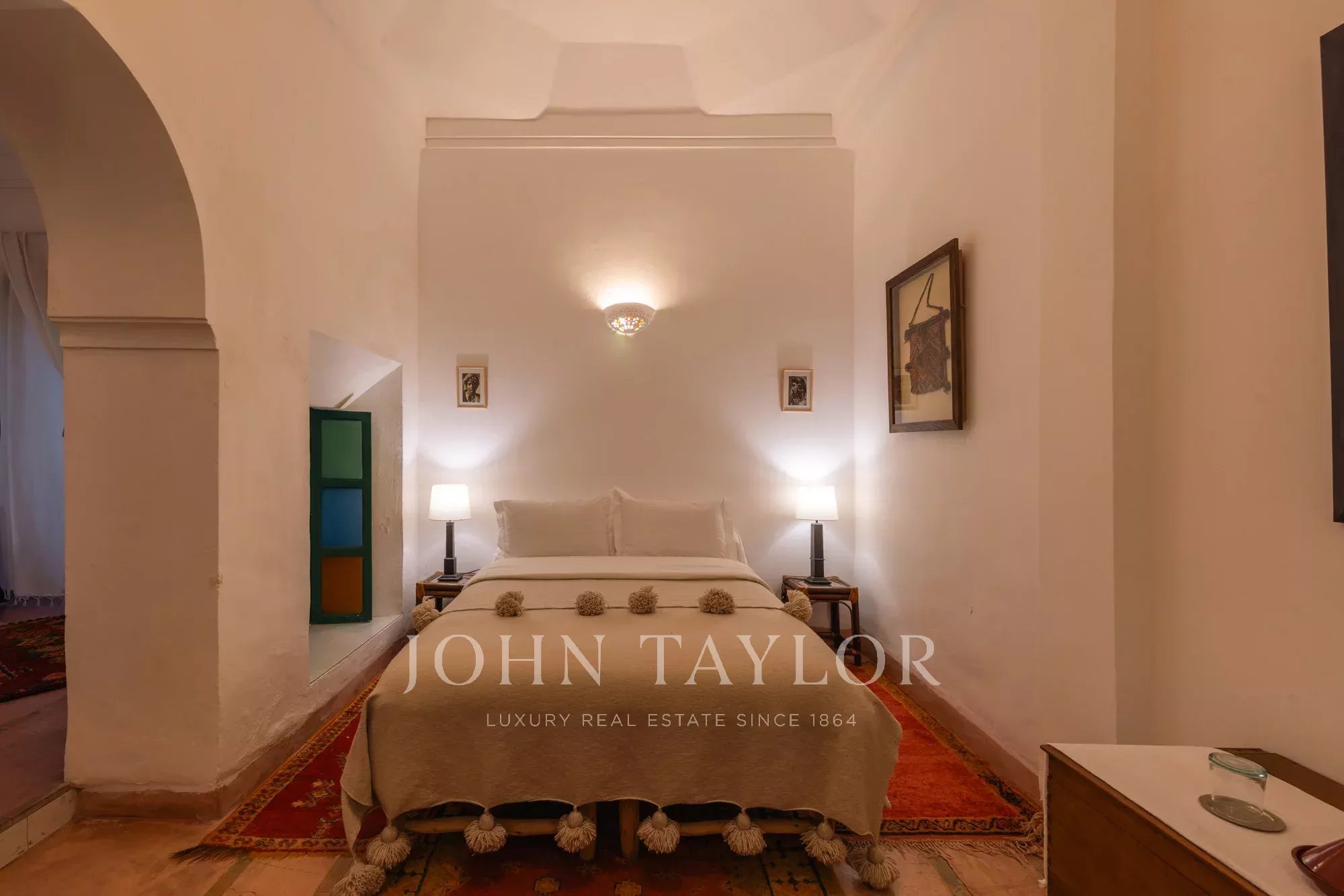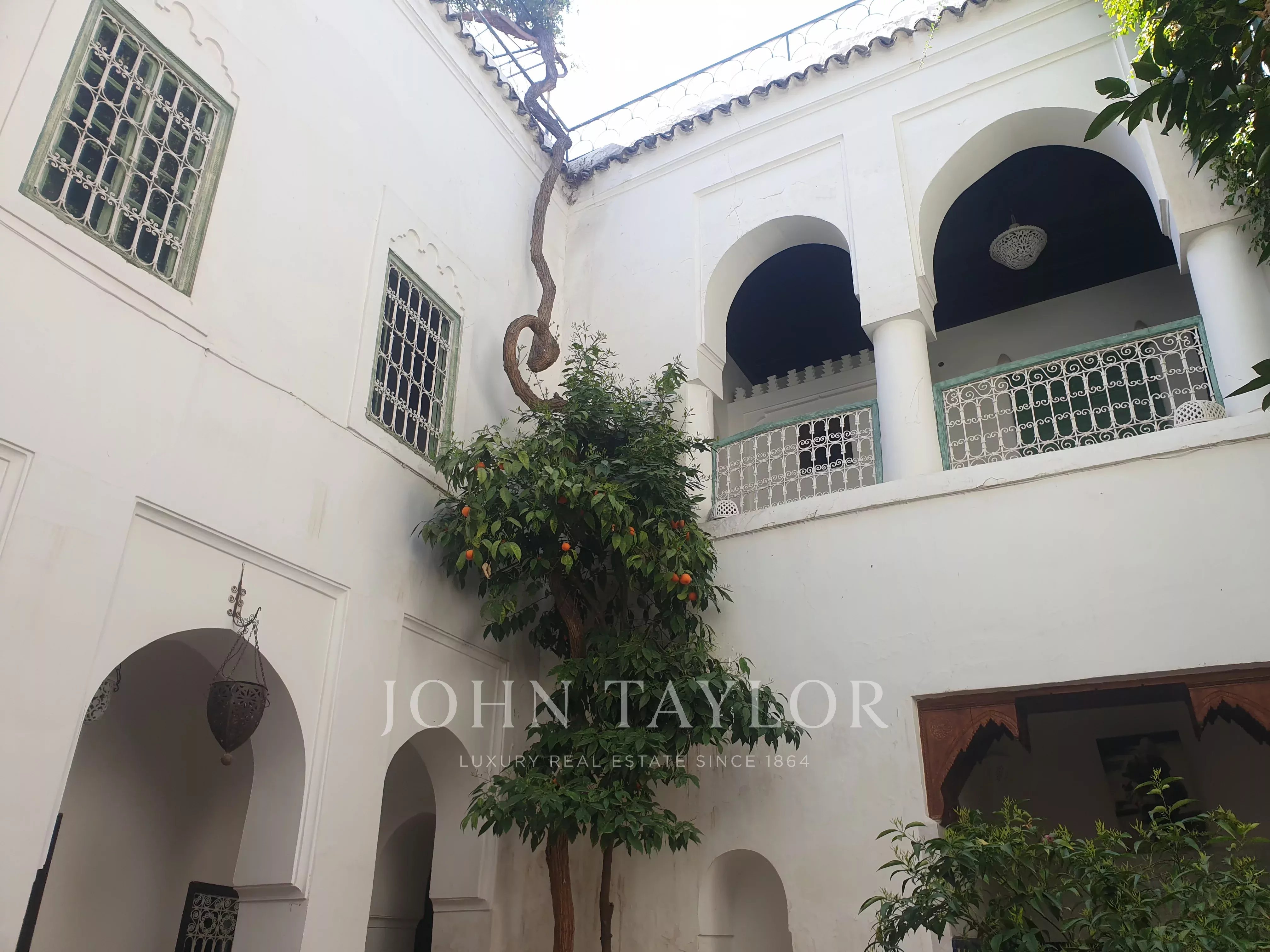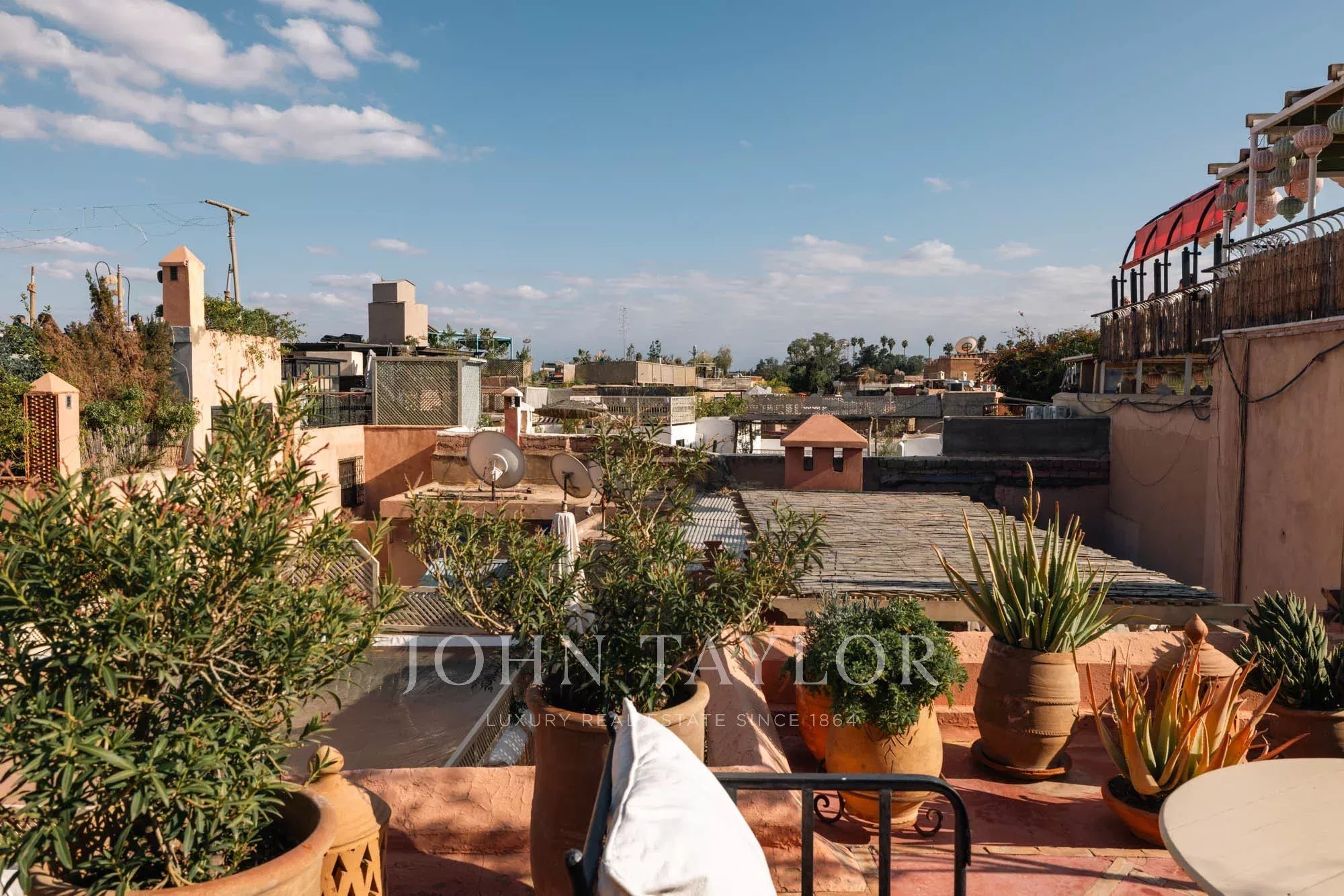 It combines 2 adjacent titled Riad with common entrance and connecting roof-terraces:
