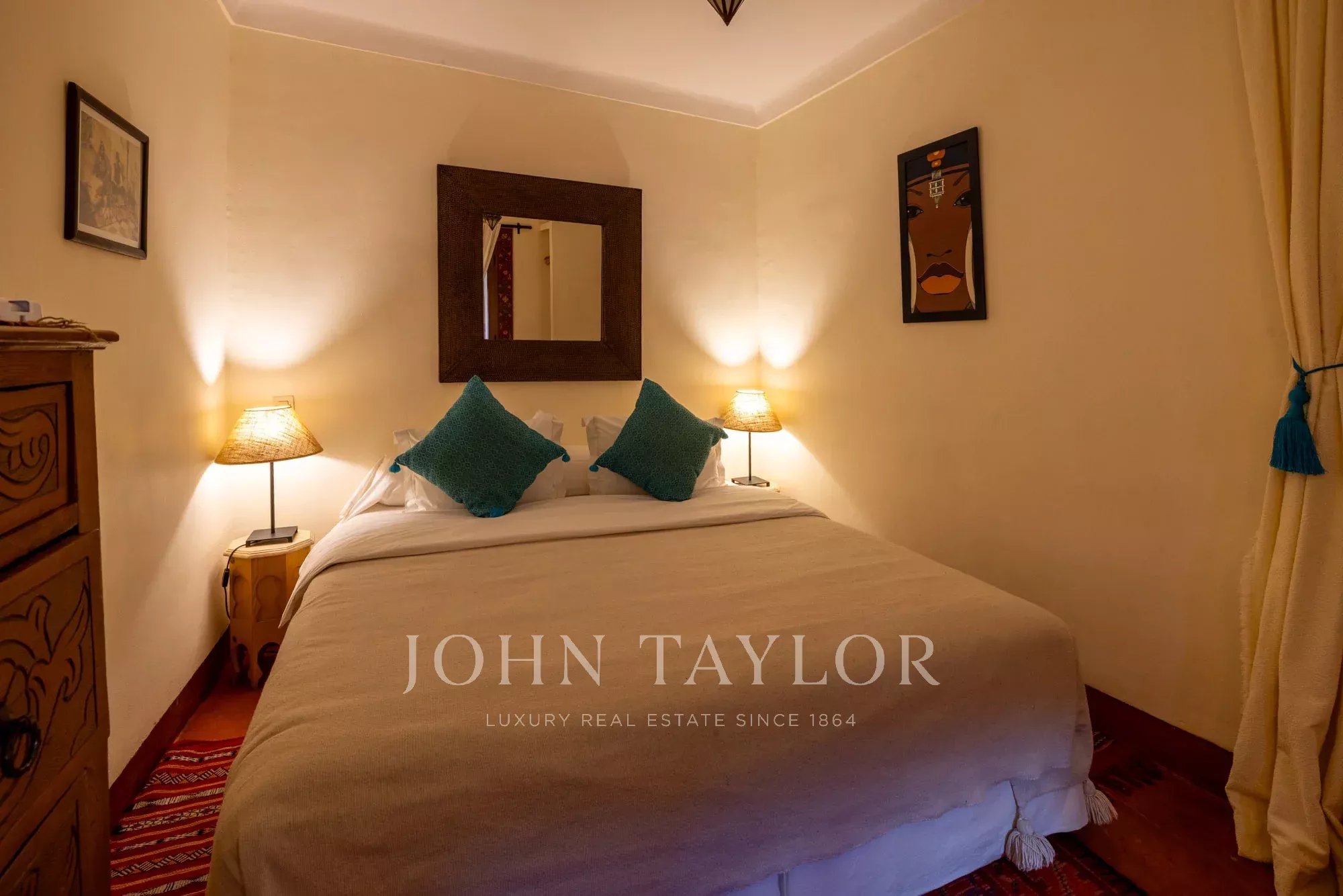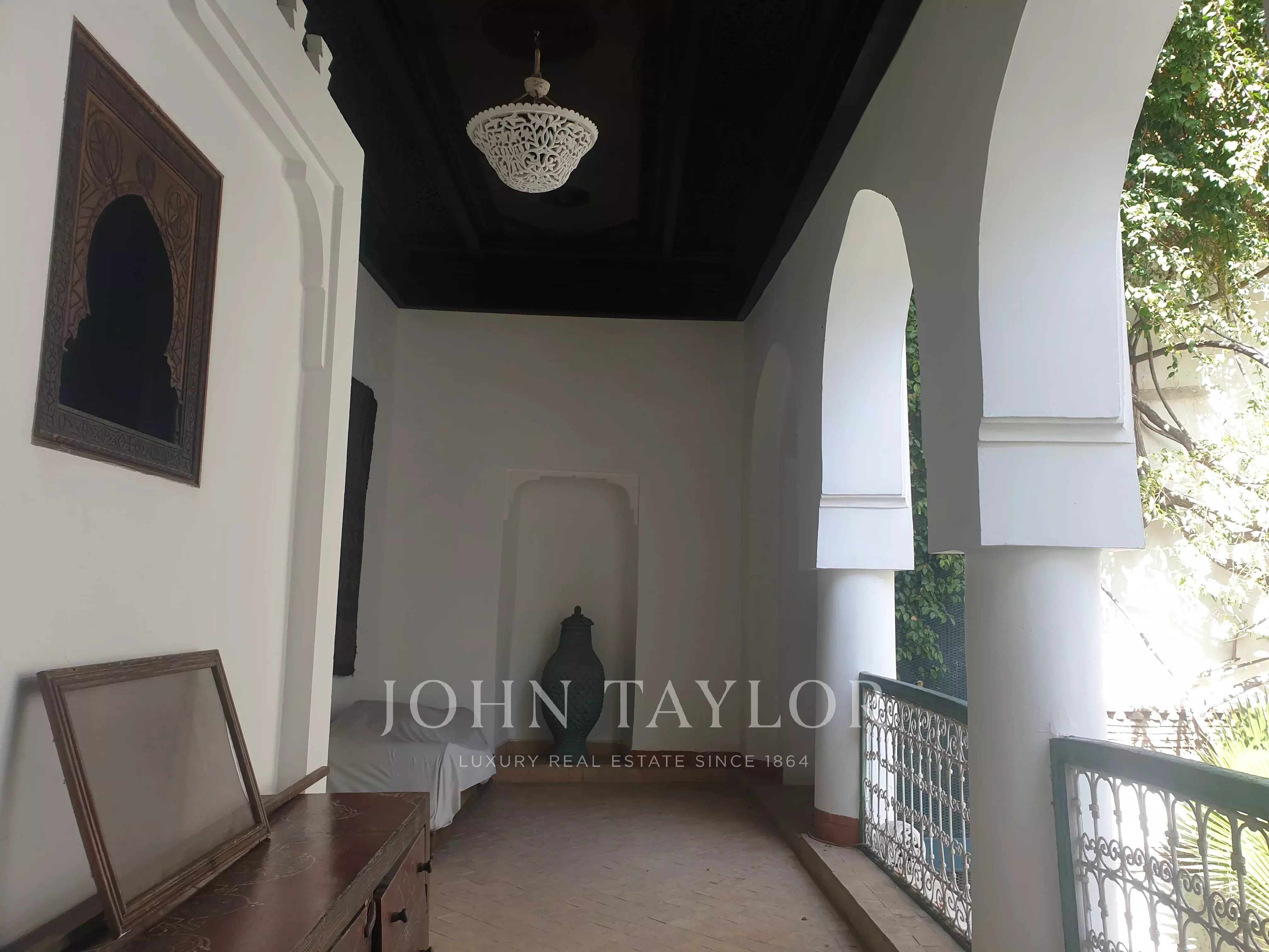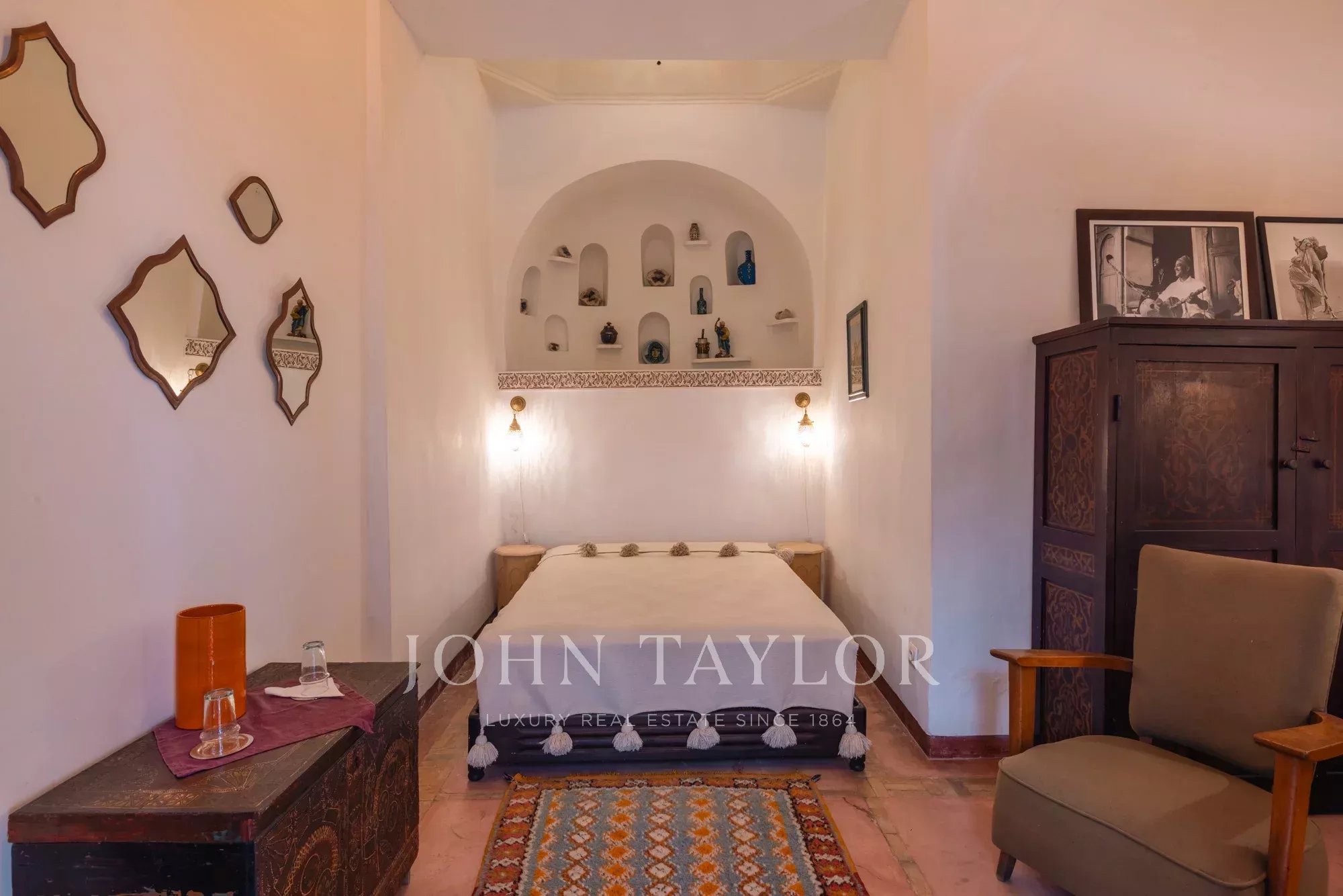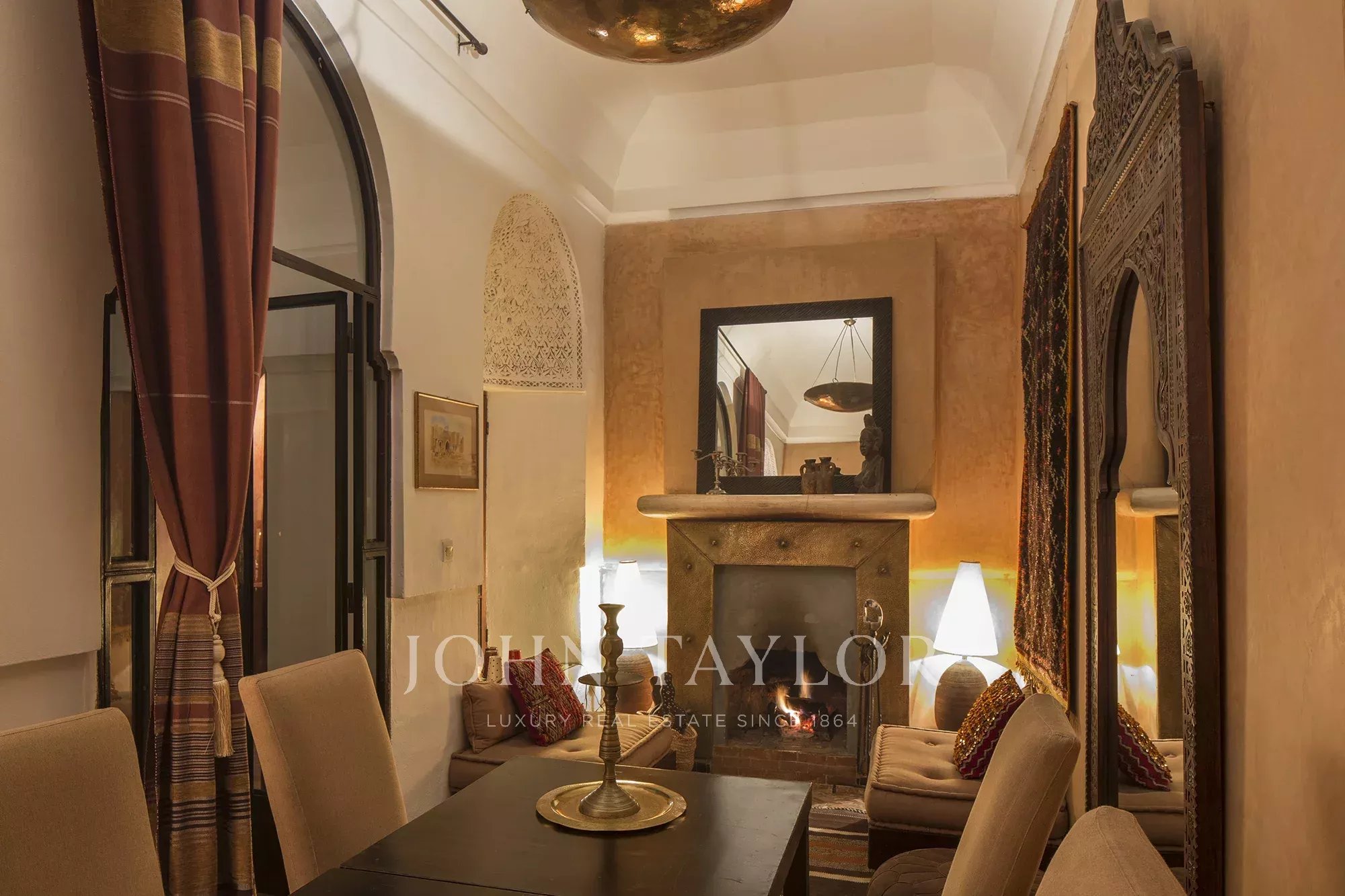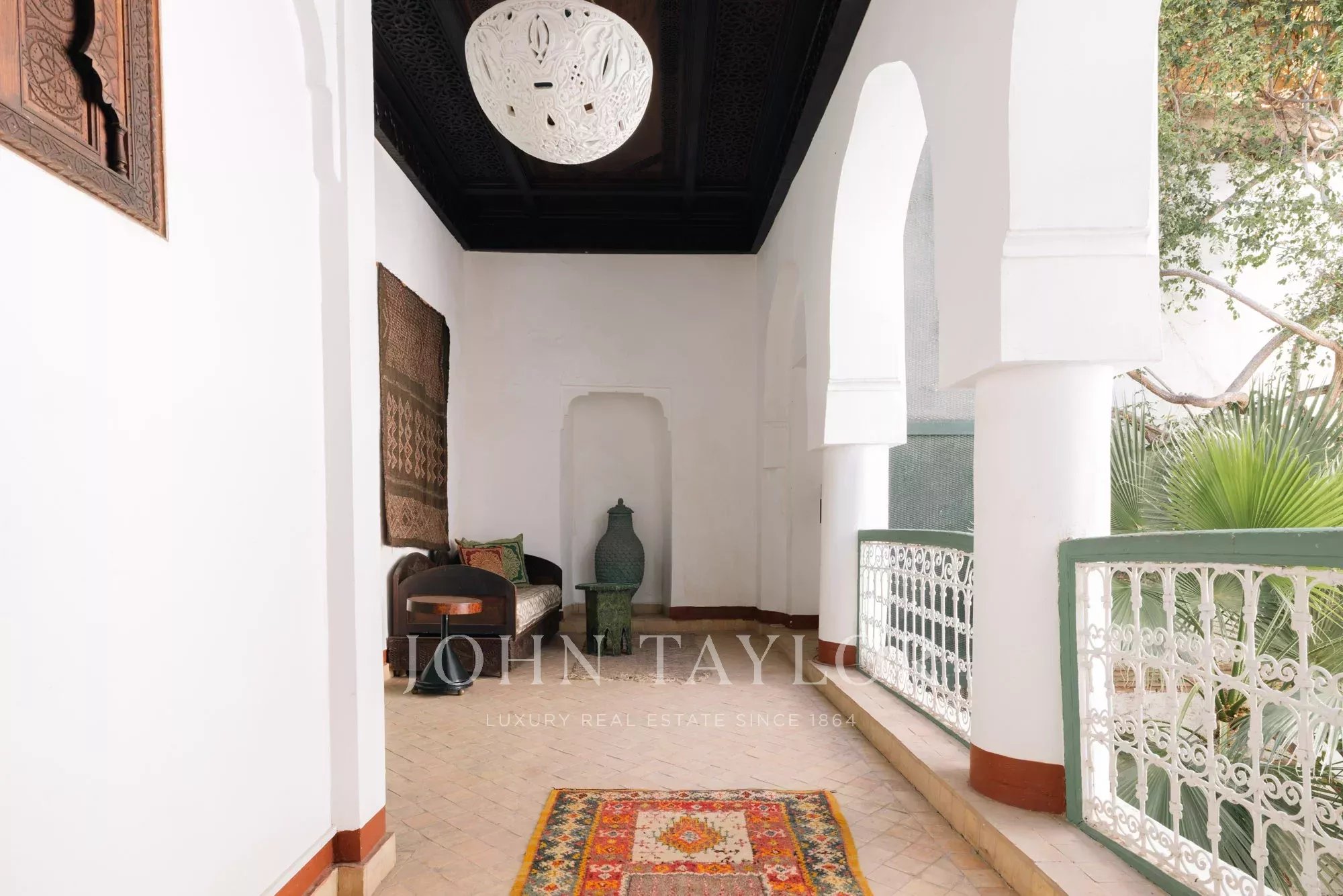 It combines 2 adjacent titled Riad with common entrance and connecting roof-terraces: