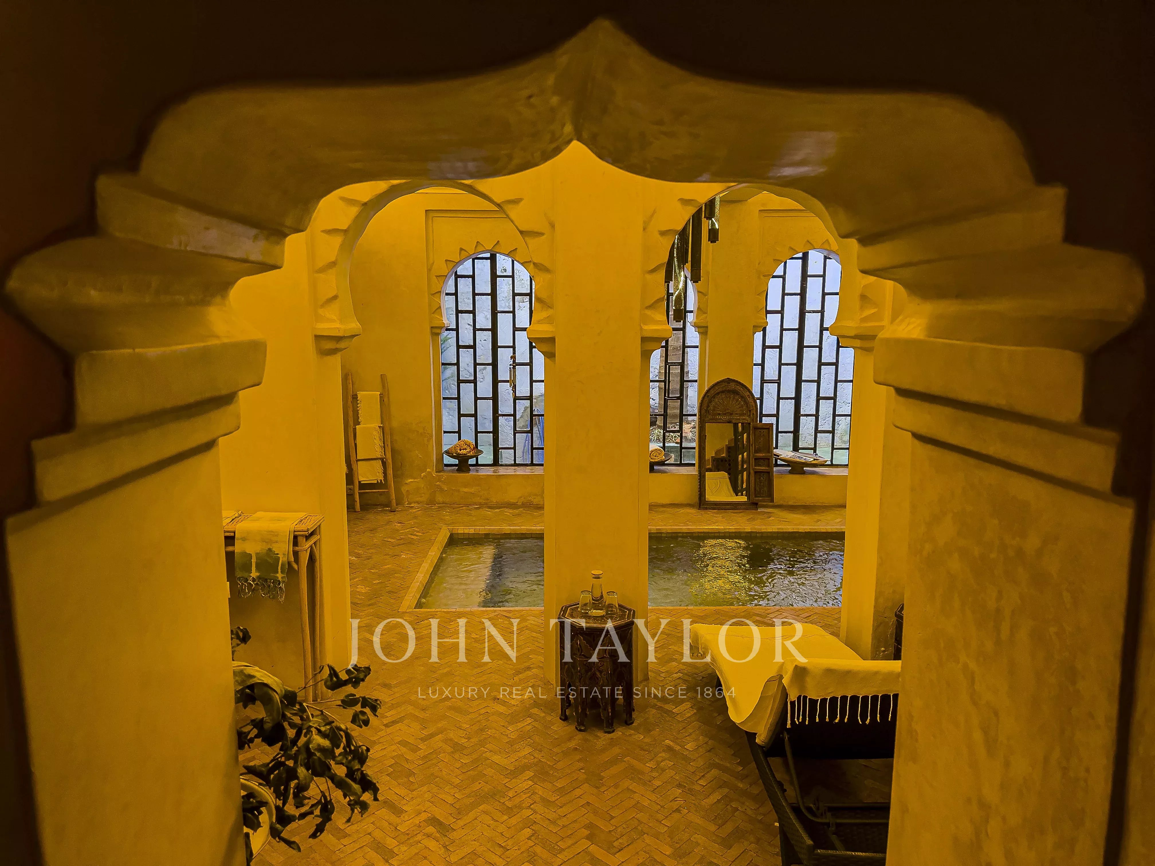 Boasting a 350 sqm internal size, it comprises over 2 floors: cozy living areas, a fitted kitchen, 5 ensuite bedrooms, a hammam as well as an indoor pool.