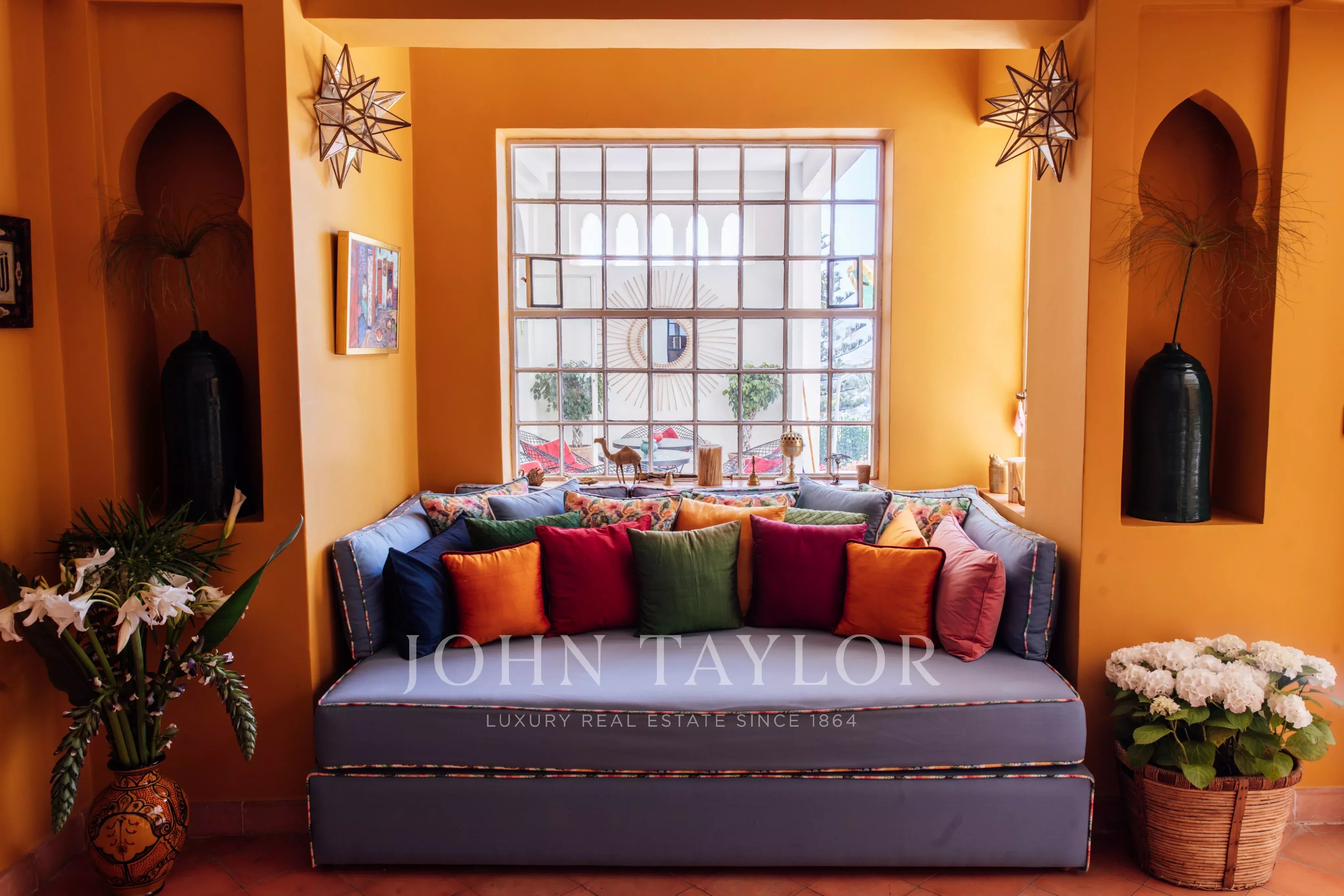 Tucked away on a quiet street in the prestigious Jbel Kbir district, this private residence provides a serene escape and a permanent sanctuary just minutes from the historic Kasbah and Medina. The home radiates cheerful, eclectic charm through its blend of Italian, American, and Moroccan design, making it a outstanding choice for those who appreciate unique character.