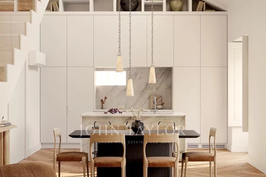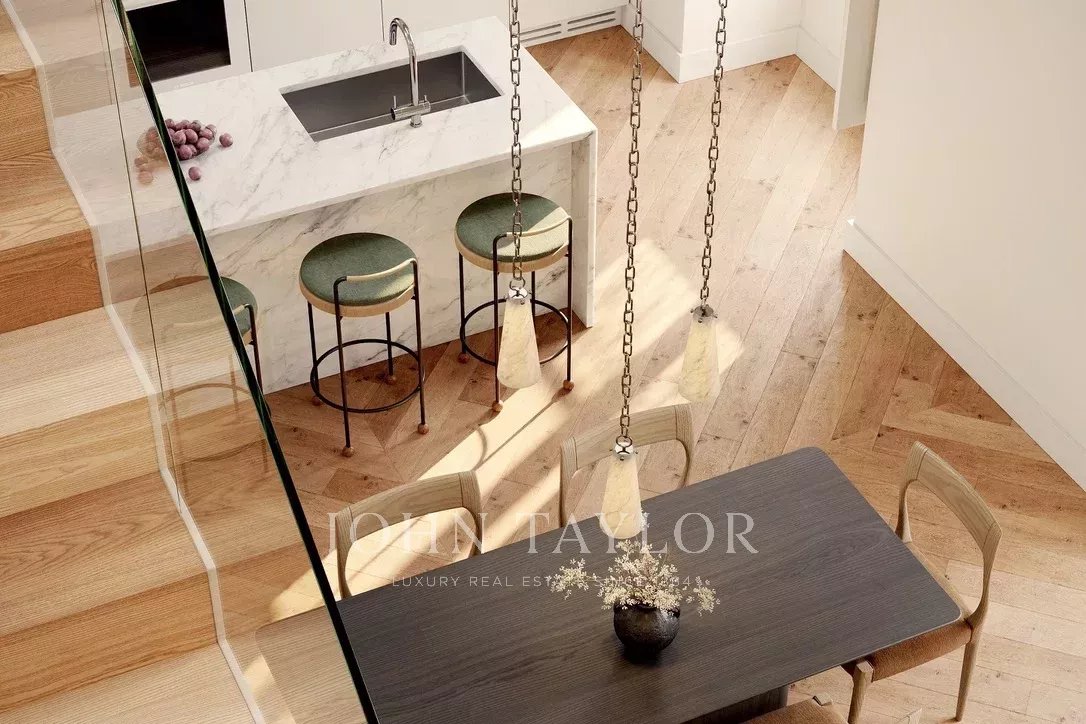The restoration project respected the building’s original character, the stone façade, the traditional green tiles in the entrance hall, and the elegant staircase in wood and natural stone have all been carefully preserved. A modern glass lift adds comfort without altering the historical feel. Inside, the apartments feature high ceilings, large windows, solid wood floors, and marble bathrooms, creating an atmosphere that is both classic and refined.