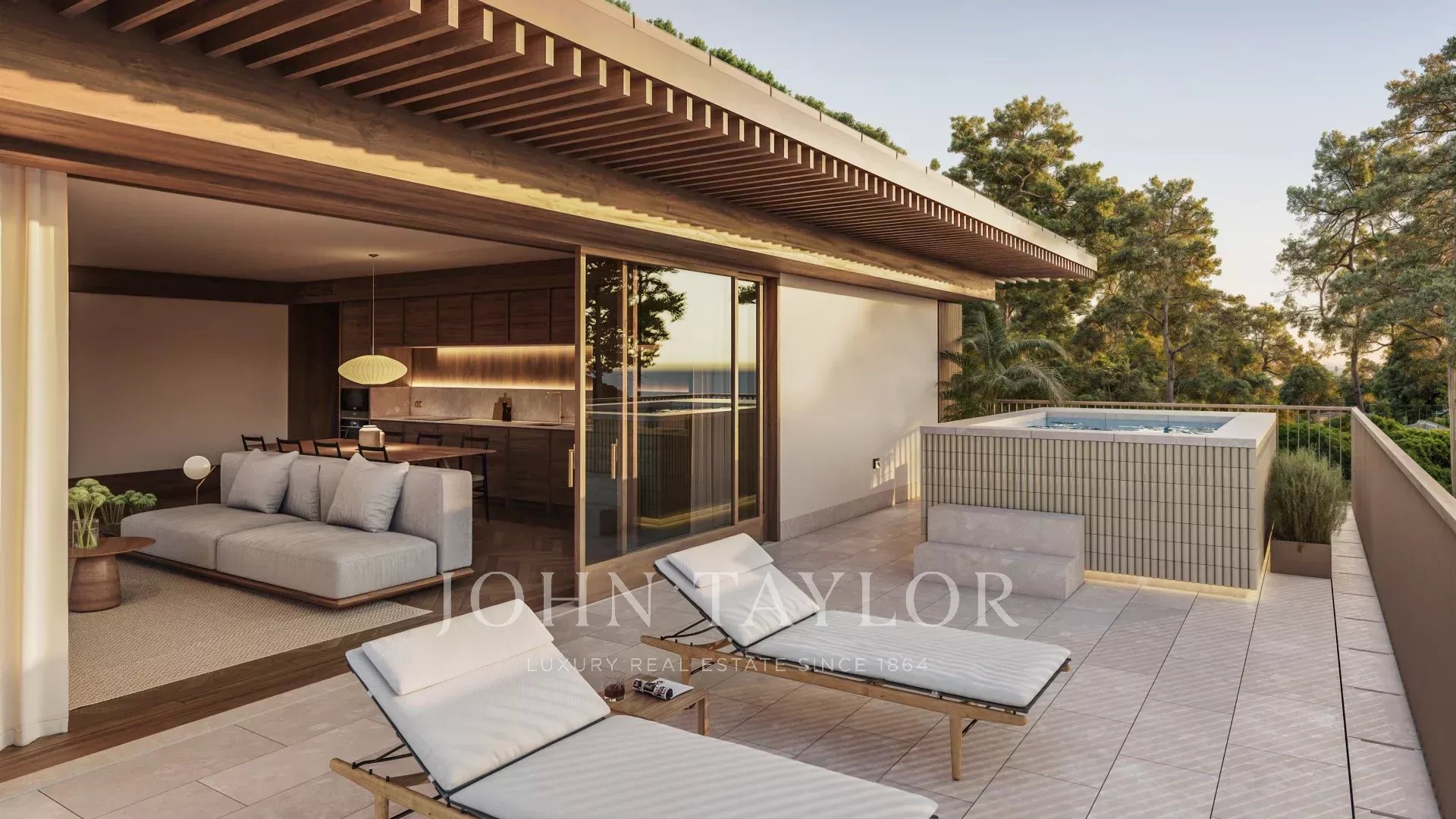 The apartment features 2 spacious en-suite bedrooms, a fully equipped open kitchen, and a combined living and dining room that open onto generous balcony and terrace with a swimming pool. It also includes a social bathroom and a versatile pantry or laundry room.