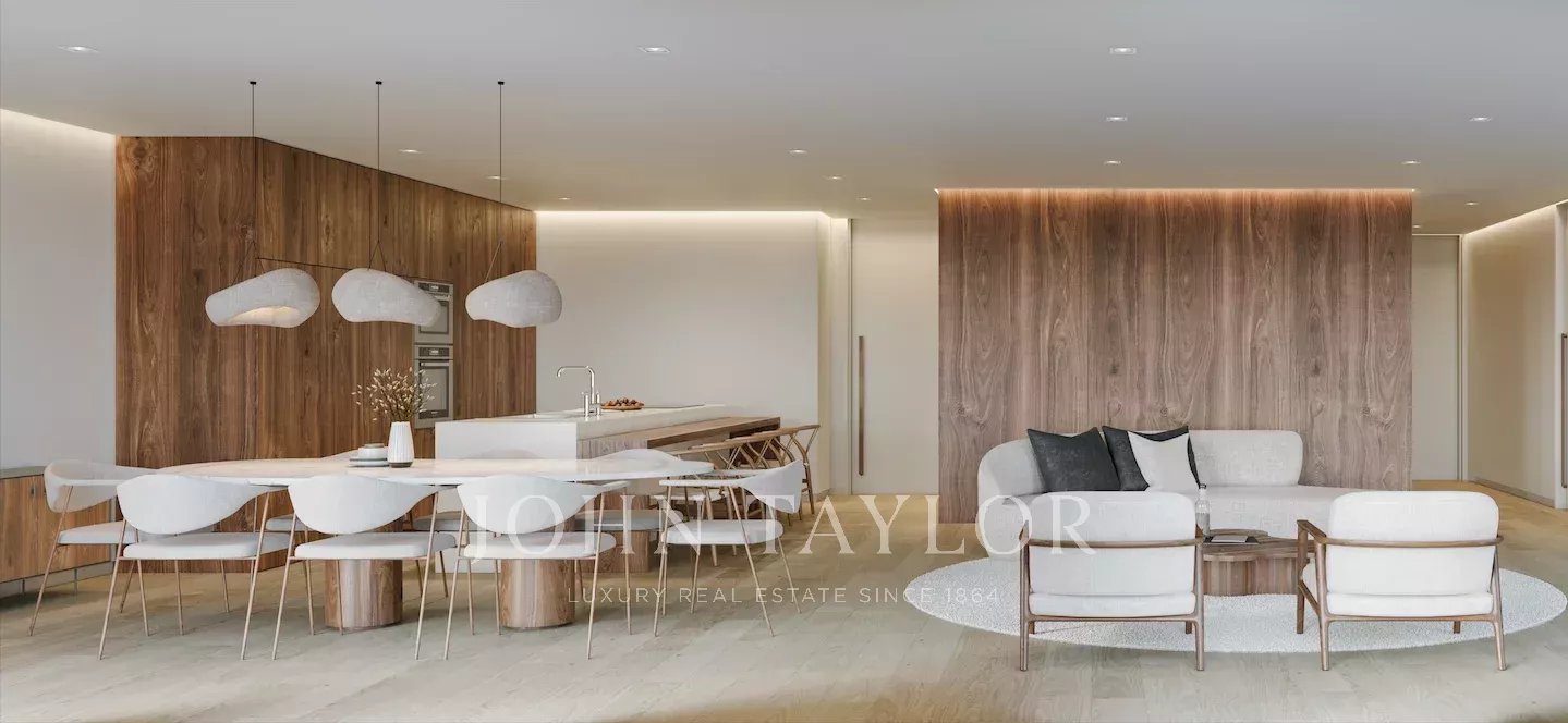 On the main level, the bright and expansive living and dining areas, along with an open-plan kitchen, span 72.5 m². Two beautifully appointed suites of 18 m² and 20.5 m² complete this floor. The property also includes three terraces and two private parking spaces.