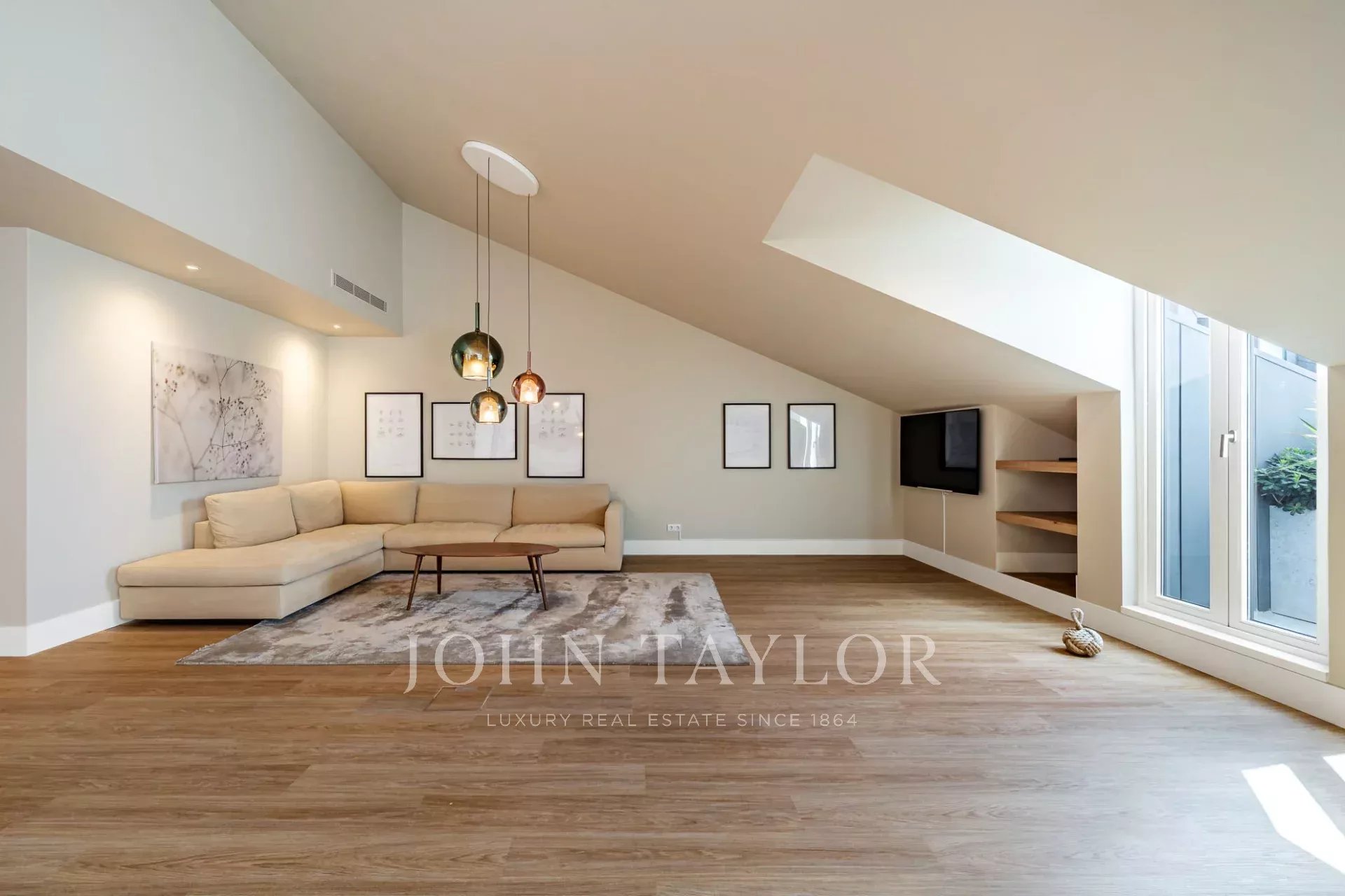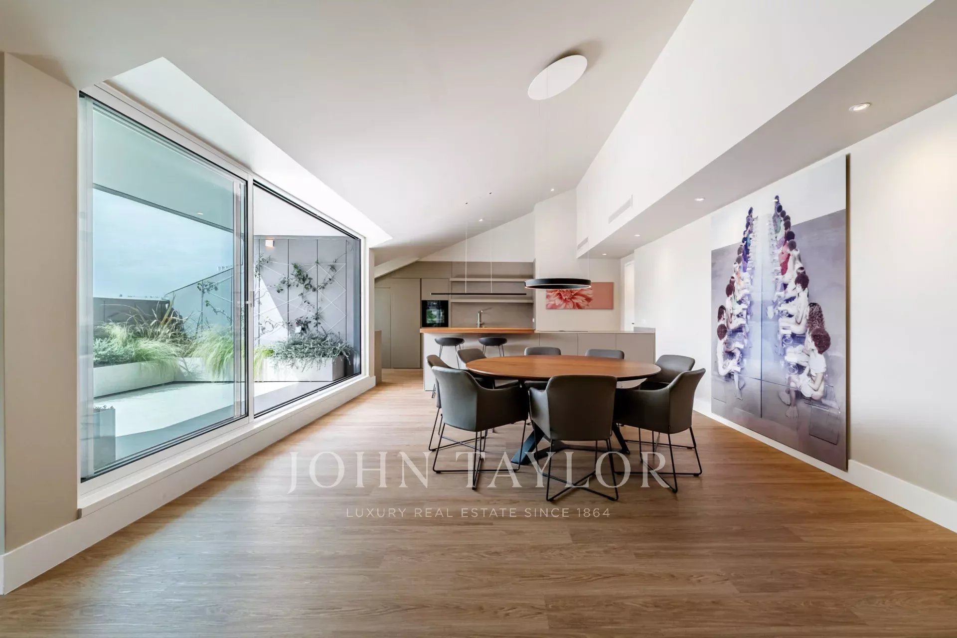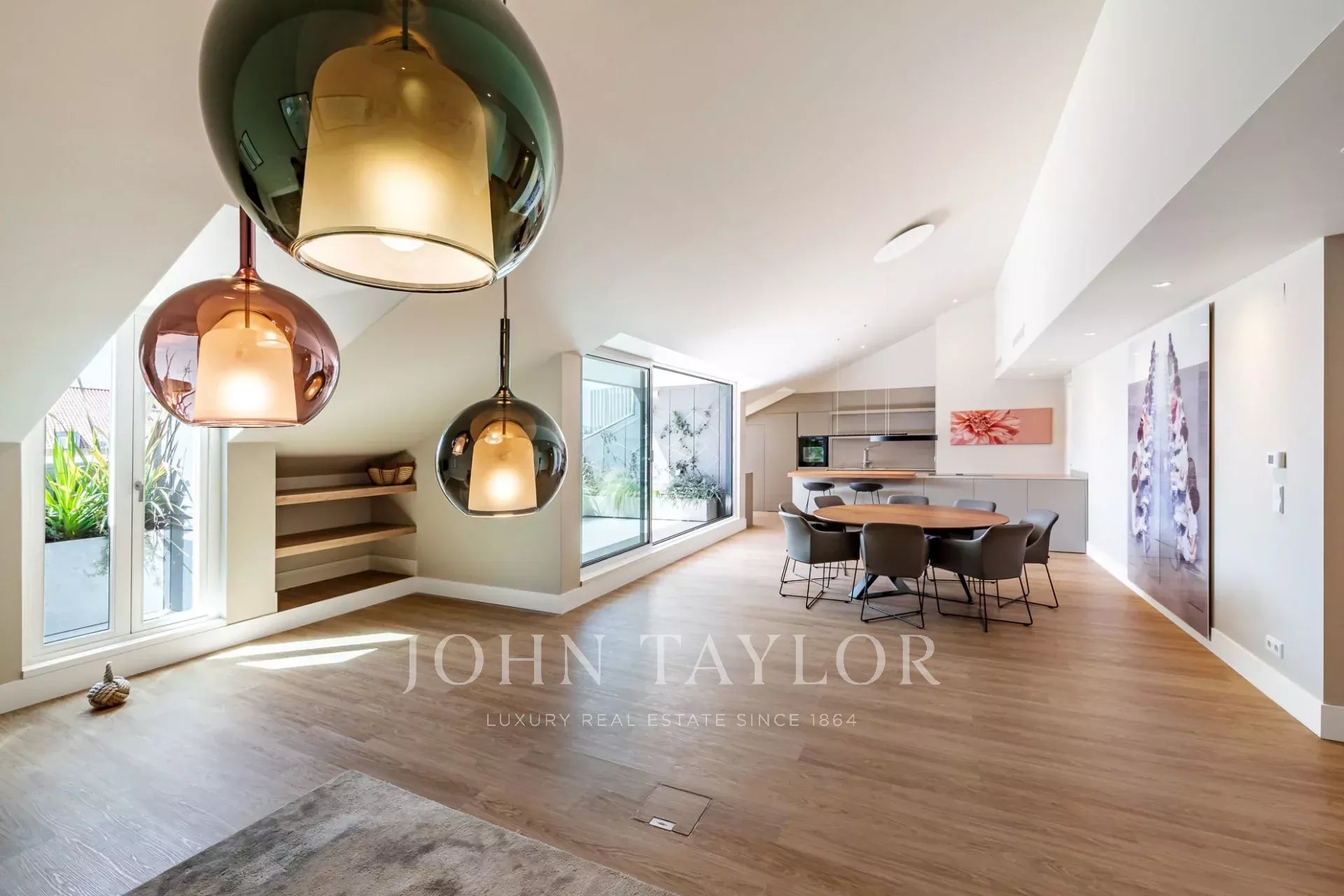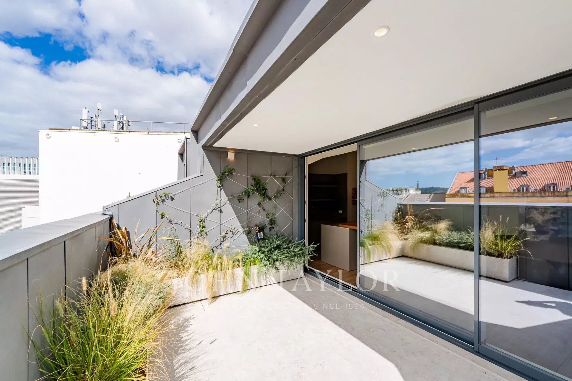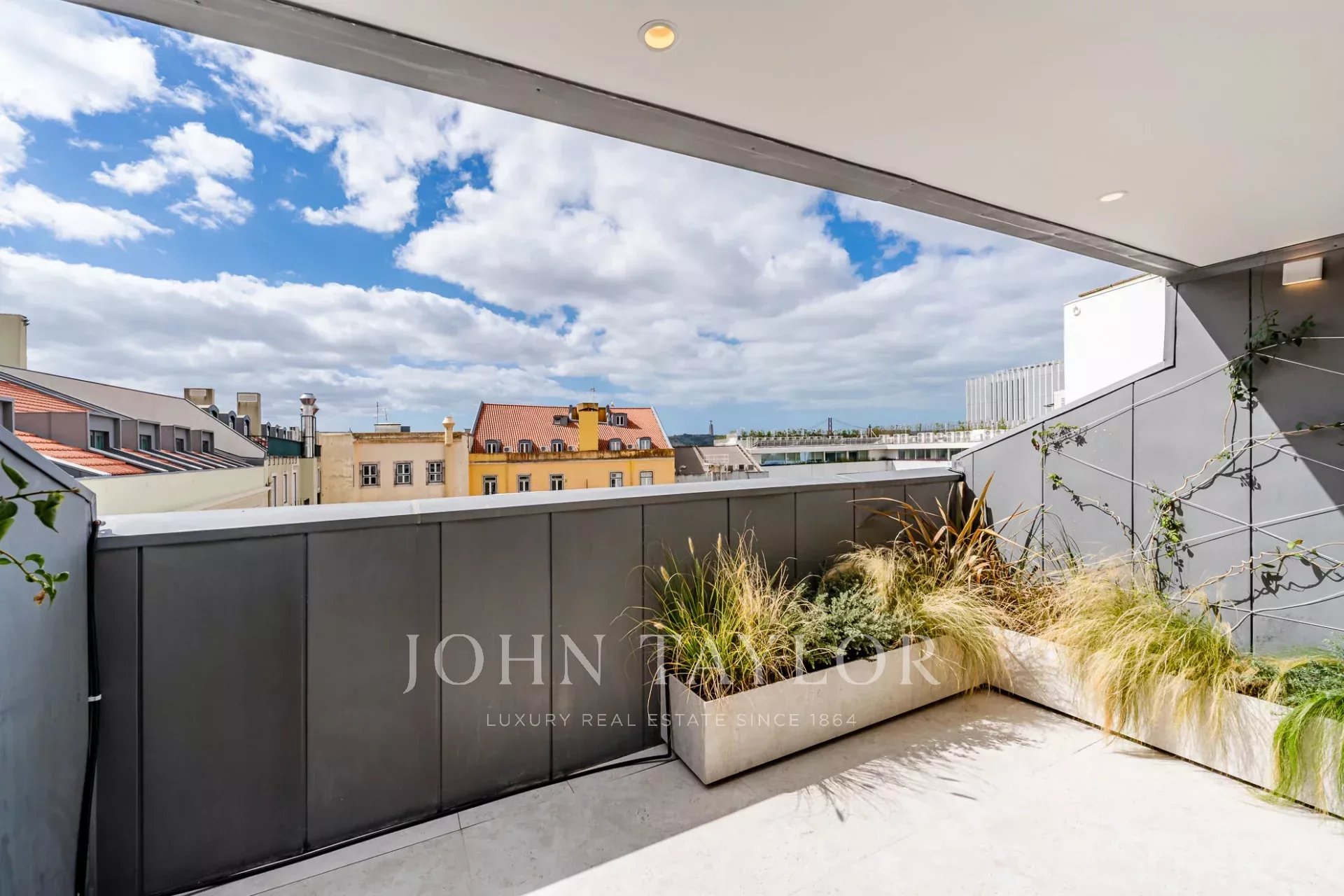 The open-plan layout, highlighted by large sliding windows, brings abundant natural light and creates a bright, welcoming atmosphere. A private terrace with outdoor lighting provides panoramic views over the city and the 25th of April Bridge.