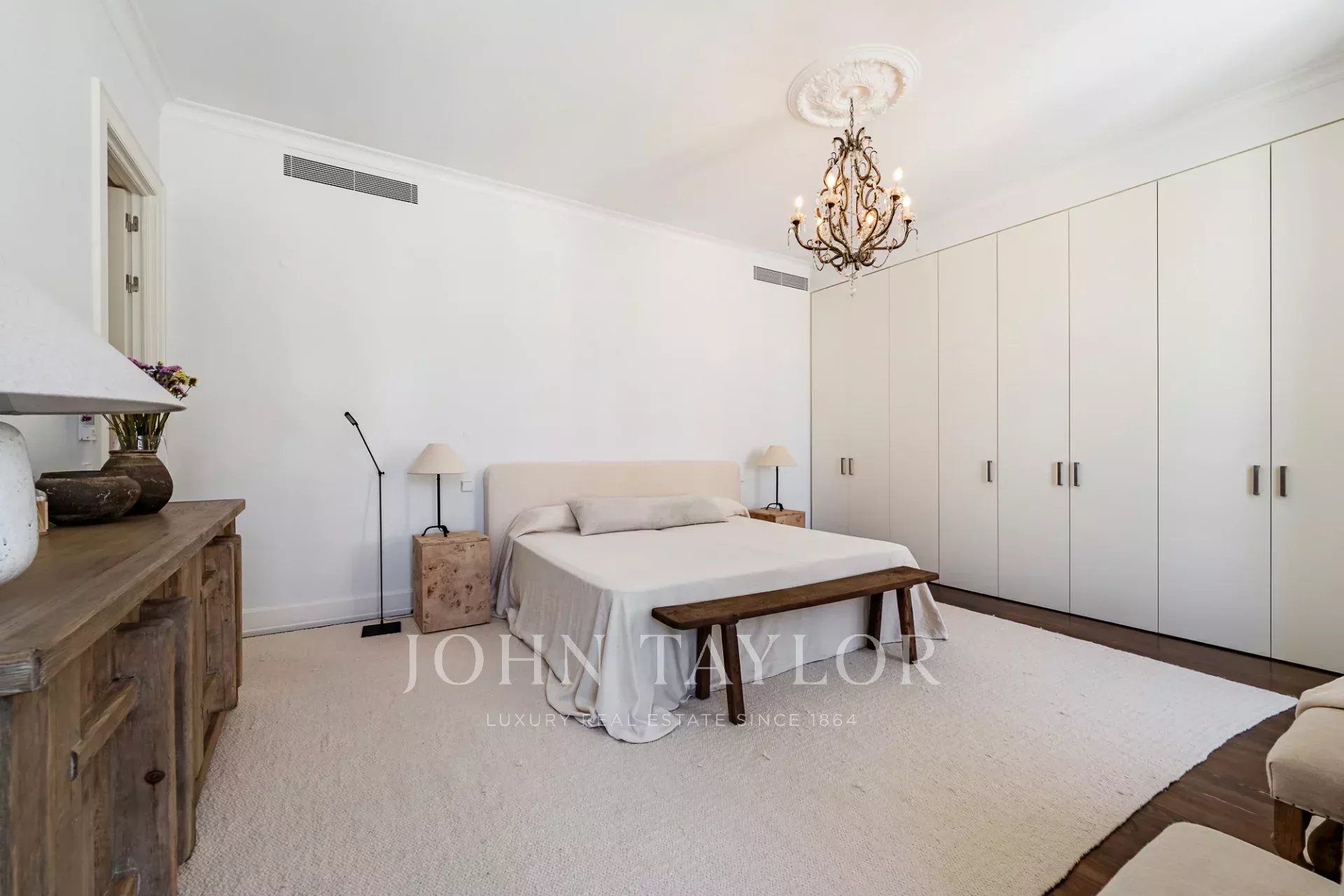 The layout is generous and well designed, with high ceilings, elegant proportions, and quality finishes throughout. It includes four bedrooms, three of them en suite, as well as a large living and dining area of approximately 80 m², filled with natural light and partial views of the Tagus River.