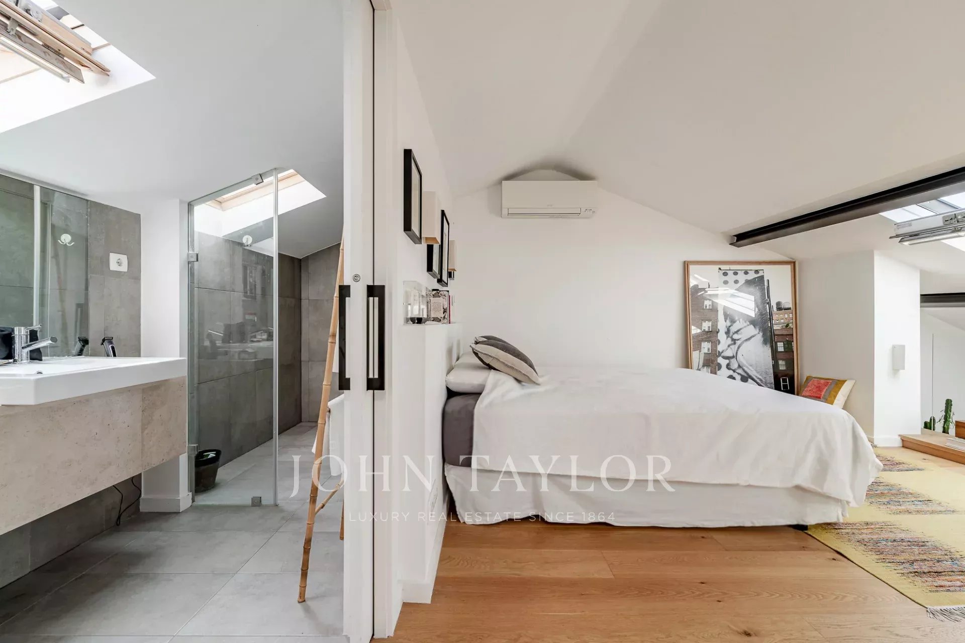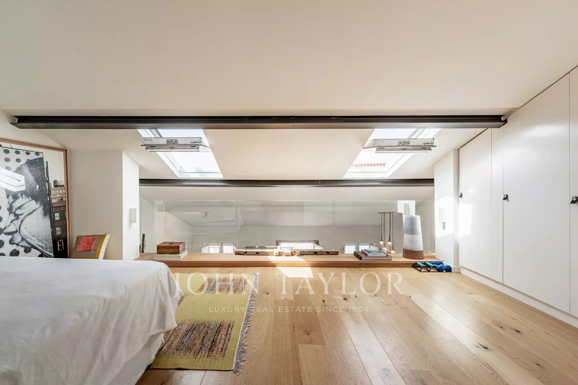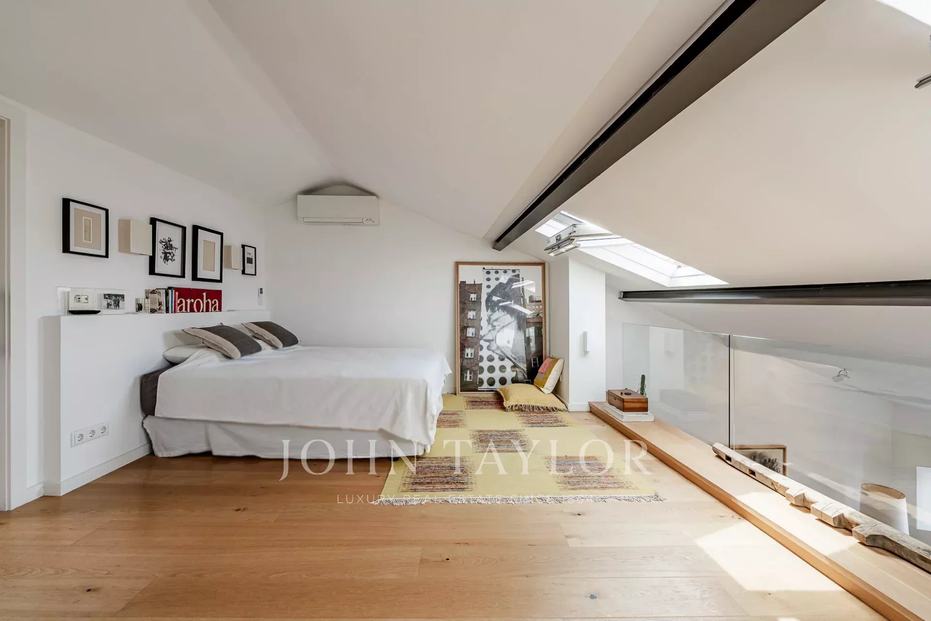 Upstairs, the generous master suite benefits from a south-facing orientation, flooding the space with natural light and offering spectacular views over the River Tejo. High ceilings and large windows throughout the apartment create a bright and airy atmosphere.