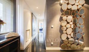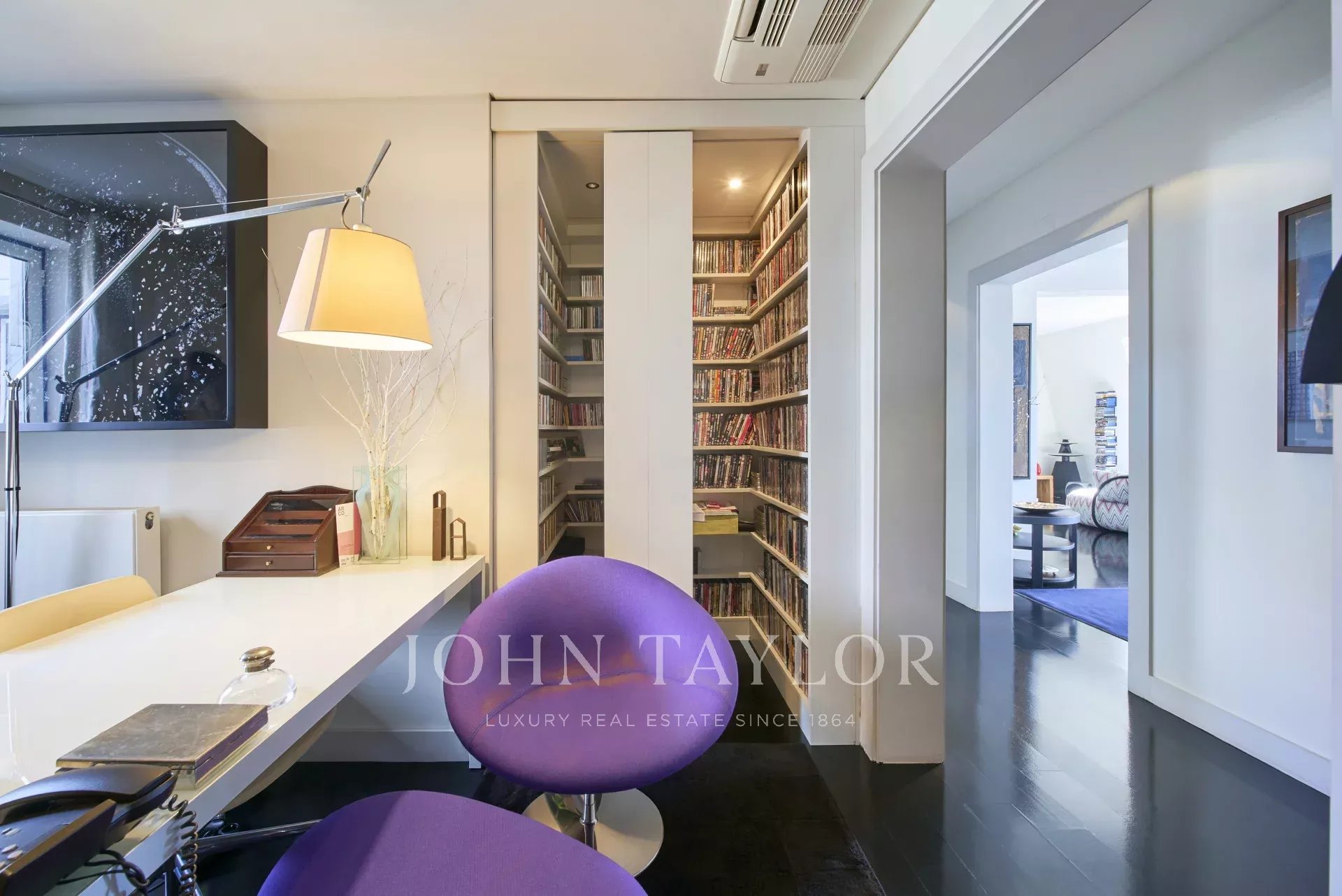 The private quarters feature two en-suite bedrooms, including a magnificent primary suite complete with a glass-walled bathroom, a sculptural bathtub beneath a skylight, and a large walk-in closet. Two additional bedrooms provide flexibility, one of which has been transformed into a private gym. The kitchen is currently under construction, allowing the future owner the unique opportunity to personalize it to their taste.