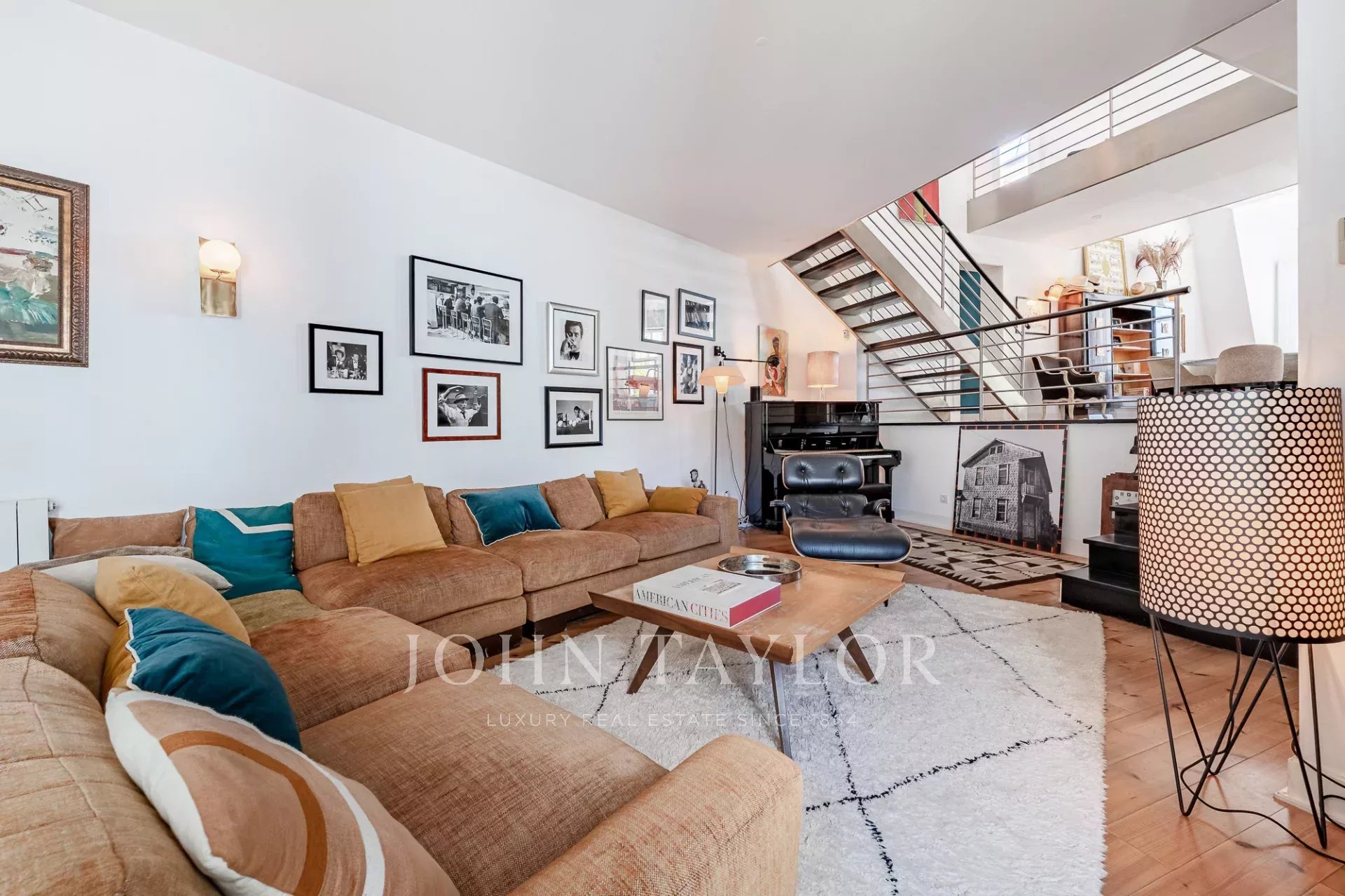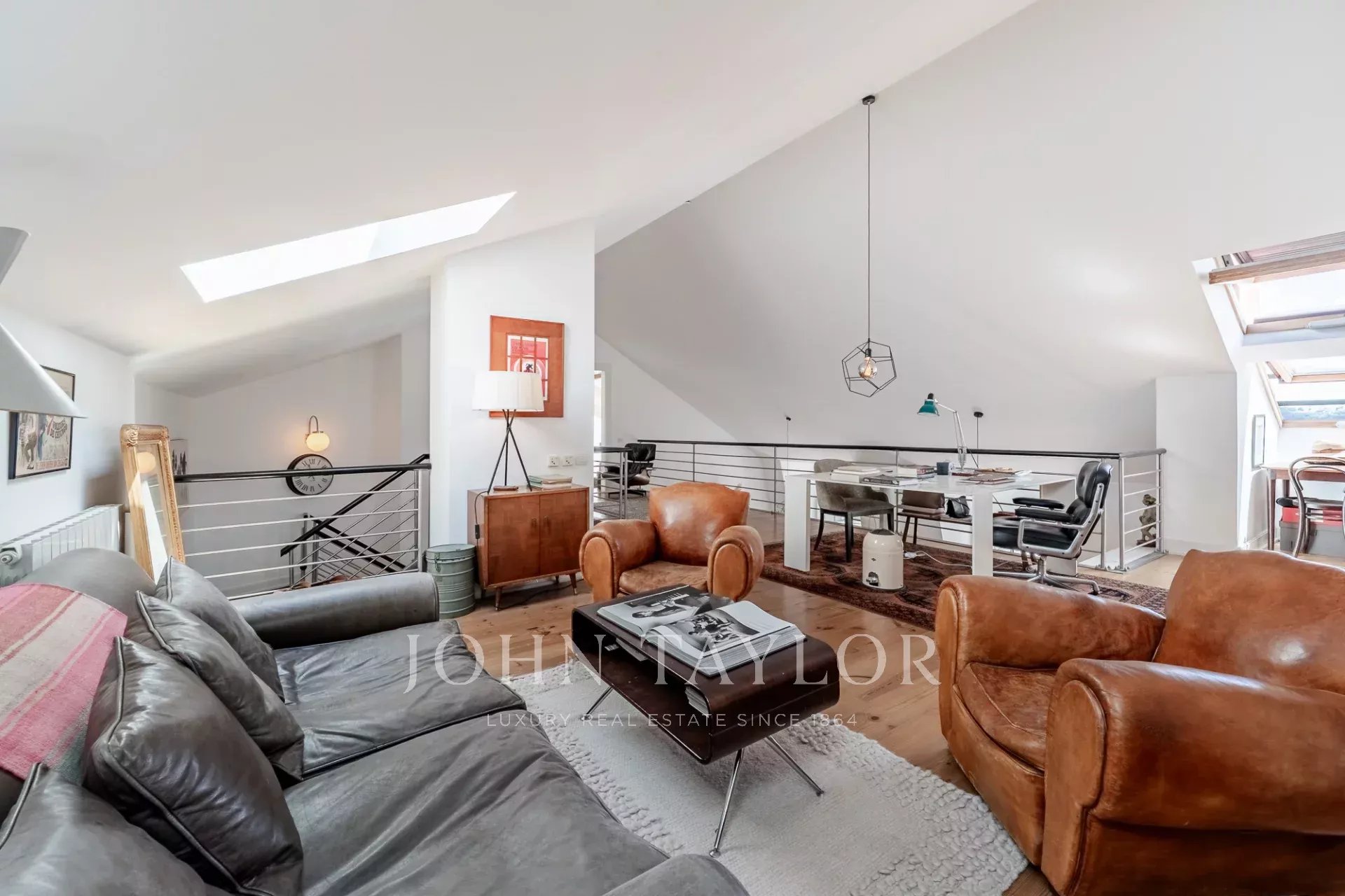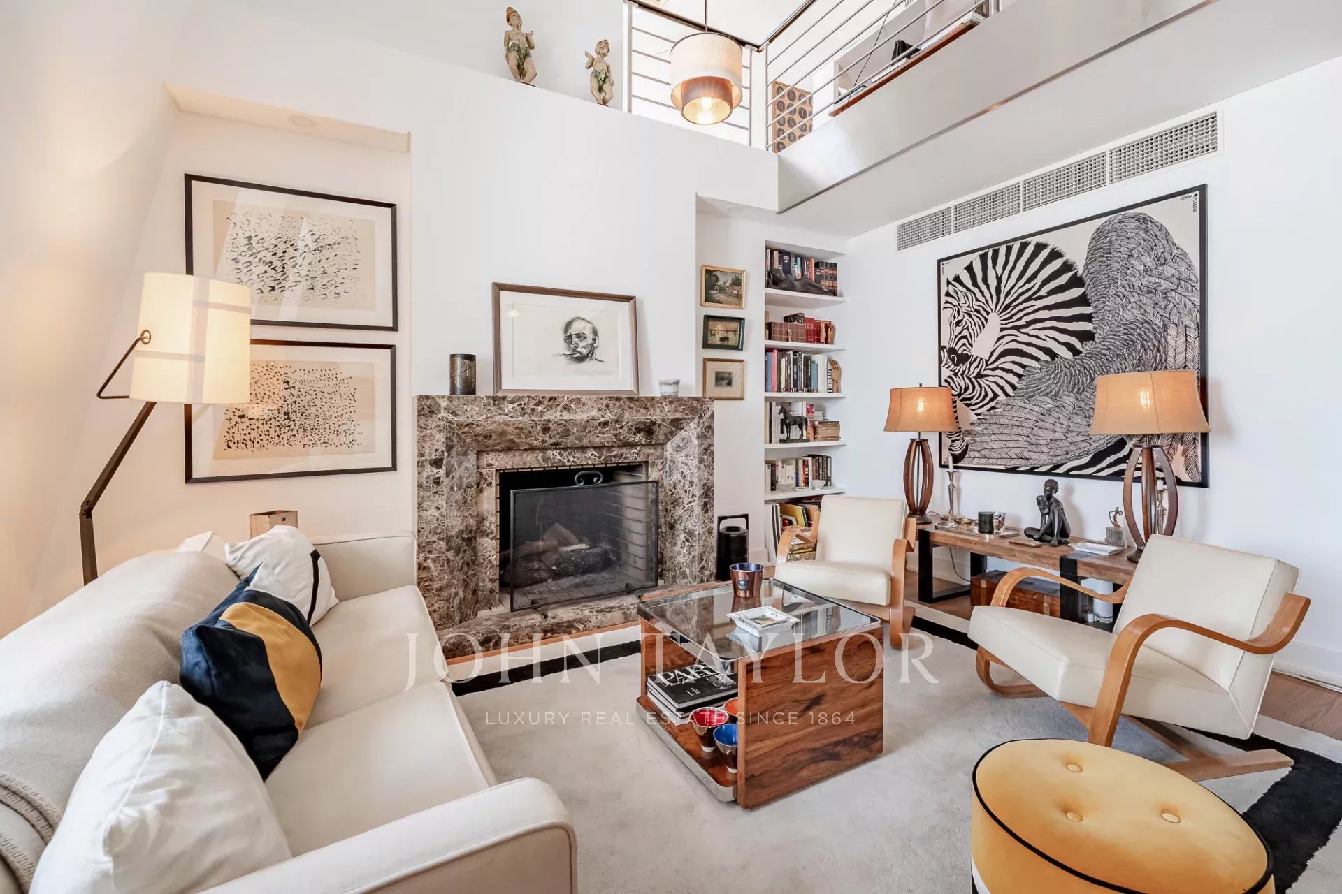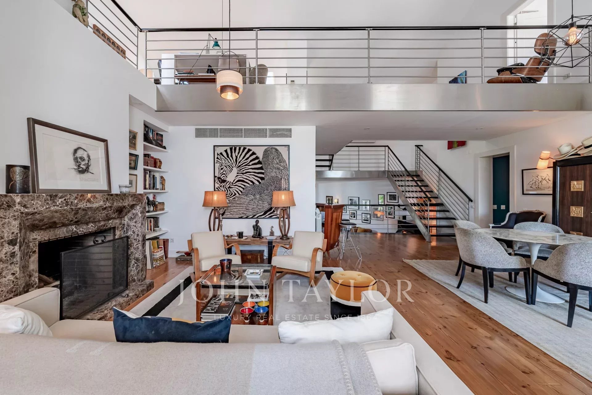 The lower level features impressive double-height ceilings that enhance the sense of space and light throughout. A spacious living room with a cozy fireplace provides a perfect setting for relaxation, while the fully equipped kitchen and small adjacent terrace make entertaining effortless.