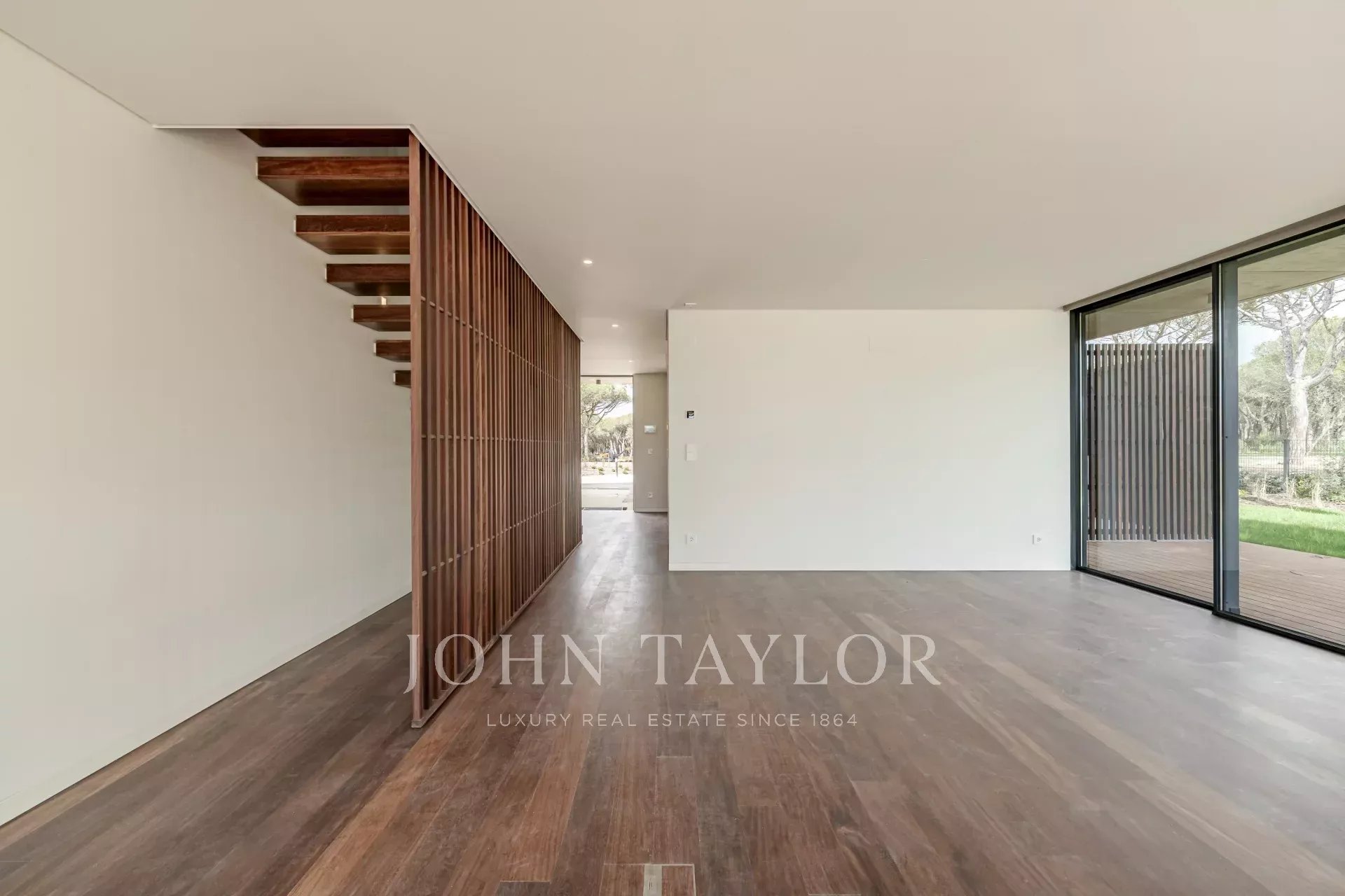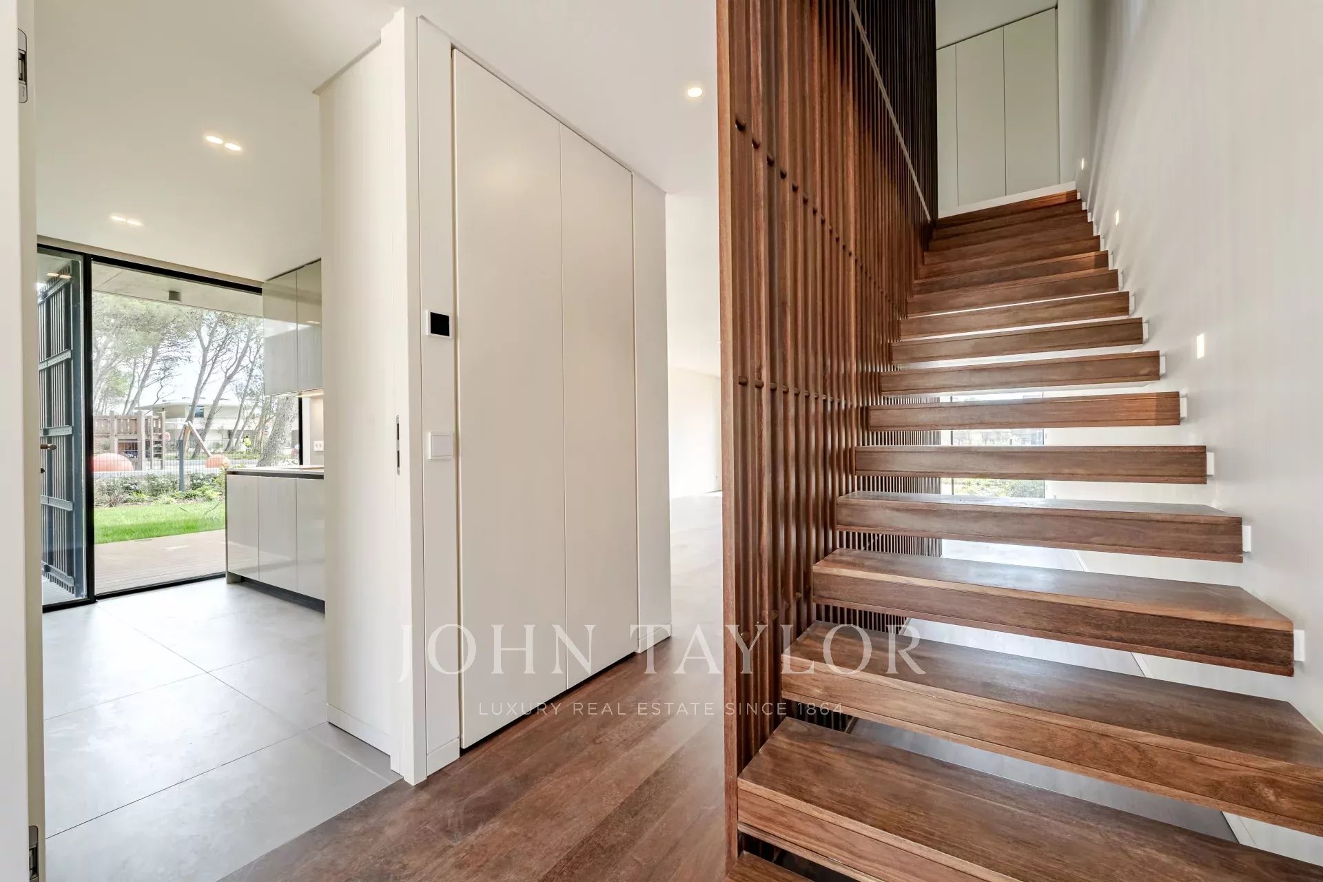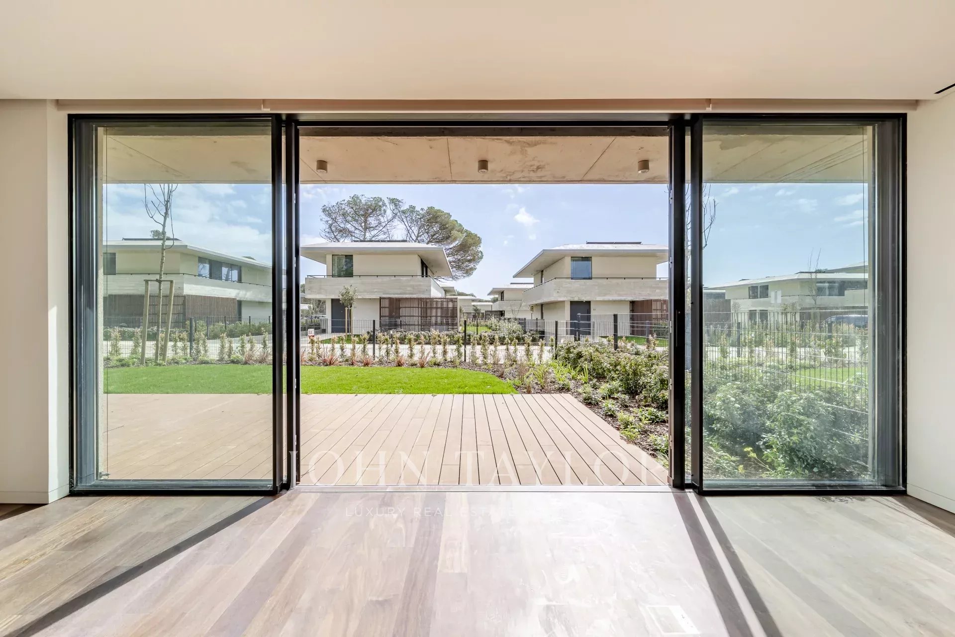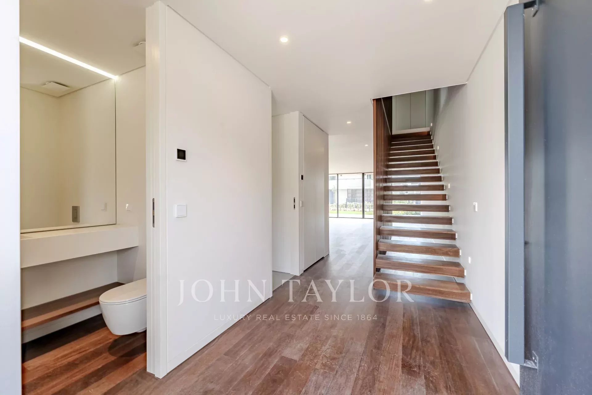 The ground floor features a spacious 48 m² open-plan living and dining area with direct access to the deck and garden, providing a seamless flow between indoor and outdoor spaces. This level also includes a fully fitted kitchen, a laundry room with access to a service patio, and a guest WC. The villa comes with three private parking spaces.