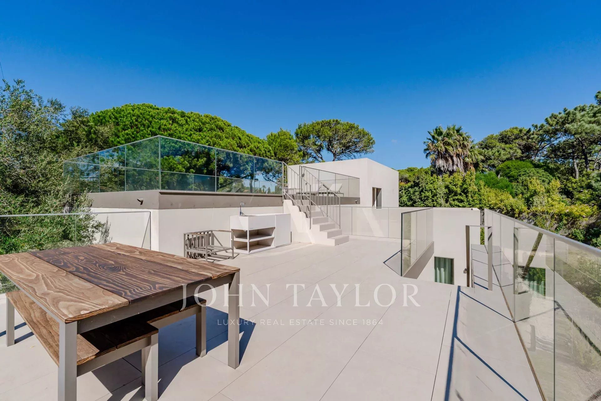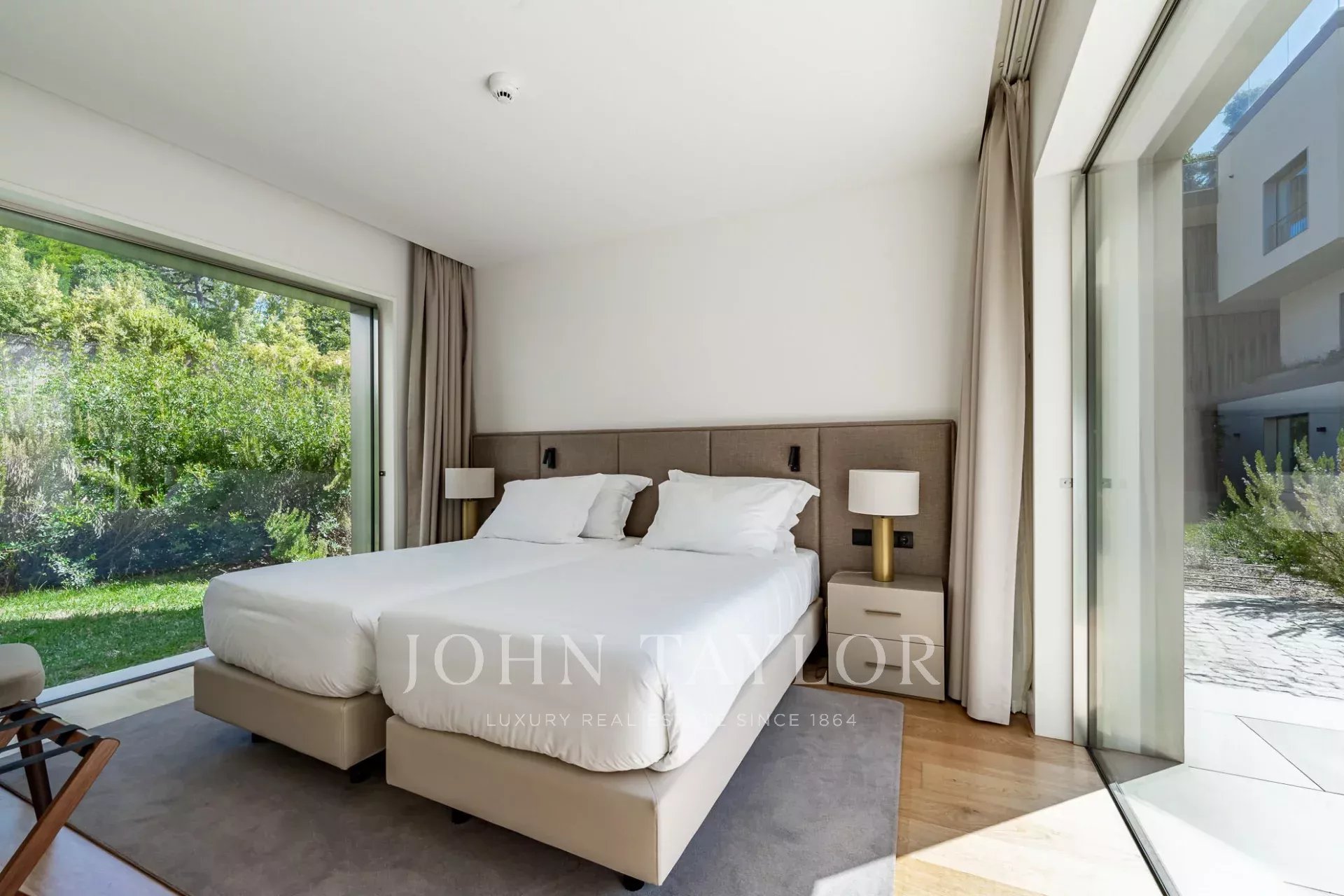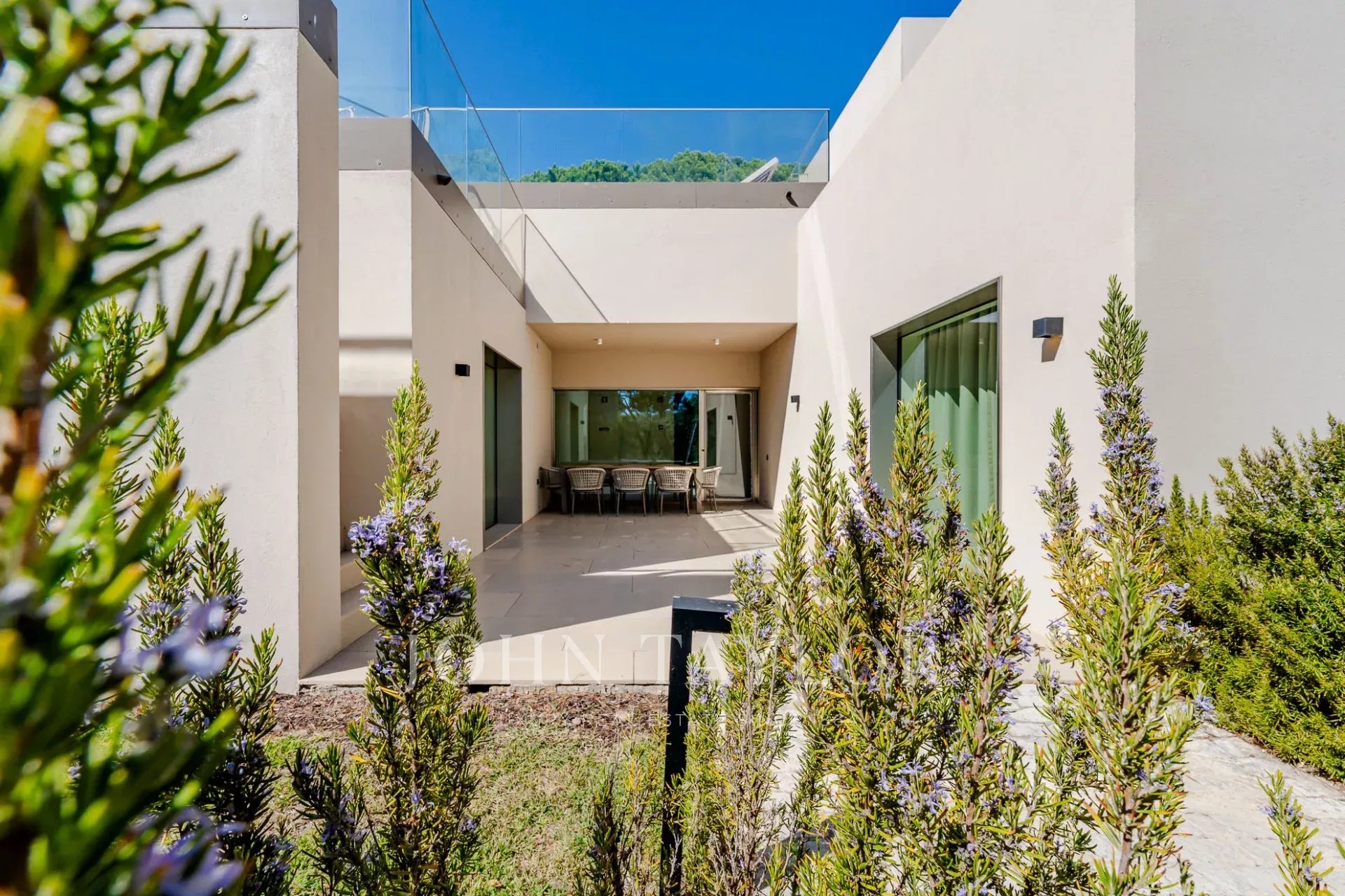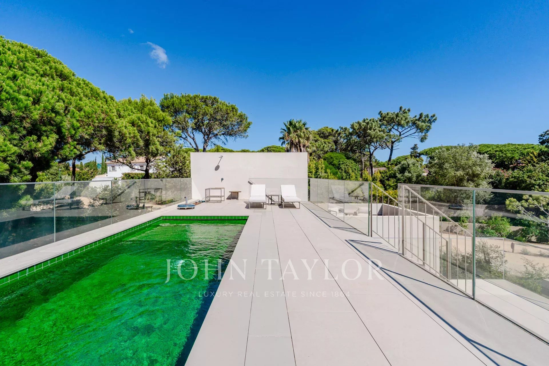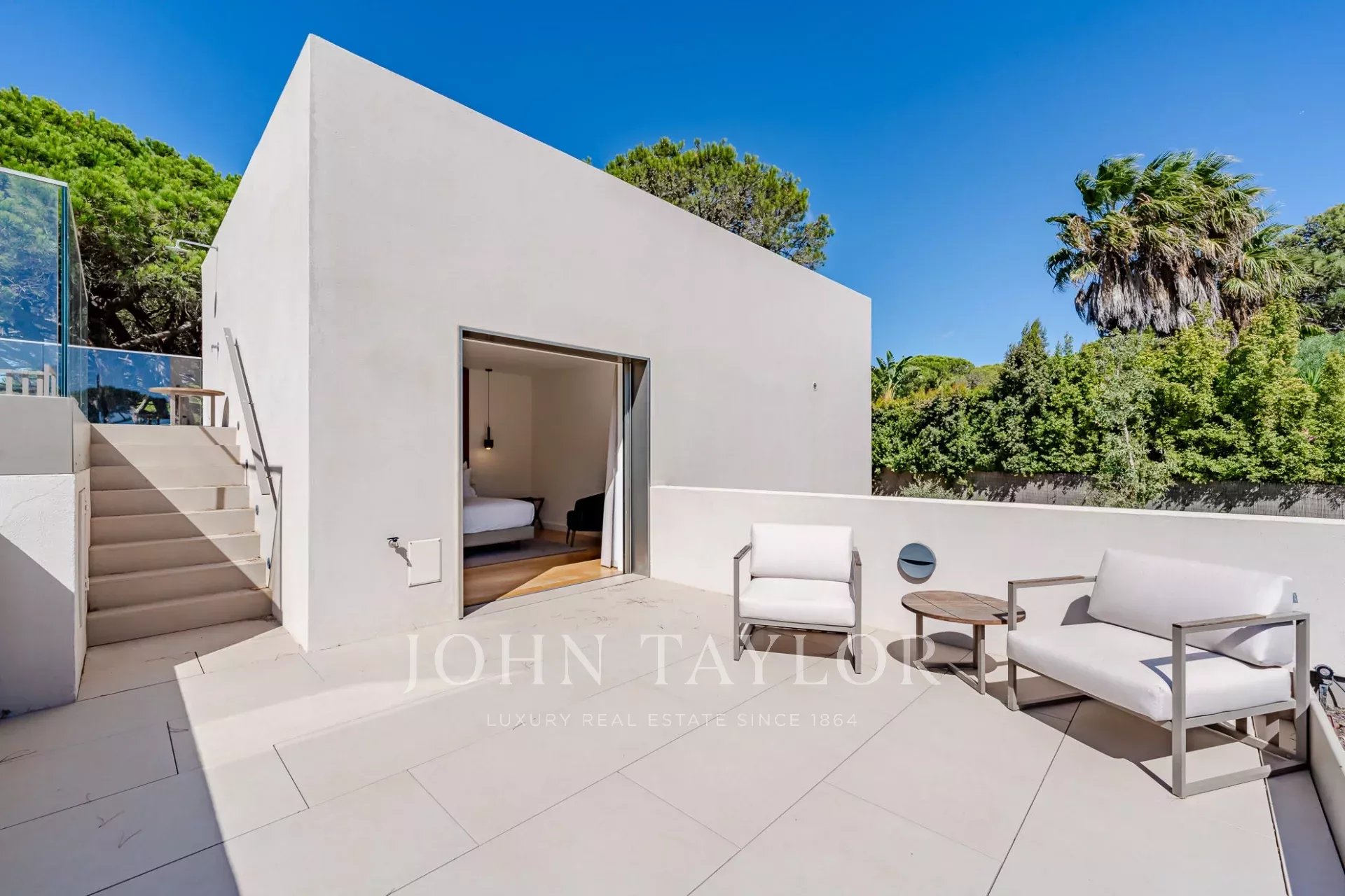 On the upper floor, the master suite enjoys a private balcony and direct access to the terrace where the pool is located
