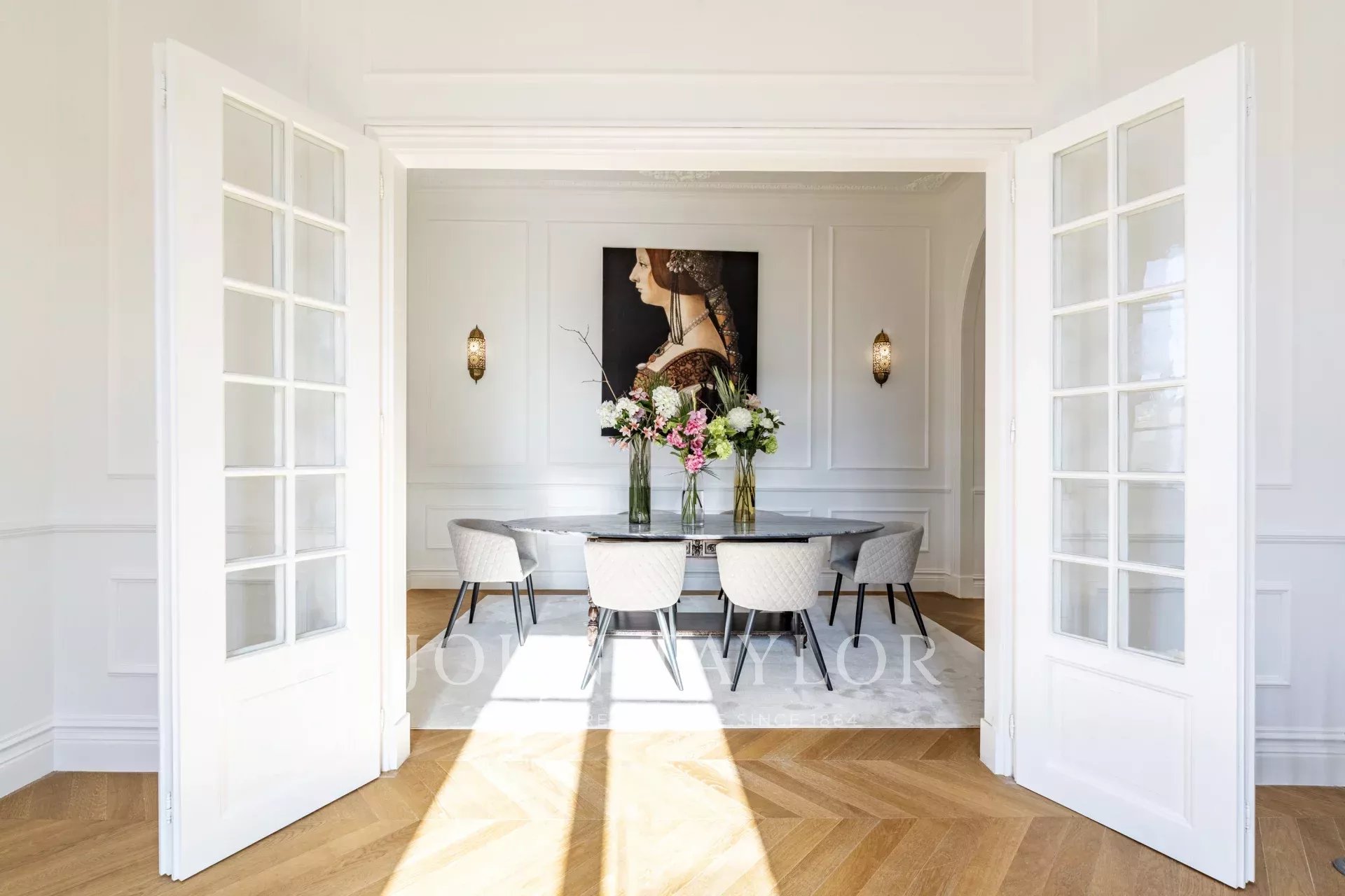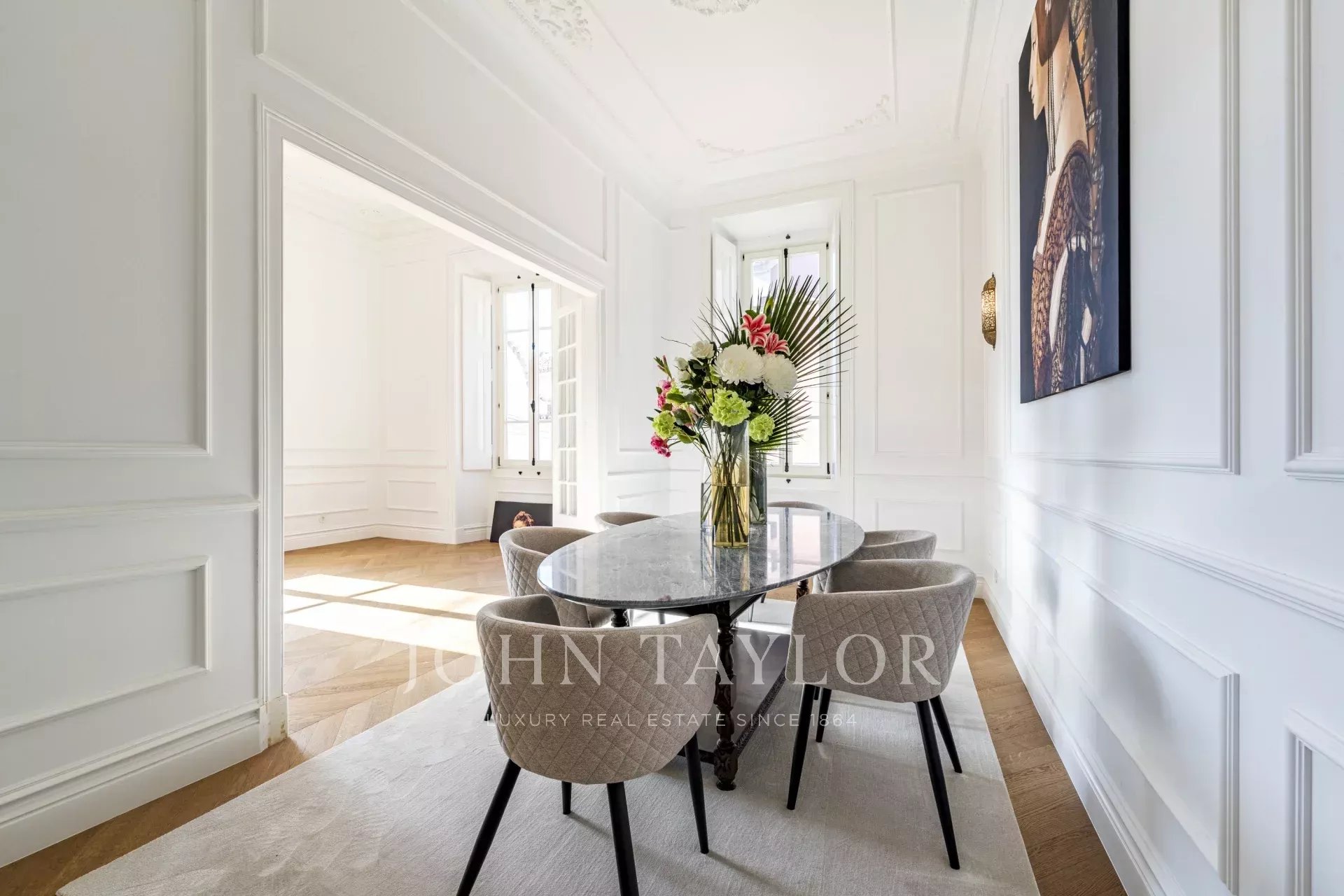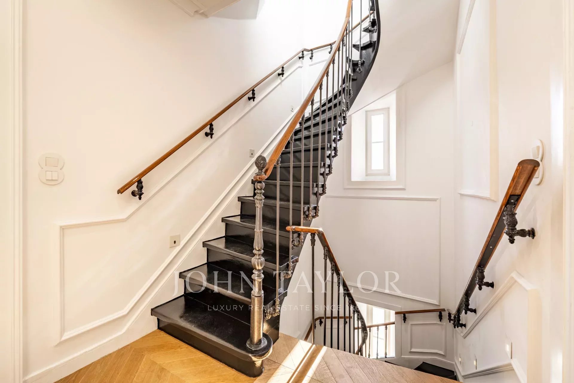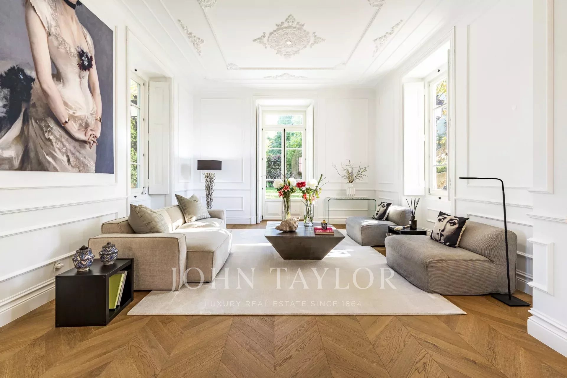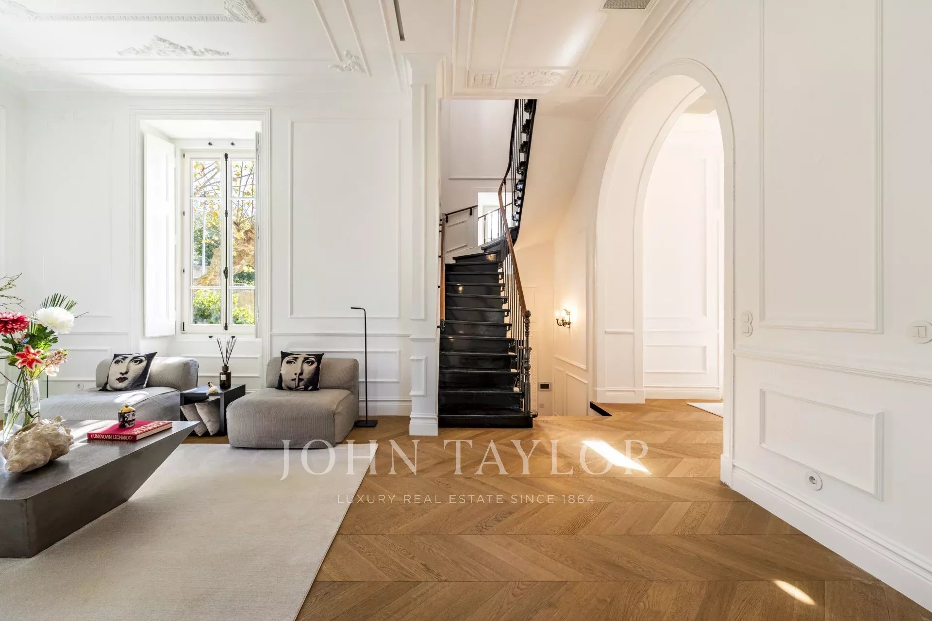 Spread over four floors, the ground floor features a spacious living room that opens to a beautifully landscaped garden, seamlessly connecting indoor and outdoor spaces. A formal dining room and a fully equipped kitchen are perfect for both casual and formal entertaining.