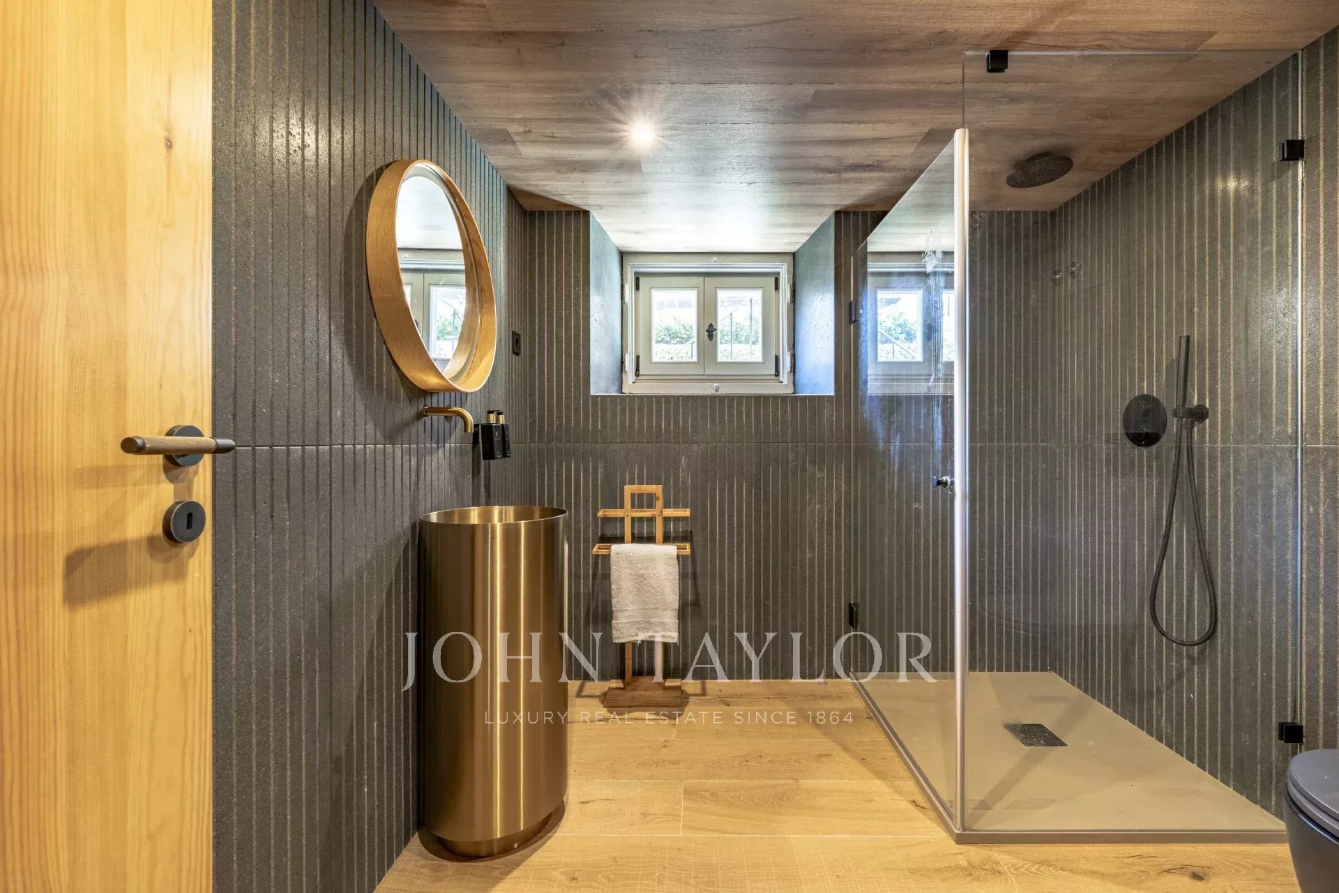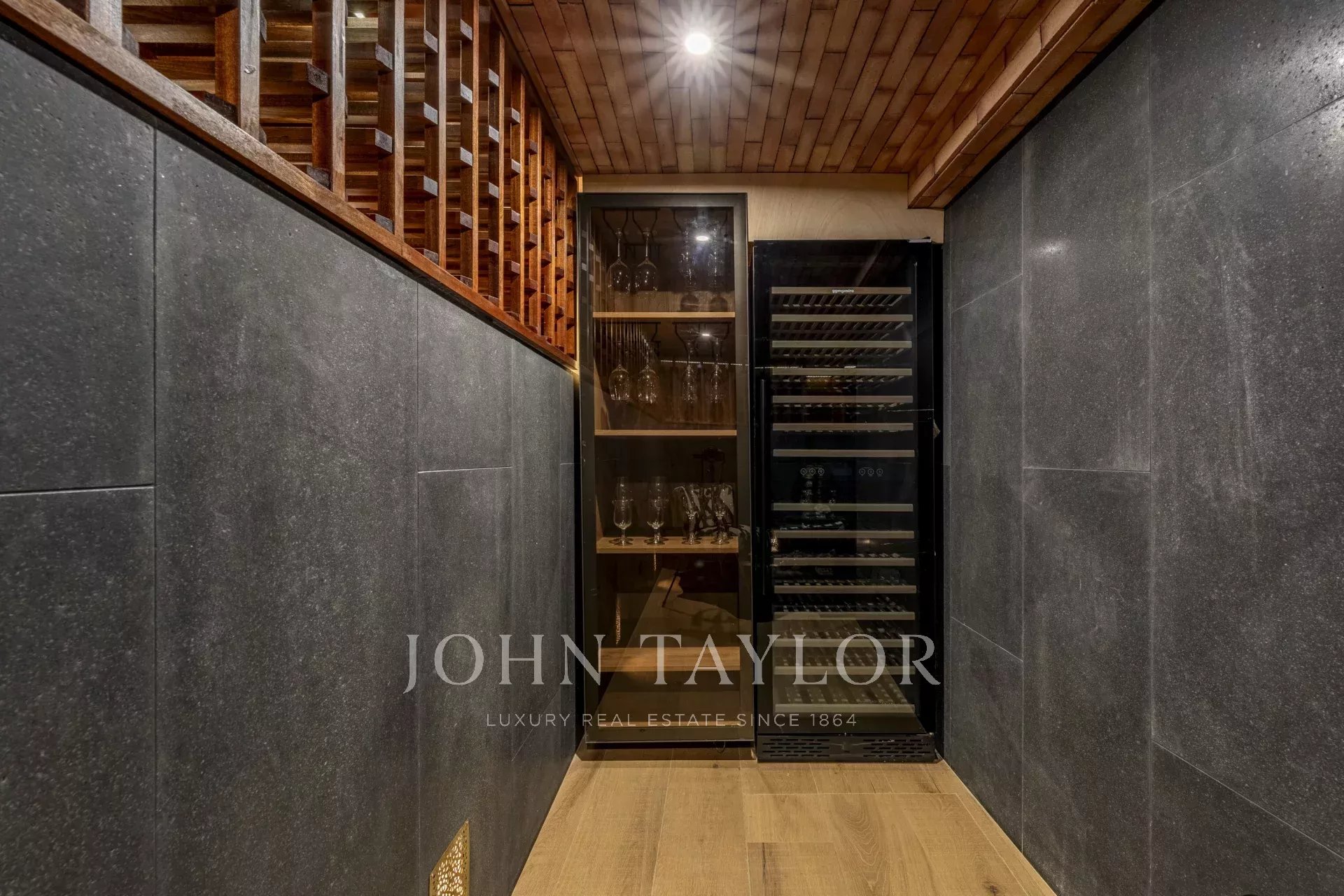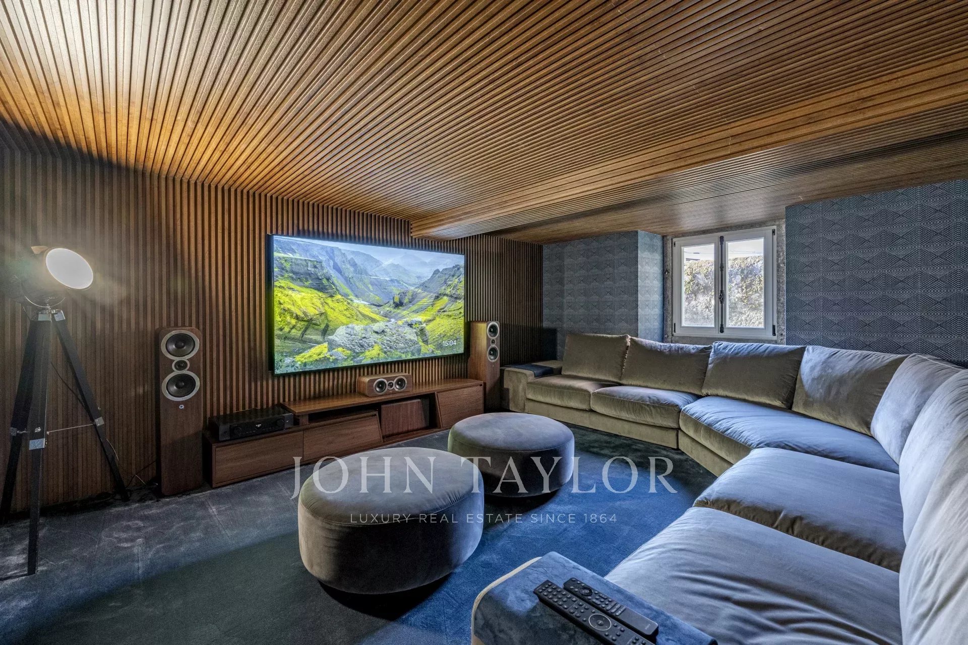 The lower level offers an entertainment area with a soundproof TV room, a wine cellar, sauna, laundry, and an additional bedroom.