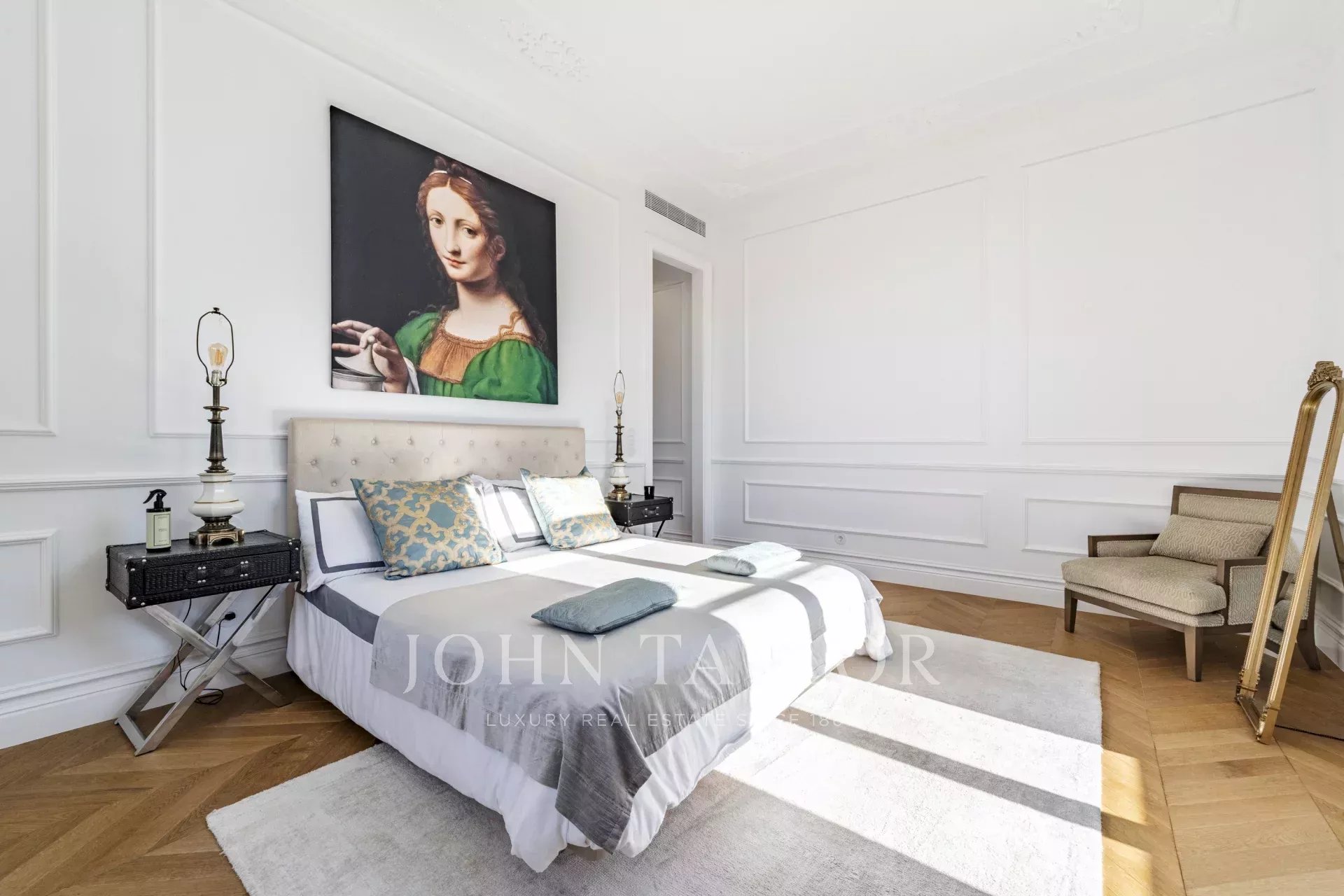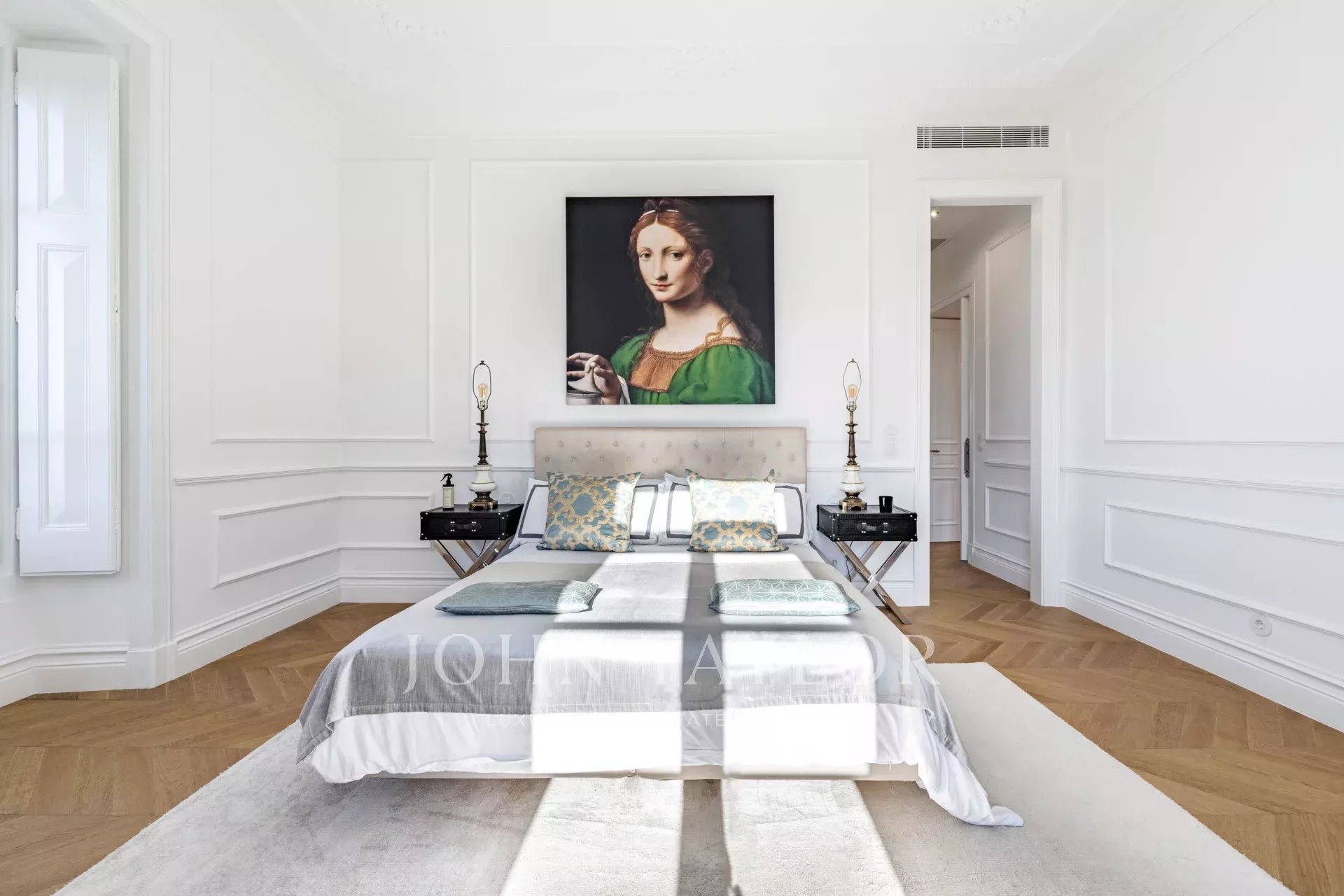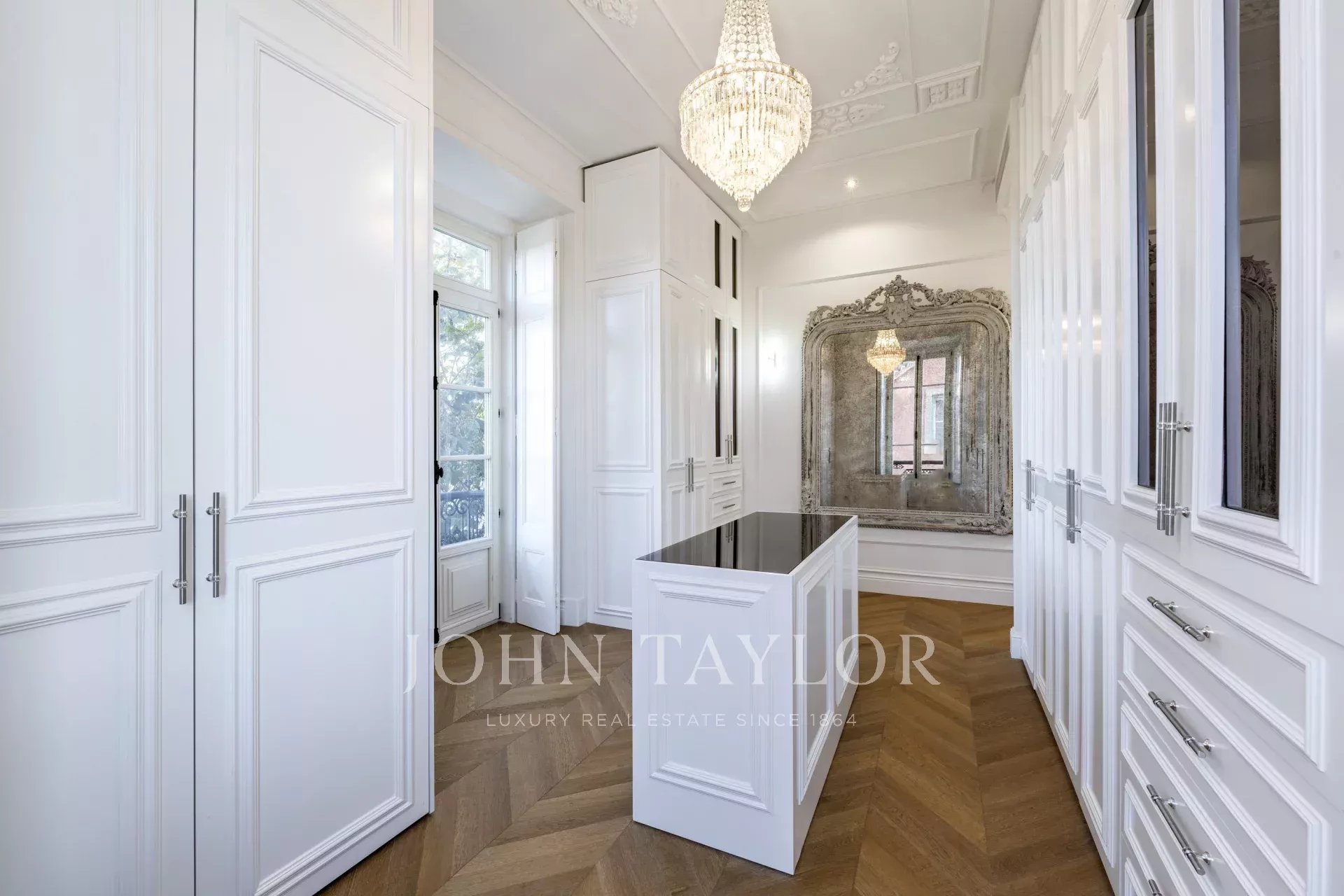 The lower level offers an entertainment area with a soundproof TV room, a wine cellar, sauna, laundry, and an additional bedroom.
