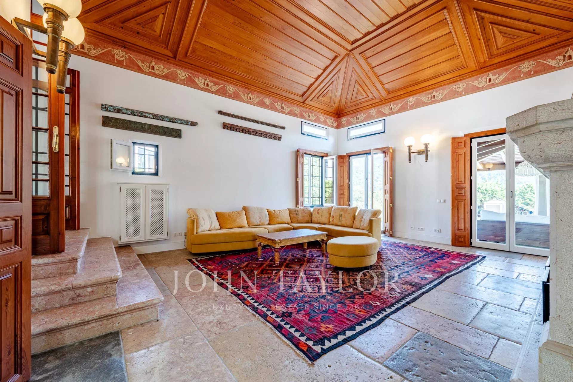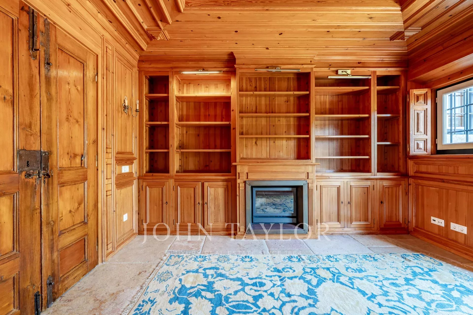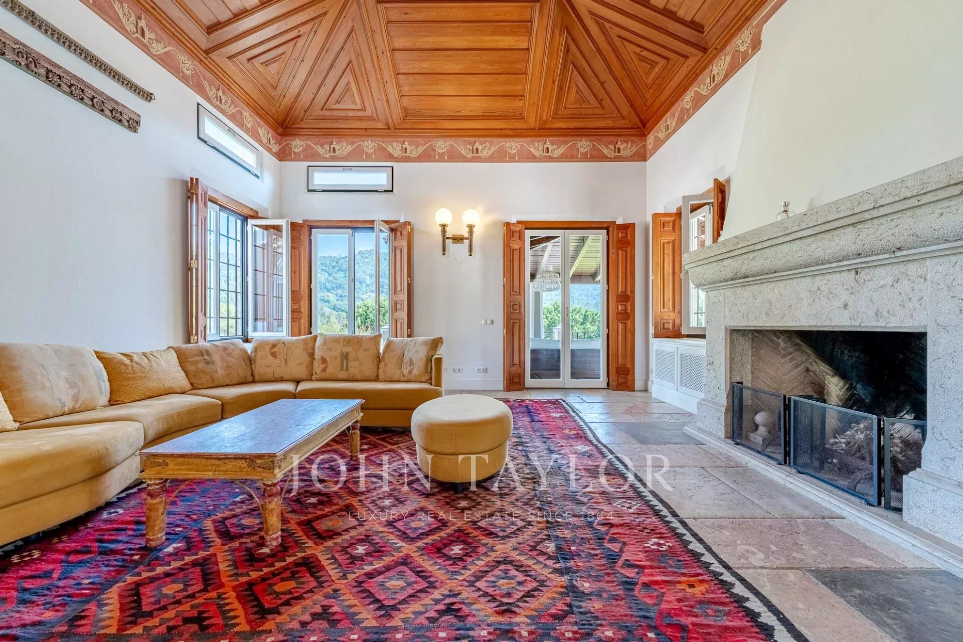 * A vast living room of 67 sqm with a stone fireplace.