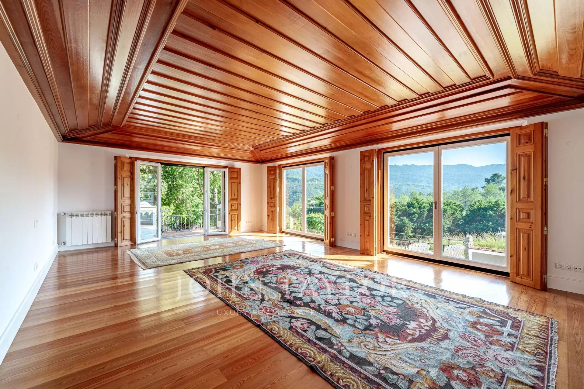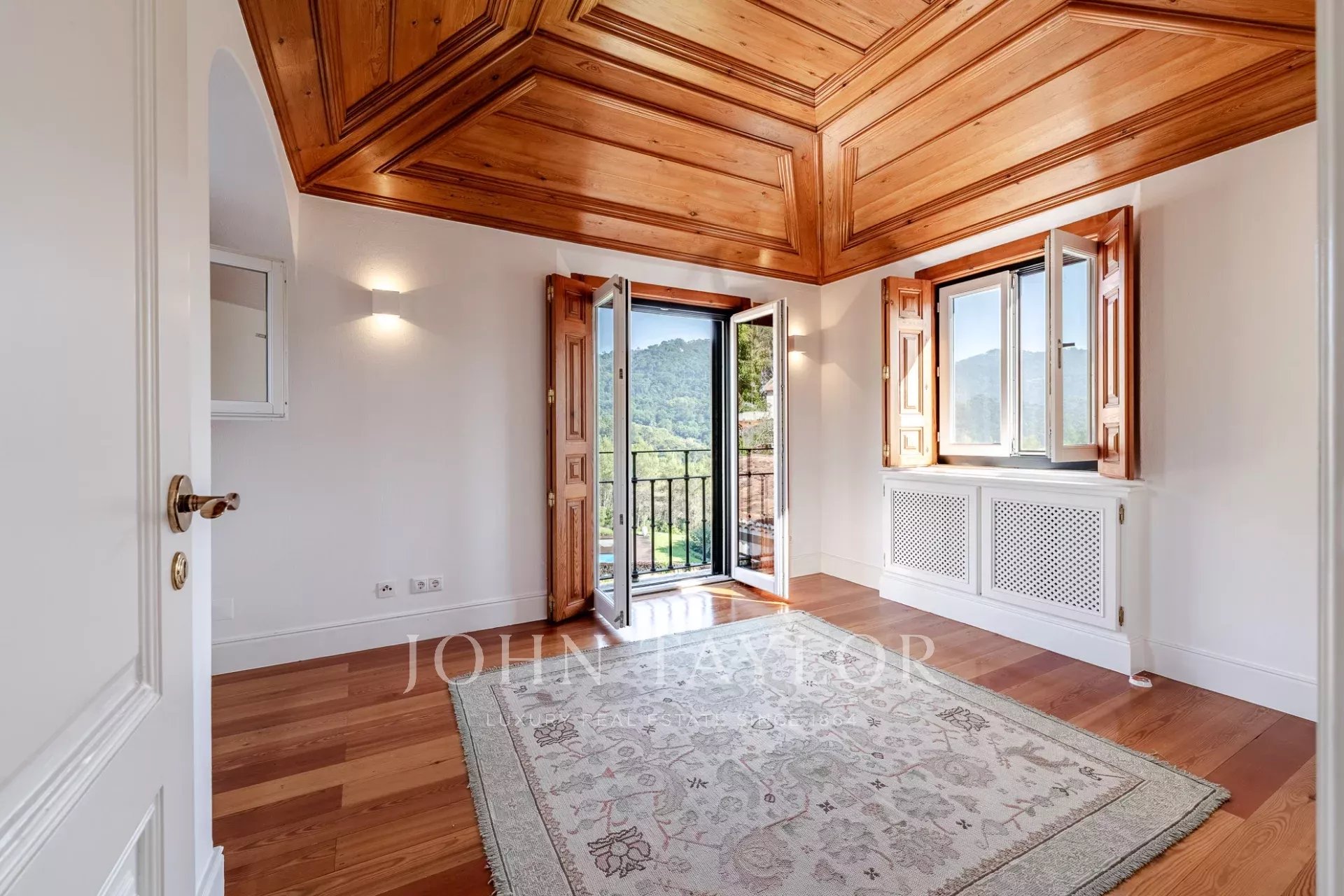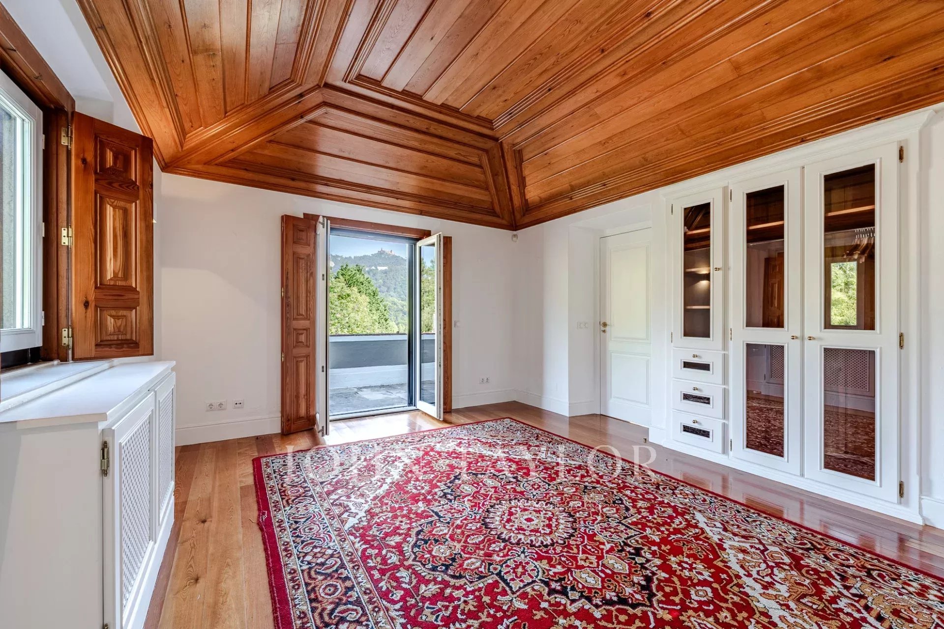 * Spacious master suite with floor-to-ceiling windows, two walk-in closets, and a private terrace offering breathtaking views over the hills of Sintra.