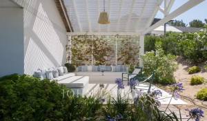 The 496 m² Comporta cabana-style villa features 7 separate cabins, including 5 suites, a spacious living room, an open-plan kitchen-dining room, and a separate laundry area.