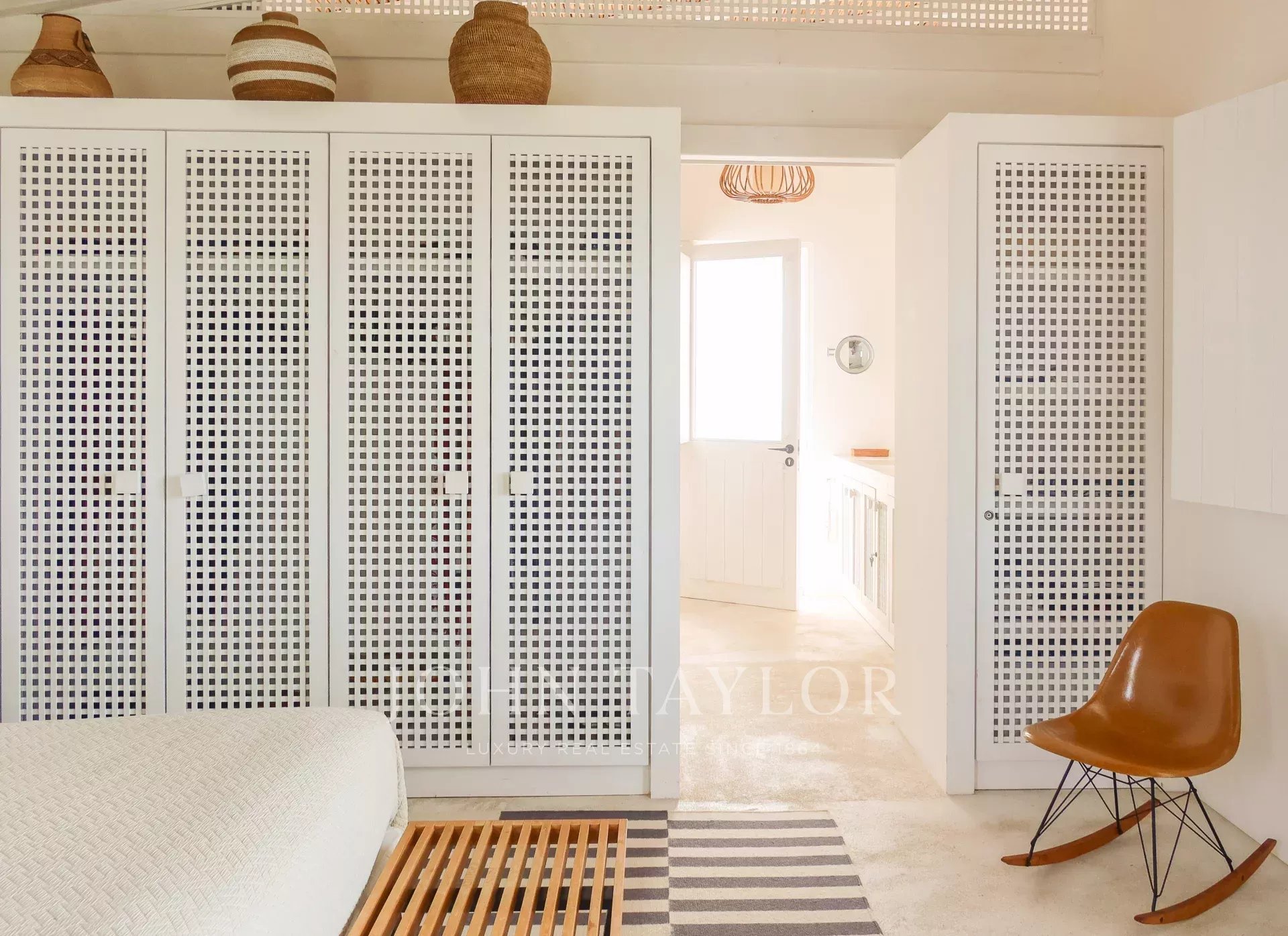 The 496 m² Comporta cabana-style villa features 7 separate cabins, including 5 suites, a spacious living room, an open-plan kitchen-dining room, and a separate laundry area.