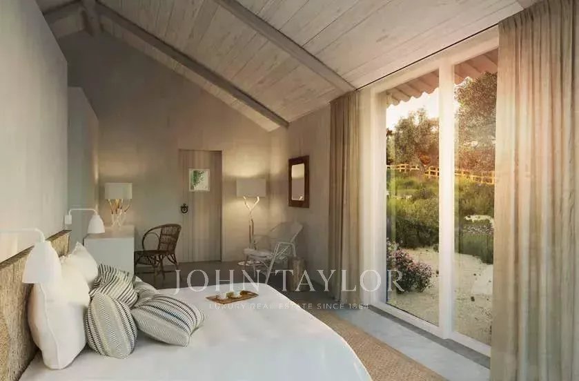 Outdoors, a 45 m² terrace, private garden, and swimming pool offer a peaceful retreat for leisure and relaxation. The east–west solar orientation ensures natural luminosity throughout the day.