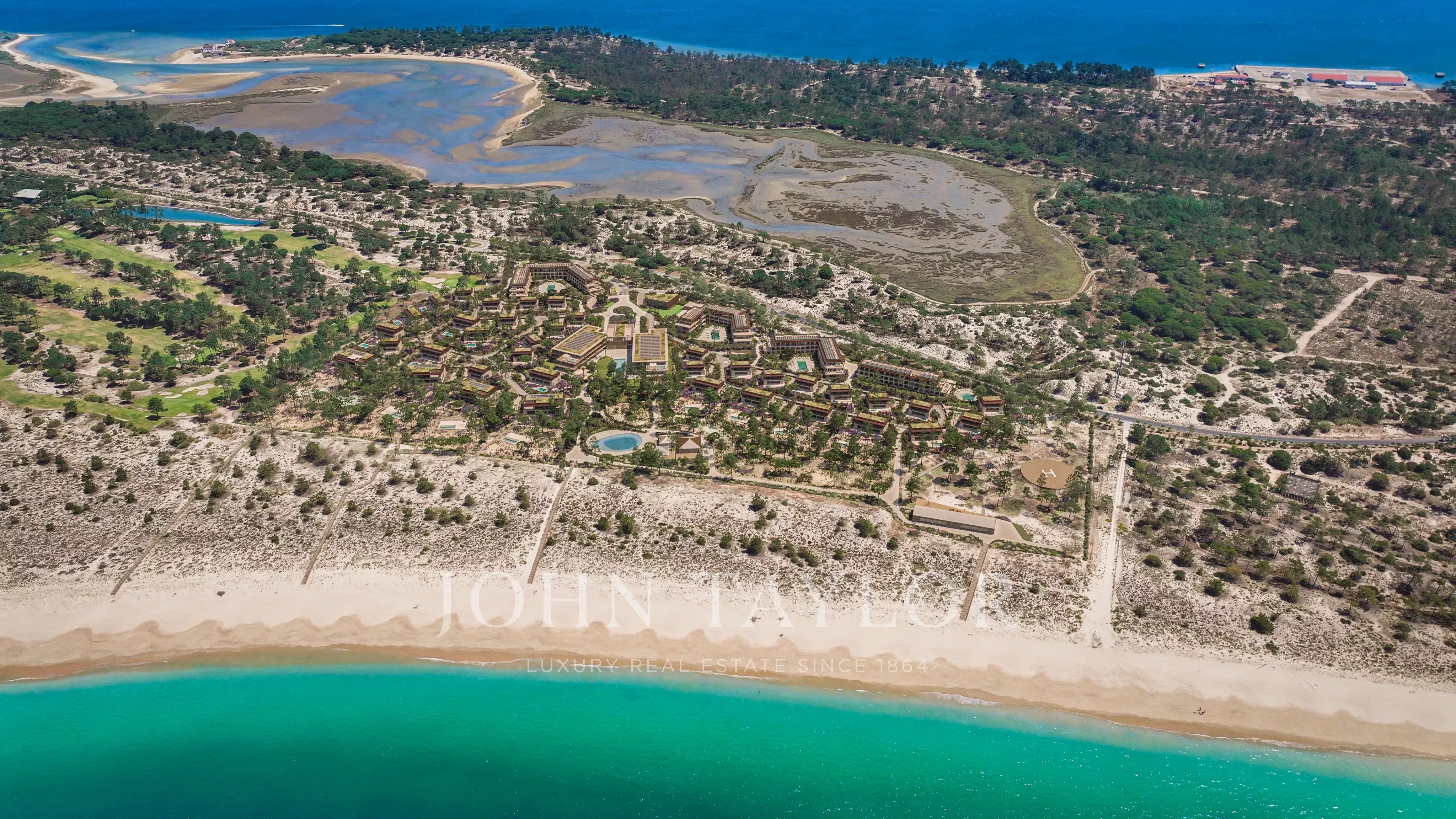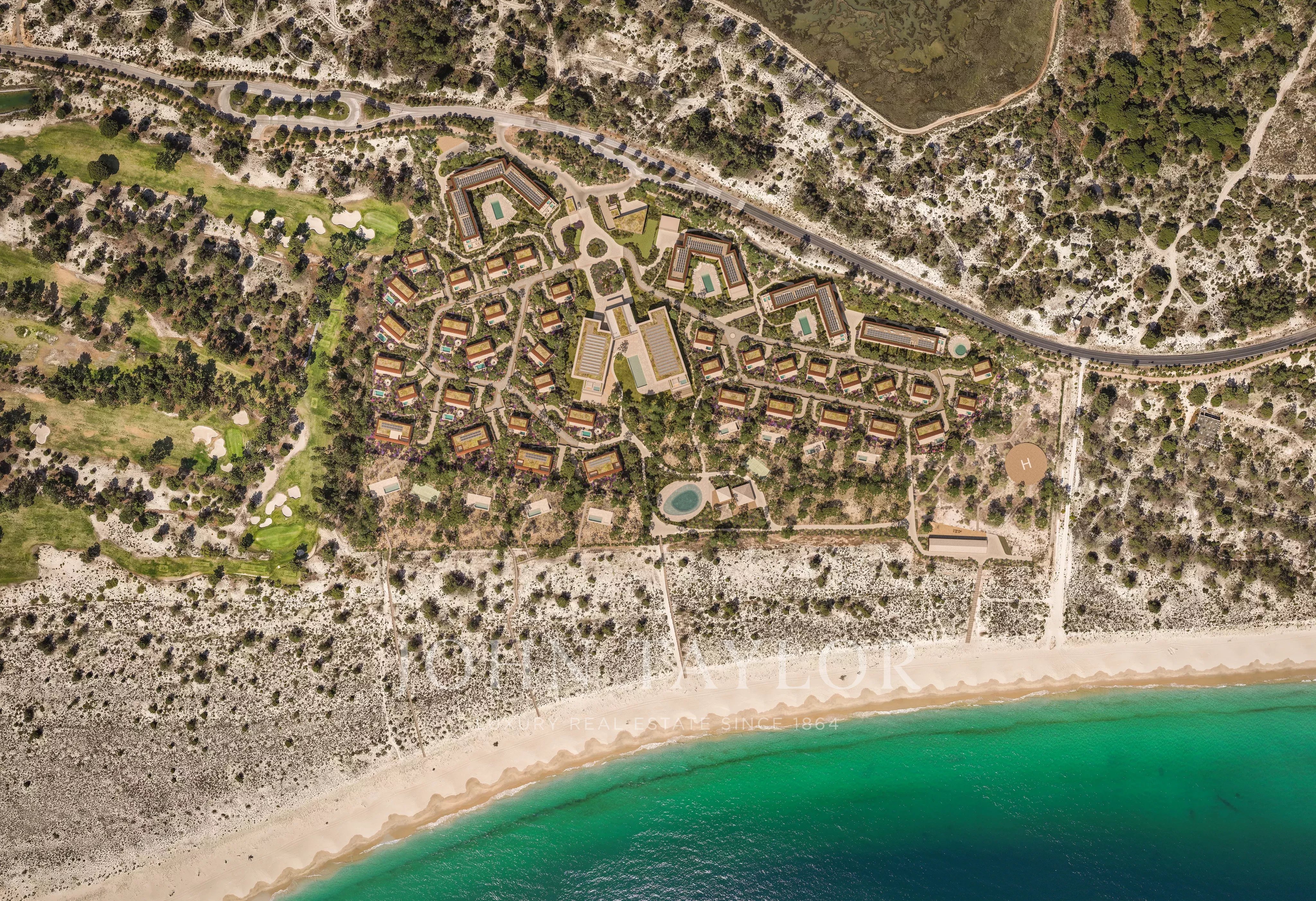 The resort is currently under development and will feature a luxurious 5-star hotel, 37 beachfront villas, and 71 stylish apartments, all designed to the highest standards. Amenities include 24-hour reception, underground parking, padel and tennis courts, a spa, saltwater pools, a beach club, a kids’ club, a gym, and a heliport. It’s also just 5 minutes from the renowned Troia Golf Club.