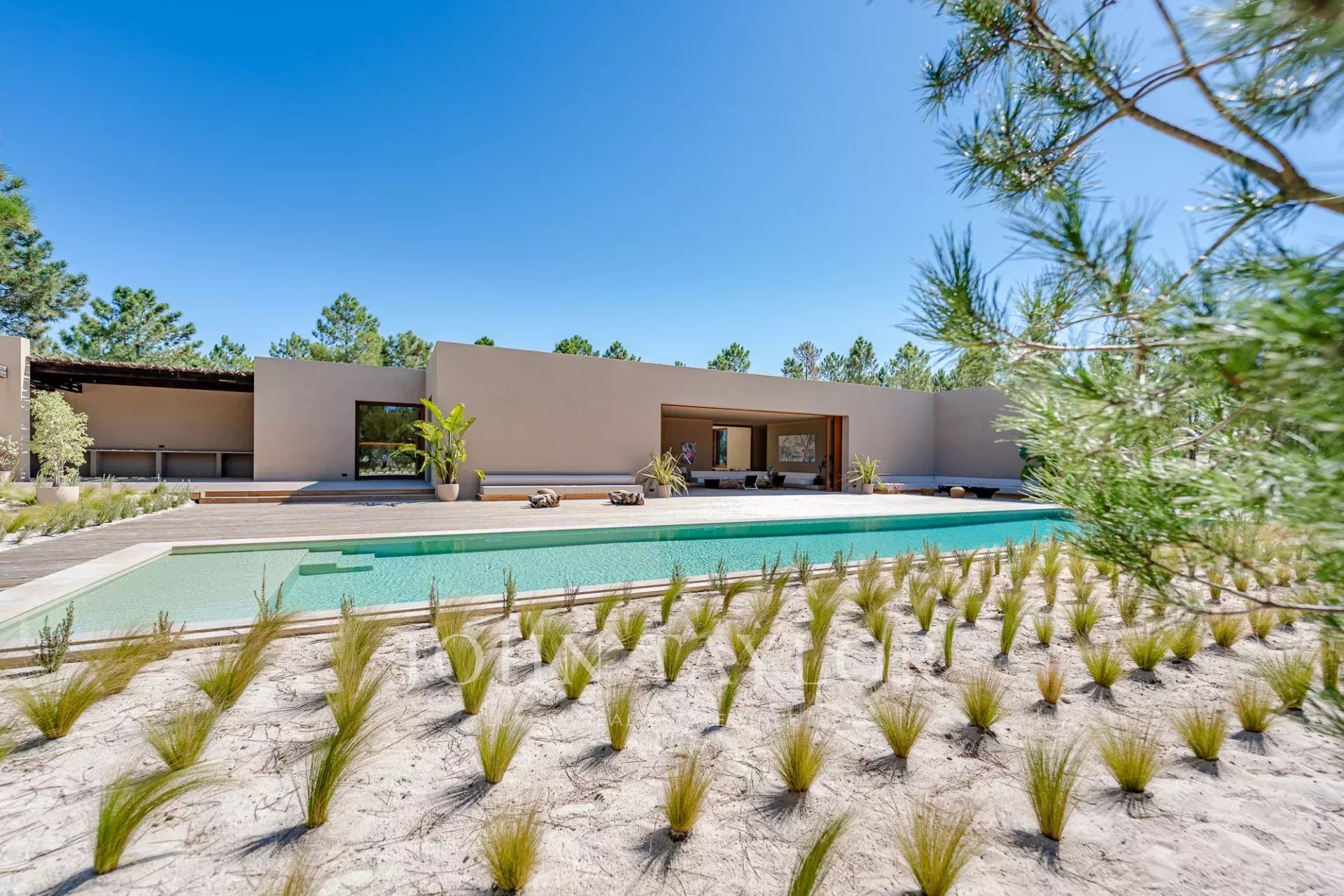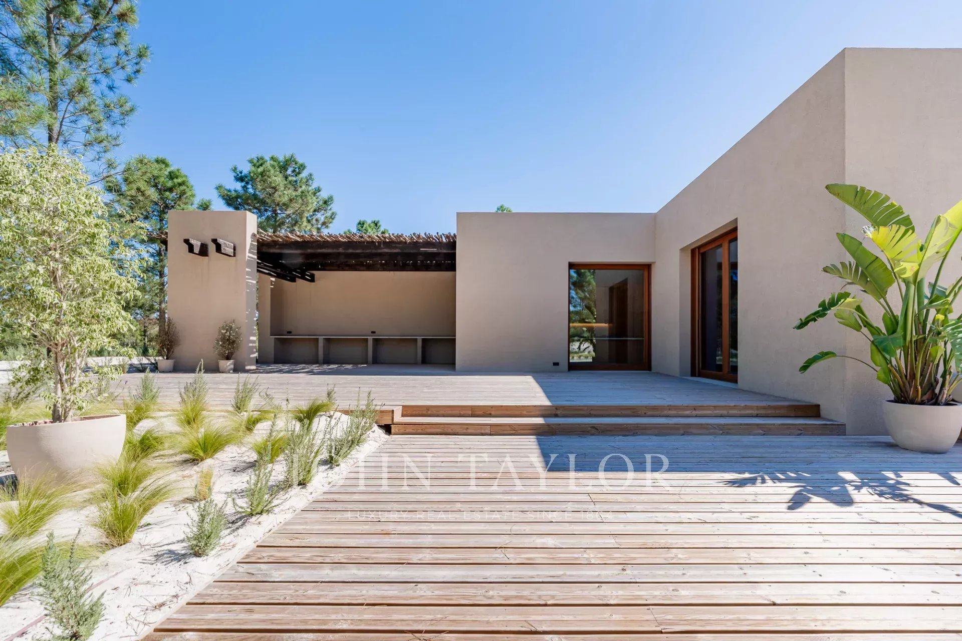 The villa includes four spacious en-suite bedrooms, each with a private wooden deck, and two living rooms offering breathtaking views of the 96 m² swimming pool, pine forests, and the natural beauty of Comporta. Designed for seamless indoor-outdoor living, it also features a fully equipped kitchen, pantry, and ample storage.