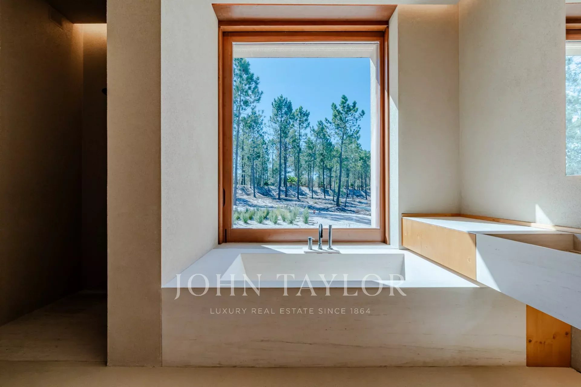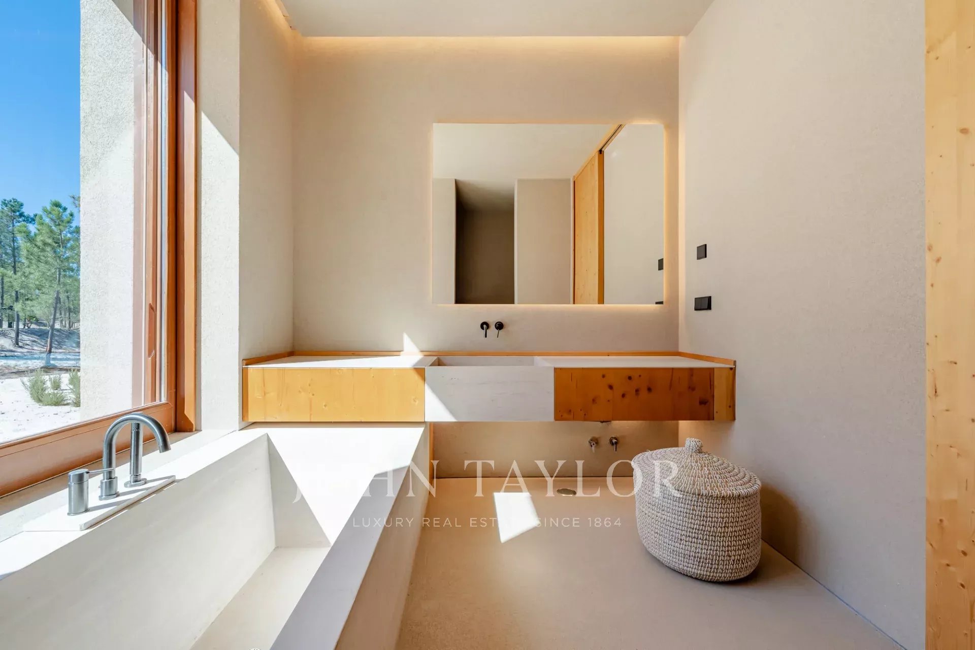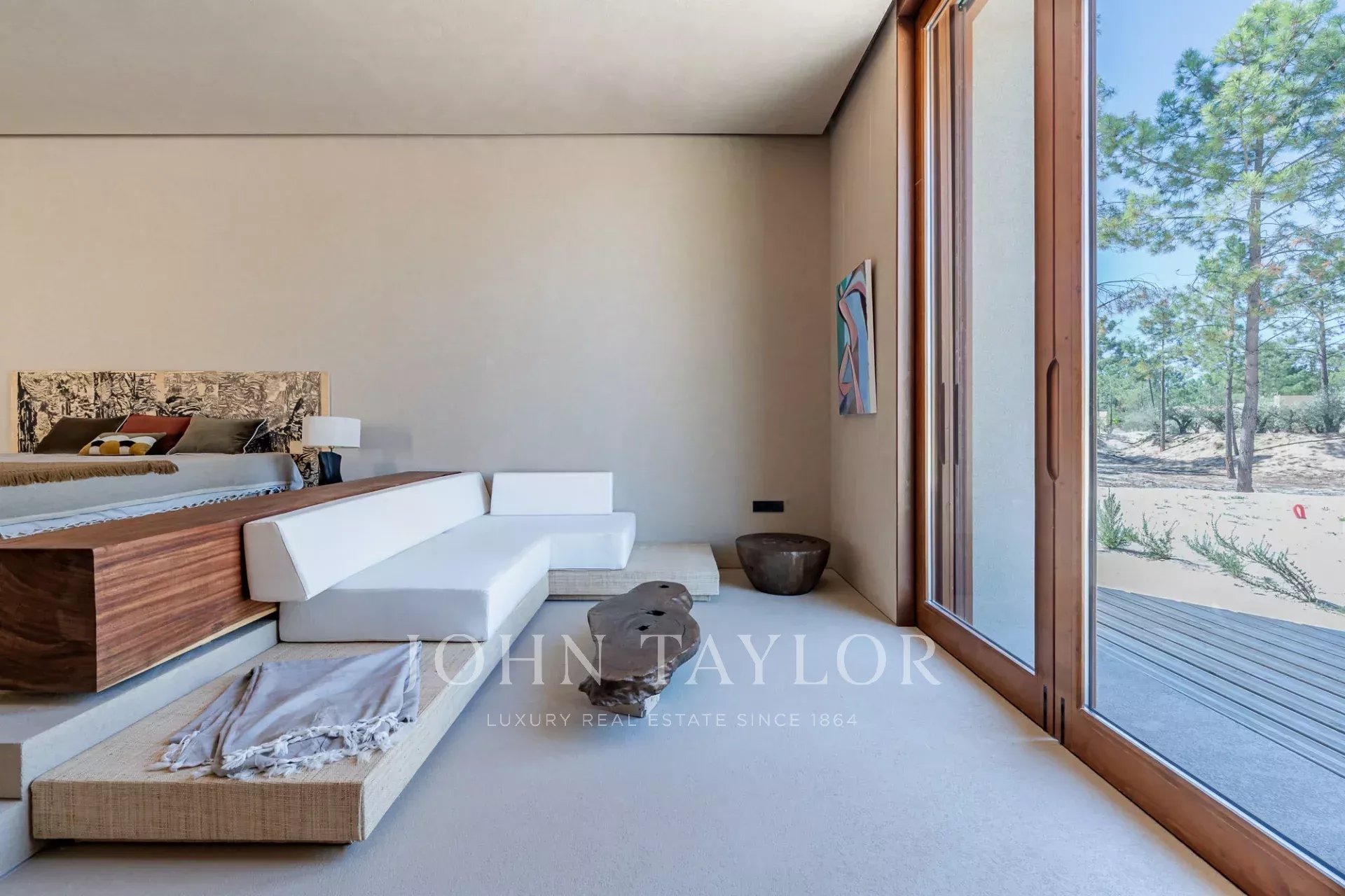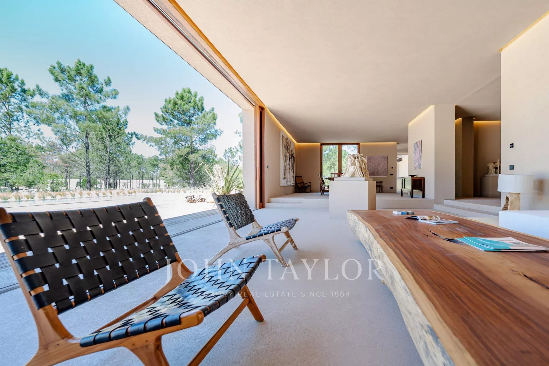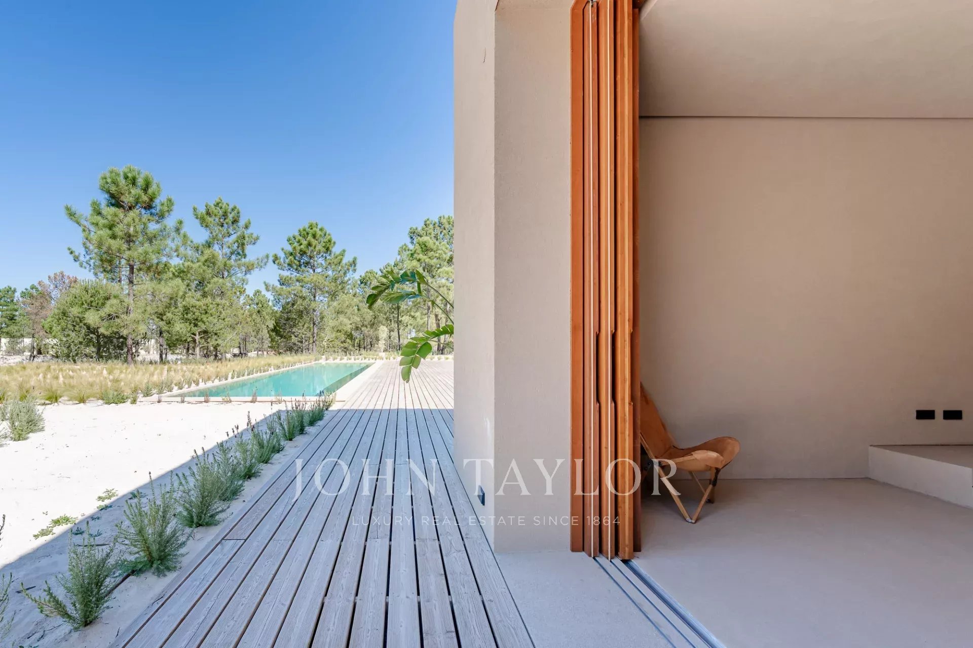 The property features four spacious en-suite bedrooms, each with its own private wooden deck, and two living rooms with stunning views overlooking the 96 sqm swimming pool and the other facing peaceful pine forests and the natural beauty of Comporta. The villa’s design embraces indoor-outdoor living, with a large, fully equipped kitchen, pantry, and ample storage.