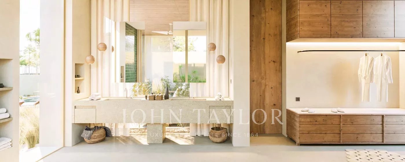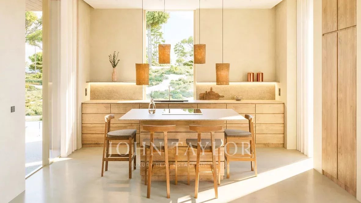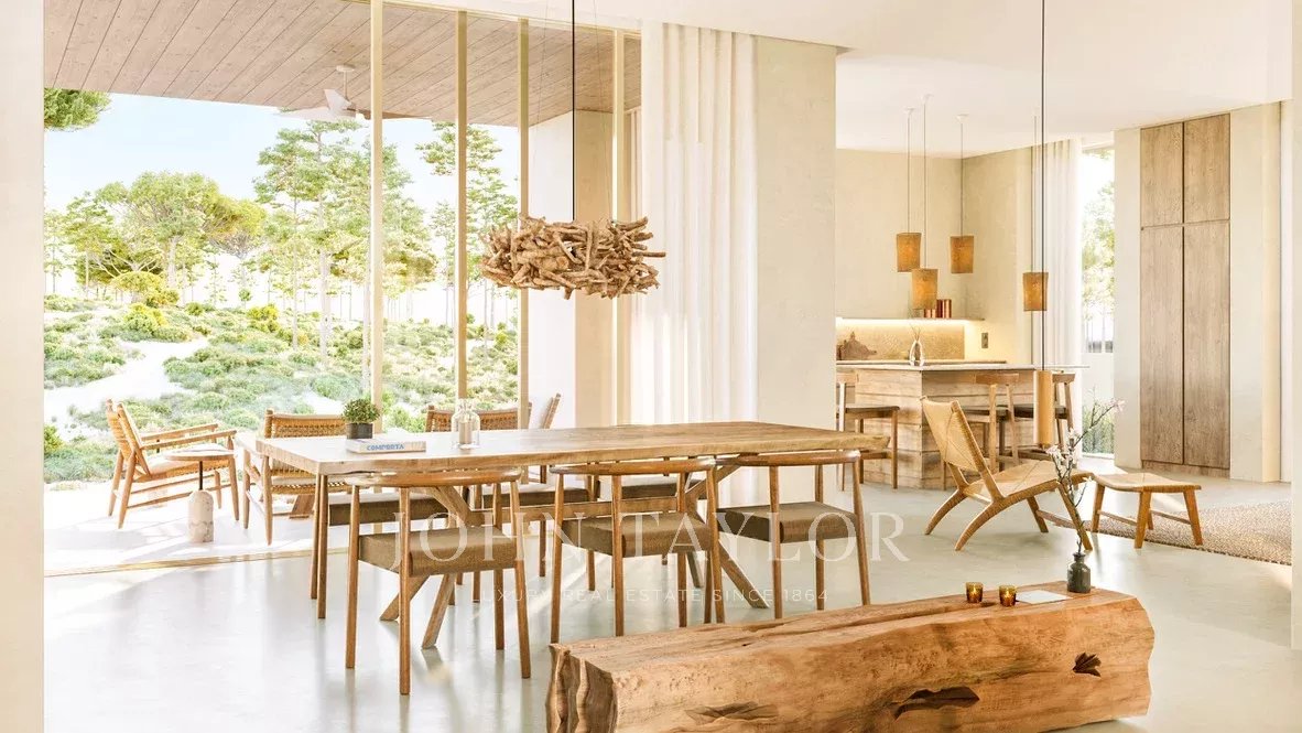Set on a 2,800 sqm plot, the 315 sqm villa includes two suites in the main house and a third suite in a separate guest house. The spacious open-plan kitchen, dining, and living area is designed to maximize natural light and panoramic views of the surrounding olive groves and cork oaks. Outside, an infinity pool, outdoor kitchen, fire pit, large terraces, and a two-car carport enhance the experience of living in harmony with nature.