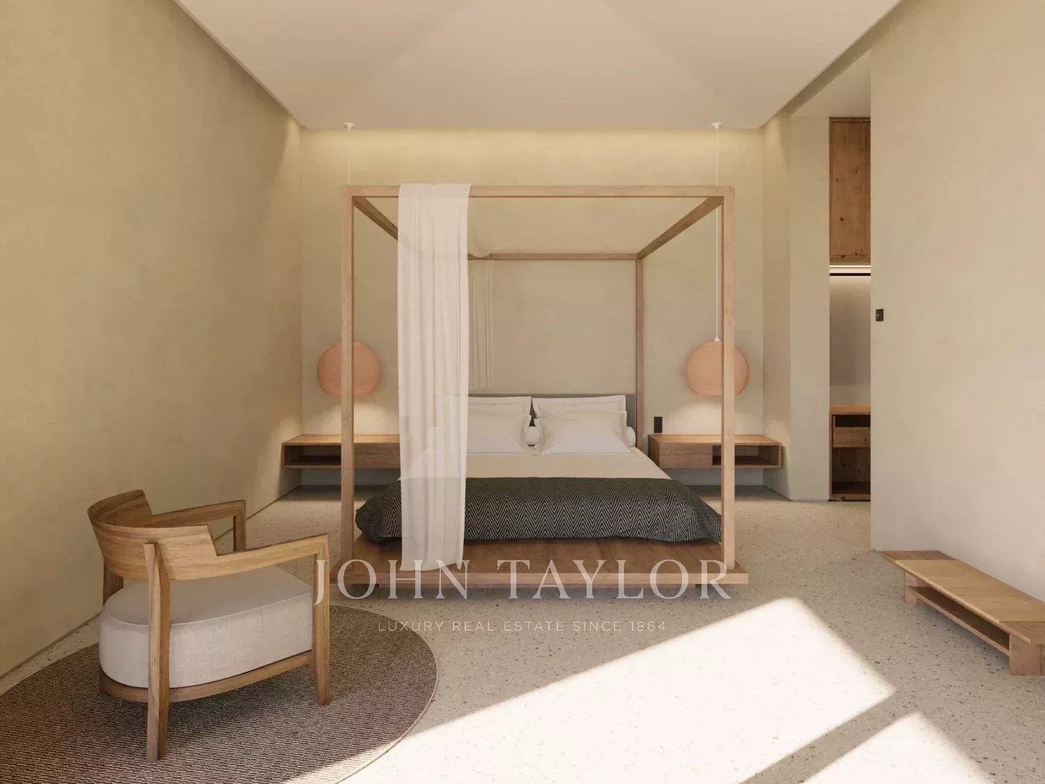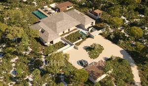 The property sits on a 13,300 sqm plot and has 665 sqm of built area. It includes four large suites with private terraces plus a smaller suite. The open-plan kitchen, dining, and living space connects to views of olive groves and cork oaks. Outdoor features include two swimming pools, an outdoor kitchen, fire pit, spacious terraces, and covered parking for two cars.