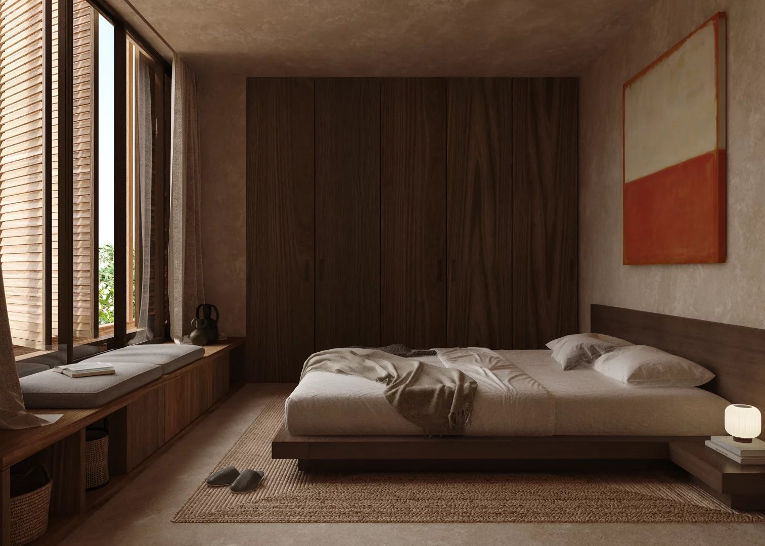 The architecture of the development is discreet and refined, designed to blend naturally into the surrounding landscape. Natural materials such as wood, stone, and clay are used throughout, creating warm, elegant interiors with a strong connection to the outdoors.