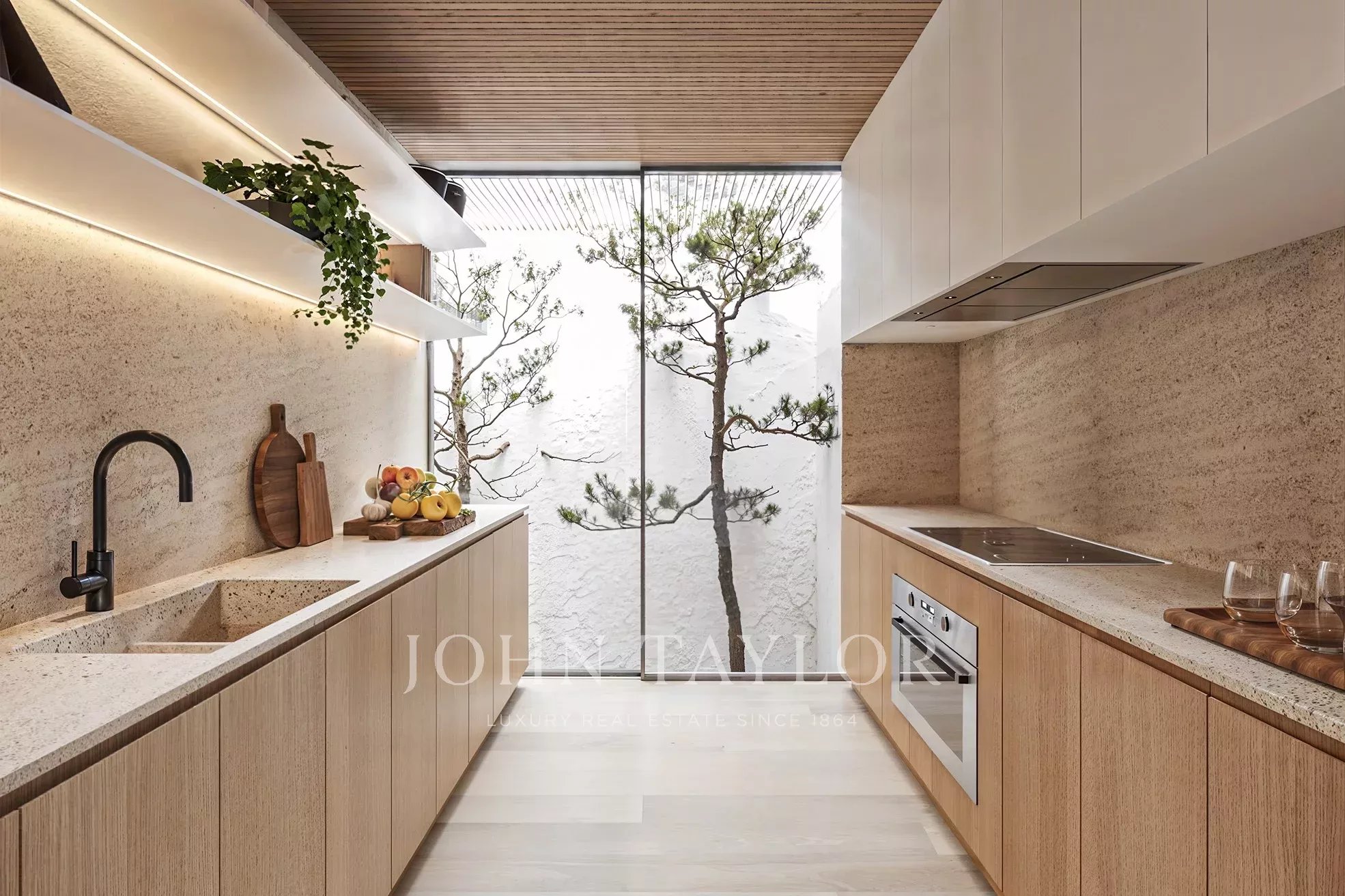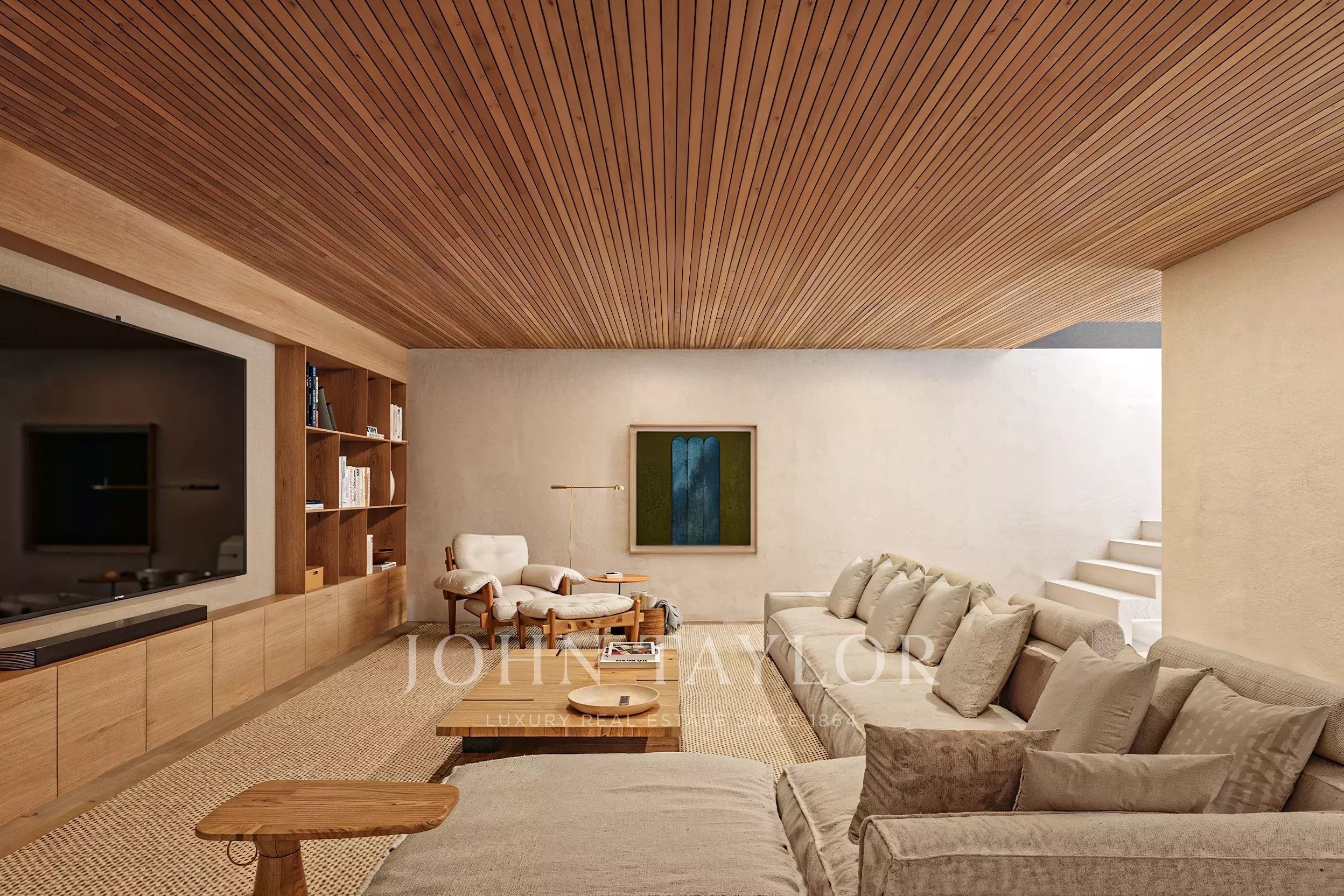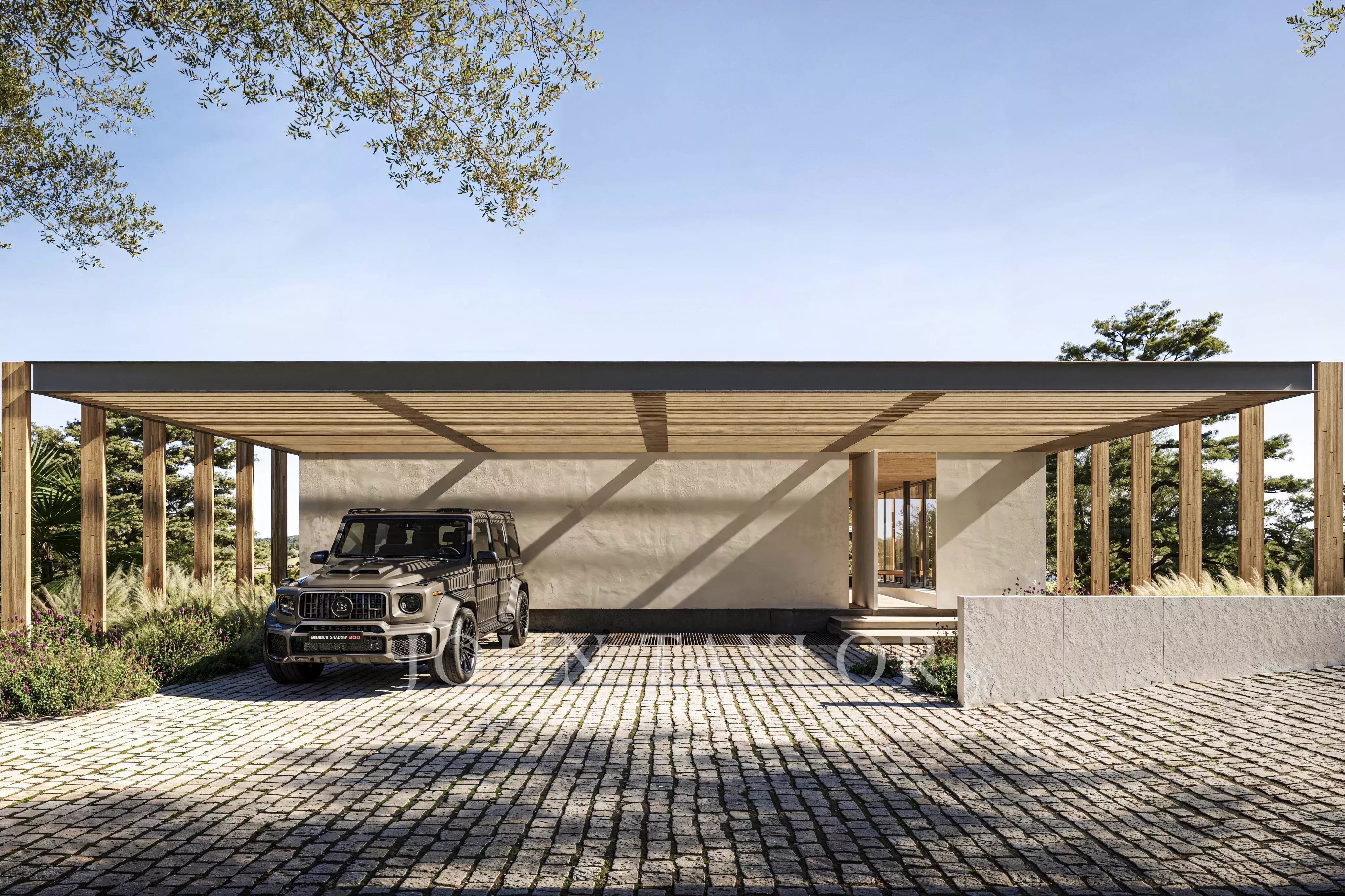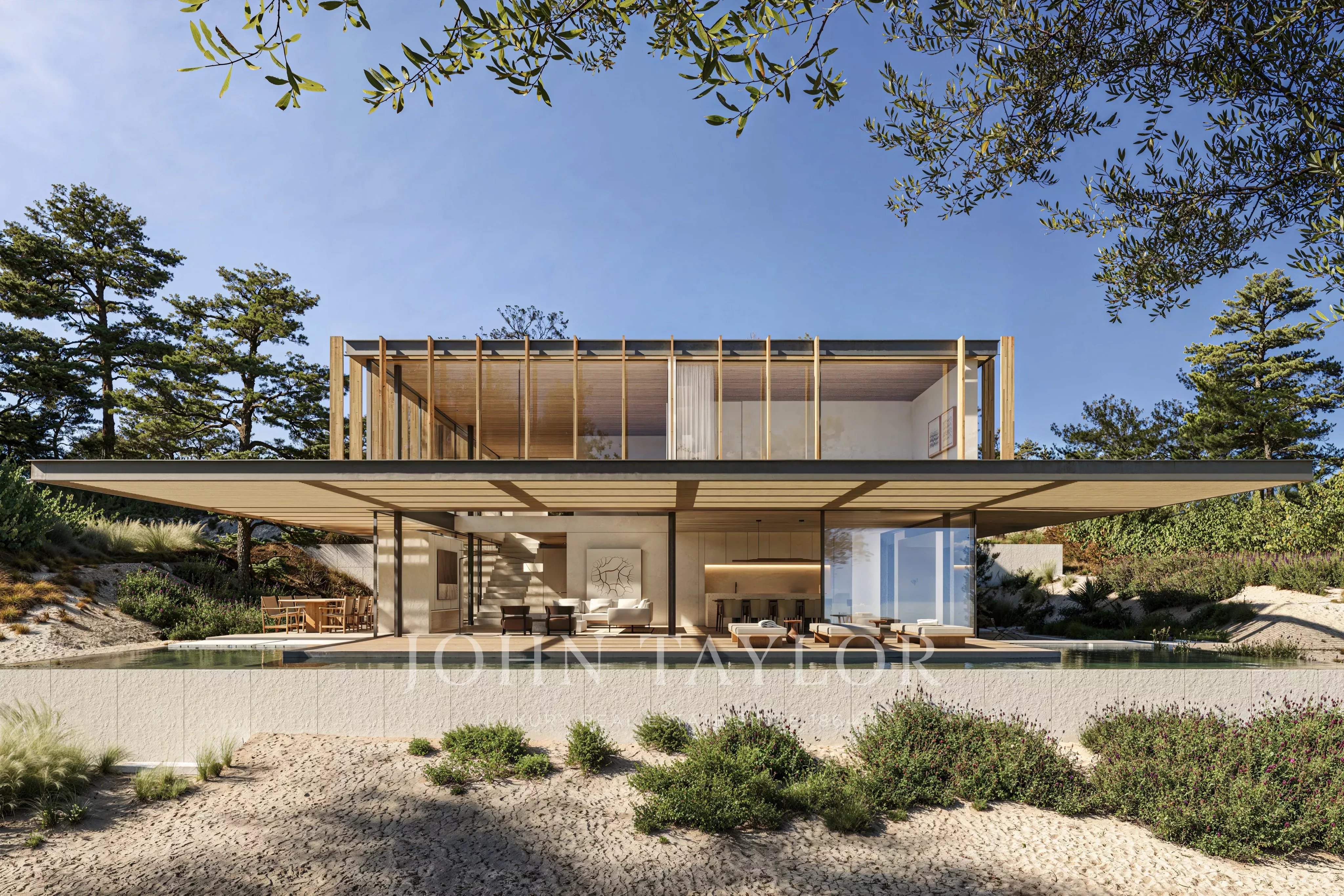 Set on a 1,000 m² plot, the villa offers approximately 330 m² of internal living area complemented by 125 m² of external deck space. The architecture explores transparency, lightness and fluidity, integrating interior and exterior through expansive glazing, pergolas and brise-soleils that create shaded transitional spaces.