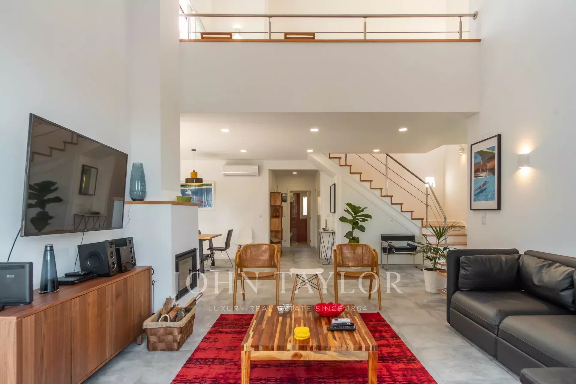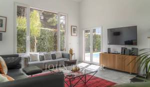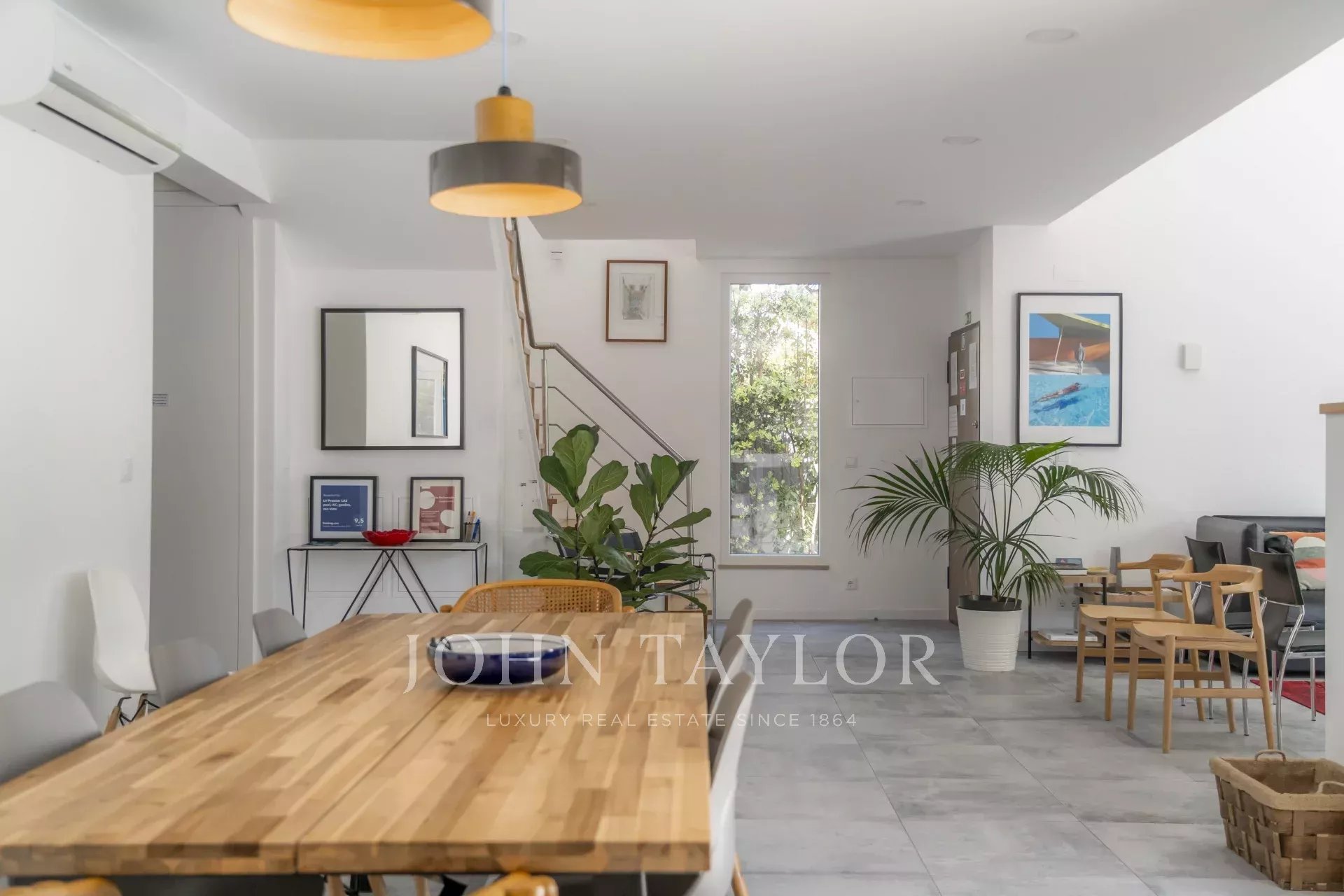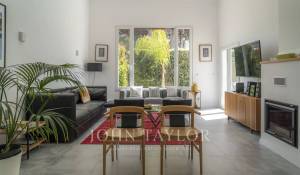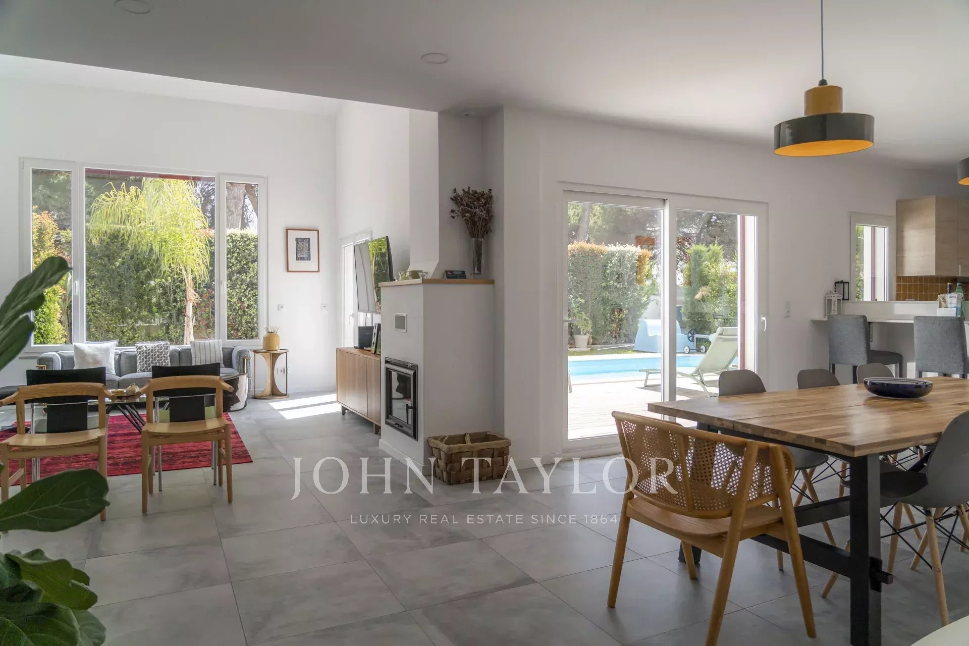 At the centre of the home is a fully equipped kitchen, designed for daily use and social moments. The living areas are bright and open onto the garden, where a swimming pool and outdoor space create a private area for rest and leisure.