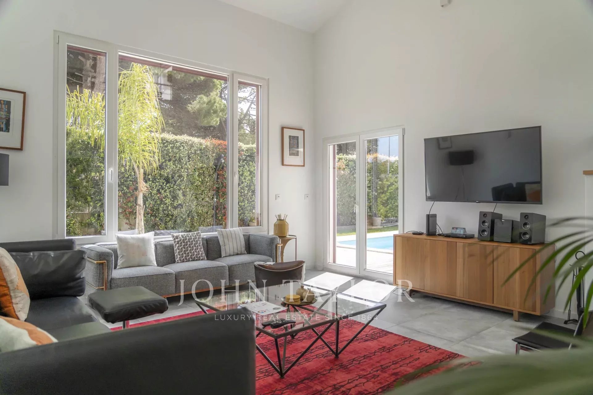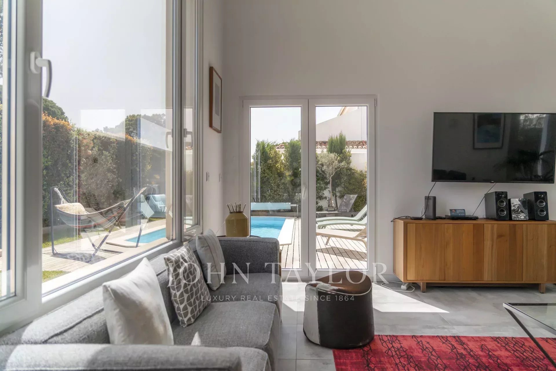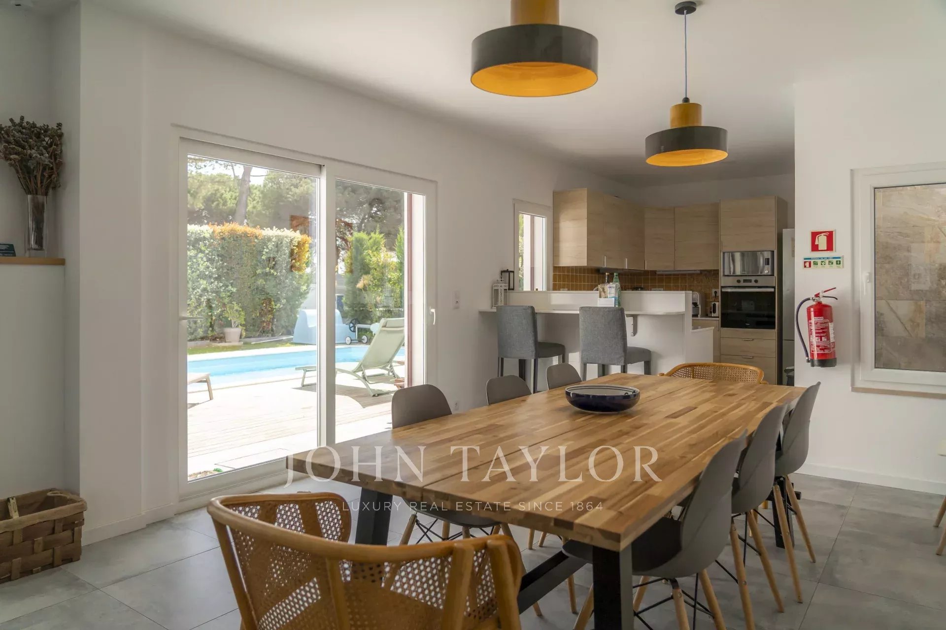 This modern house is located in the quiet area of Lagoa de Albufeira, Sesimbra, and offers a comfortable and spacious layout surrounded by nature. With four bedrooms and five bathrooms, it is well suited for family living or welcoming guests.