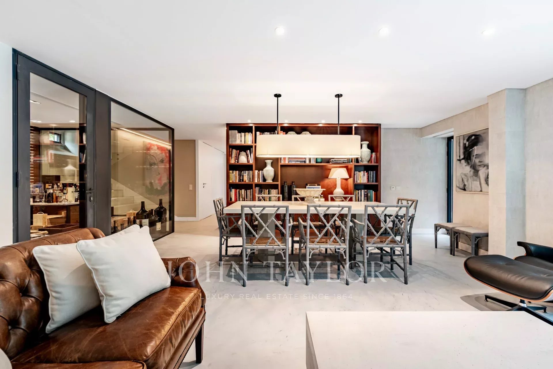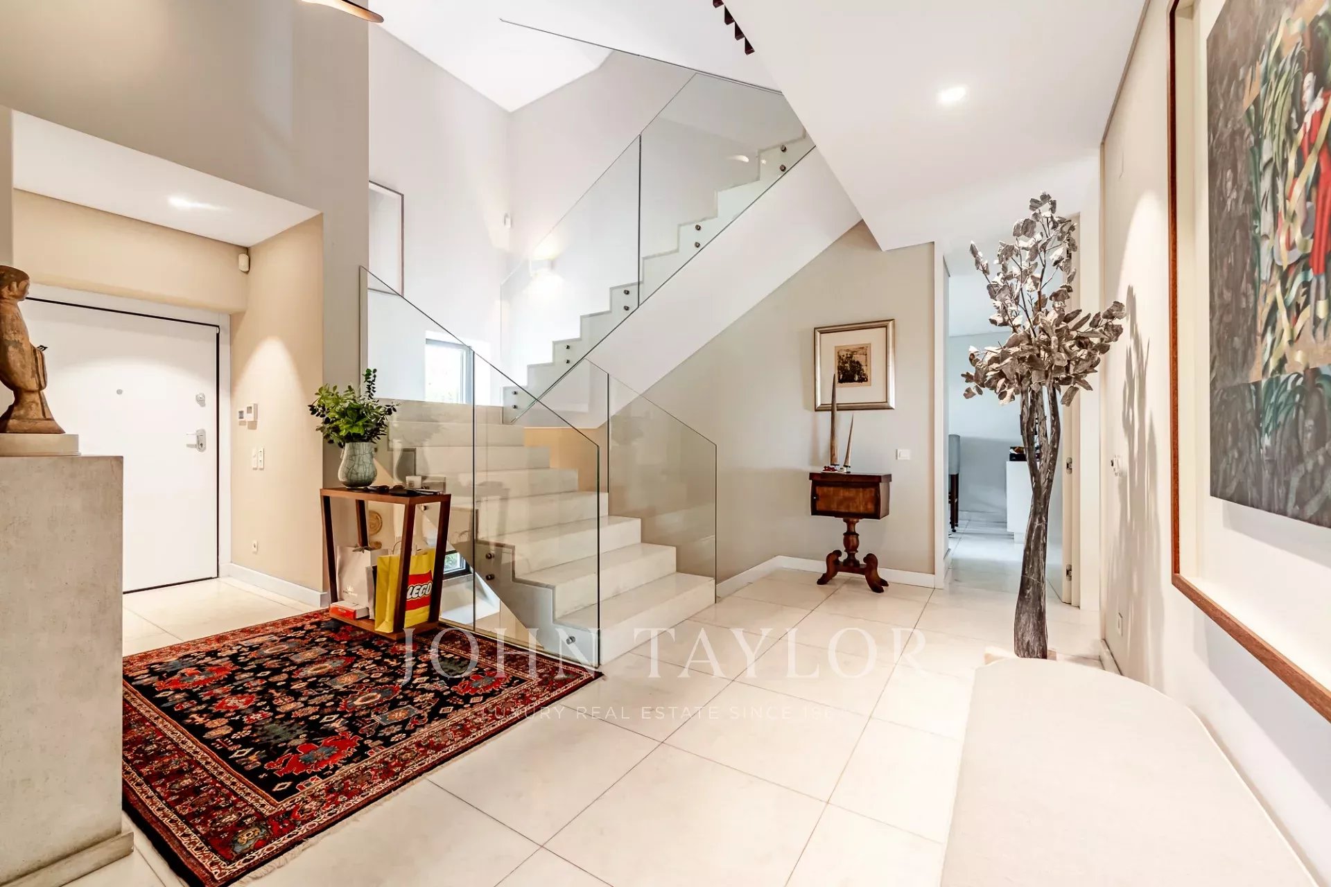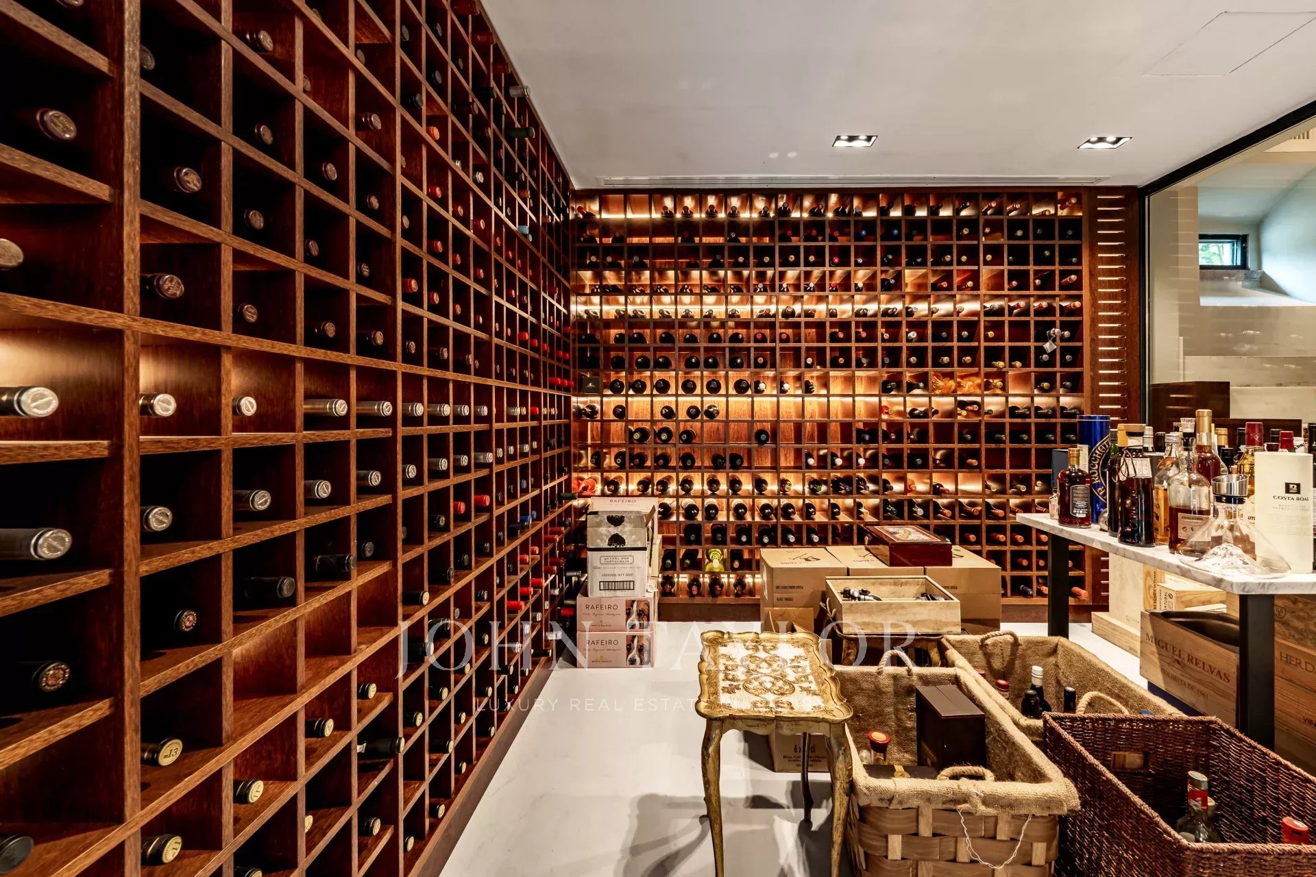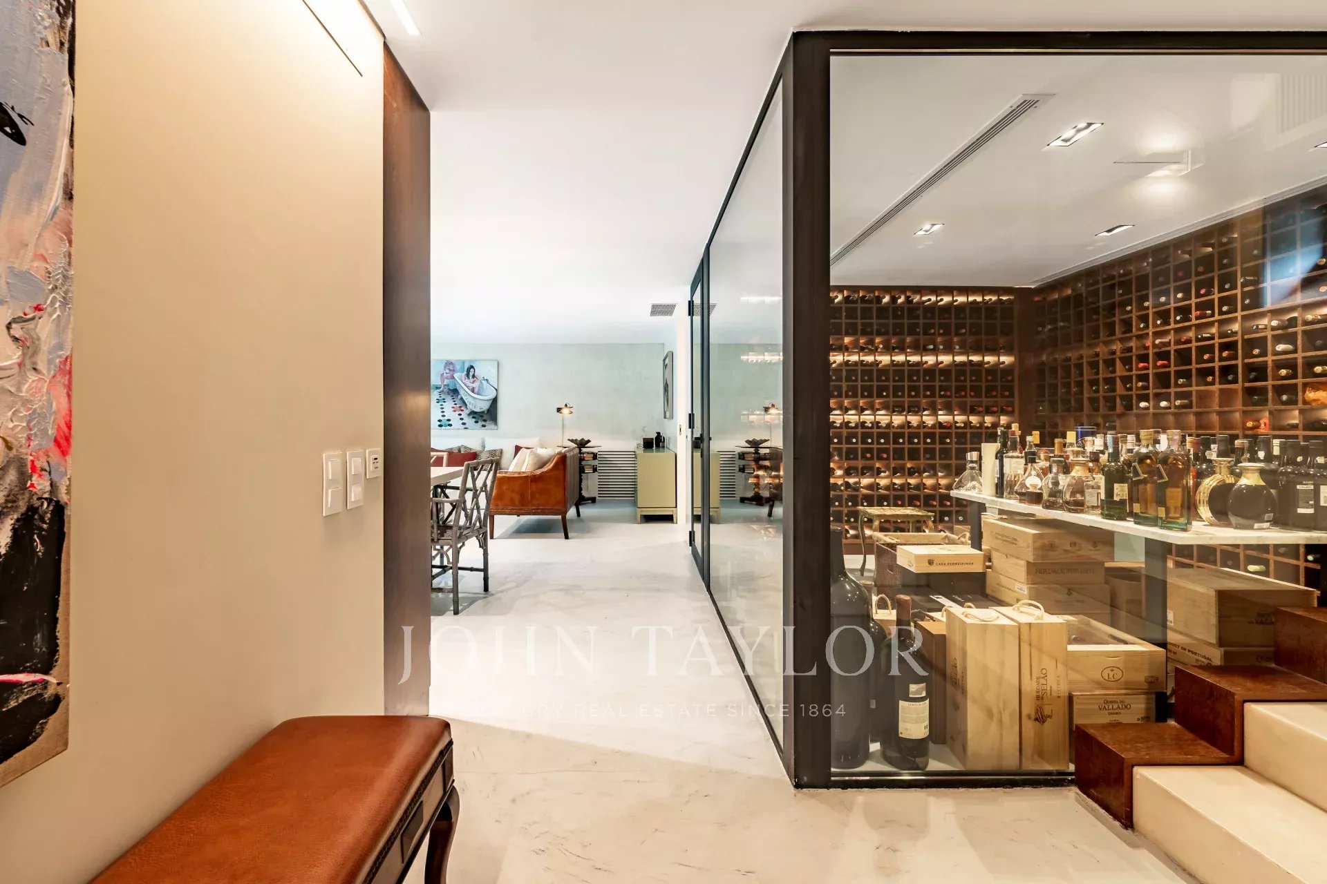 The lower ground floor comprises a large multi-purpose room, temperature-controlled wine cellar, support kitchen, two en-suite bedrooms, and a laundry area with storage and a full bathroom. The property also benefits from a lift serving all floors, central heating, underfloor heating, and solar panels, offering high levels of comfort and energy efficiency.