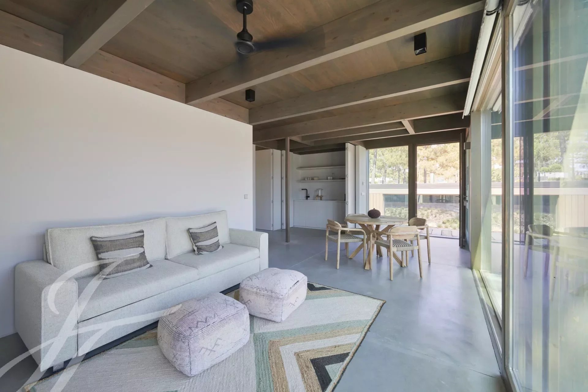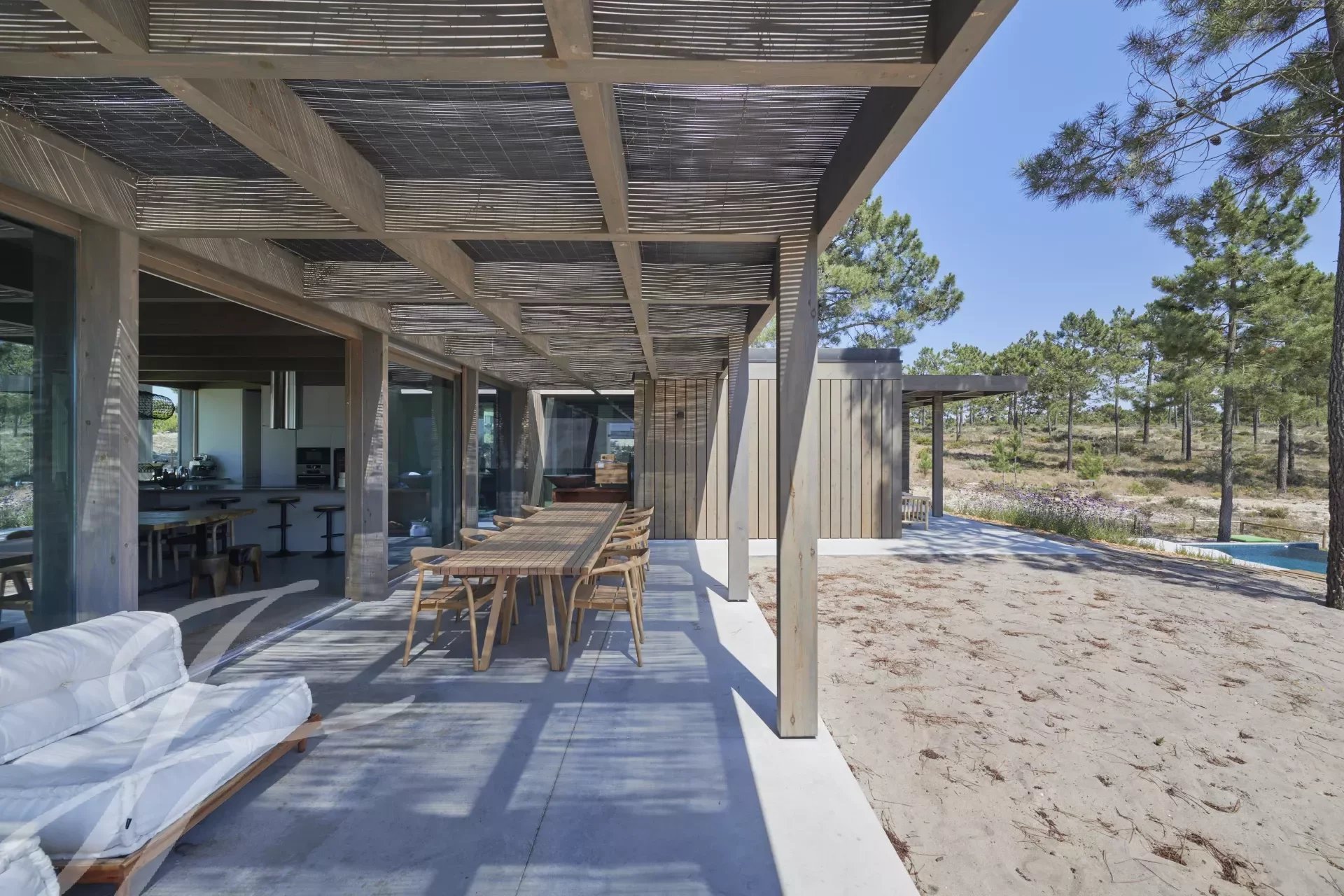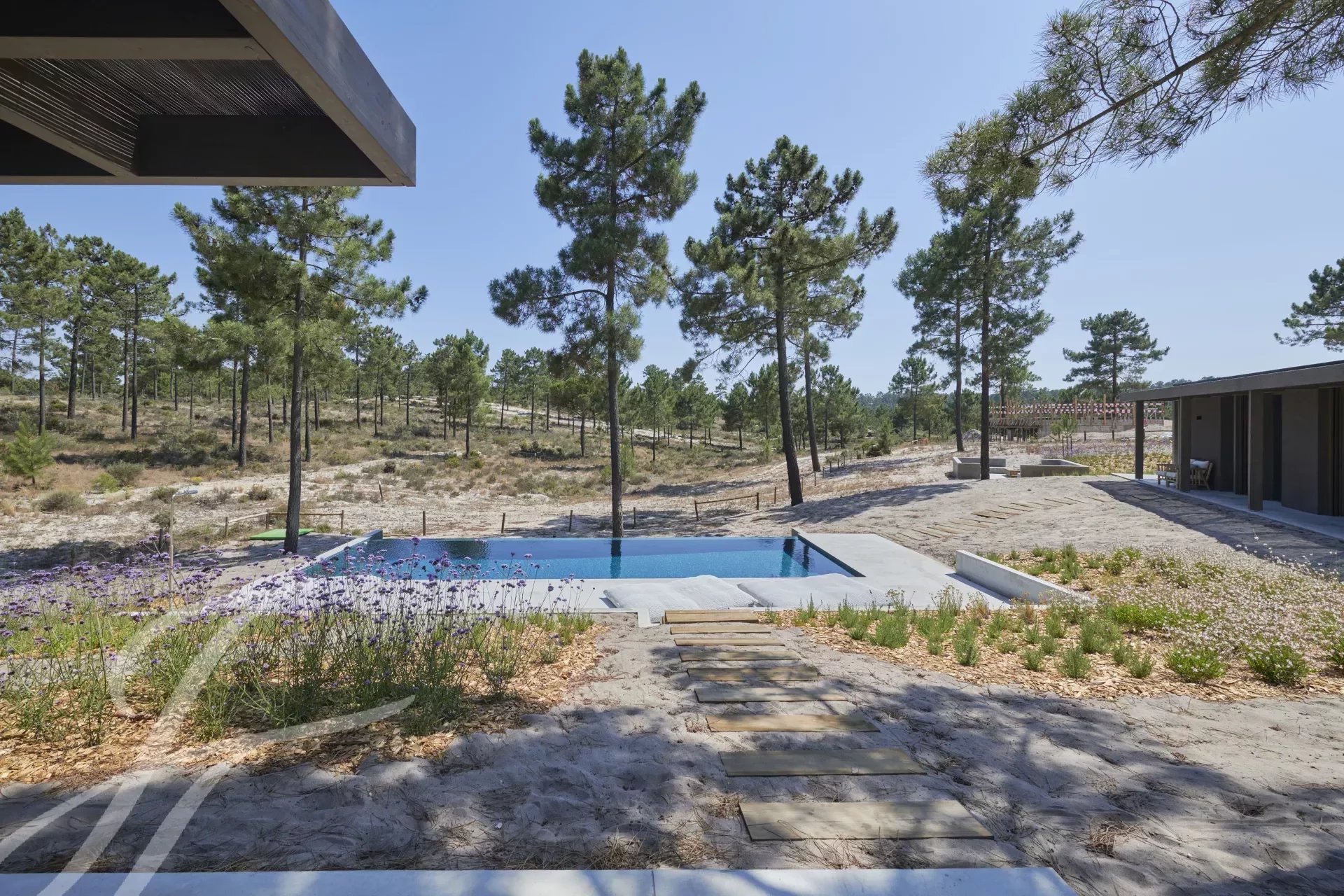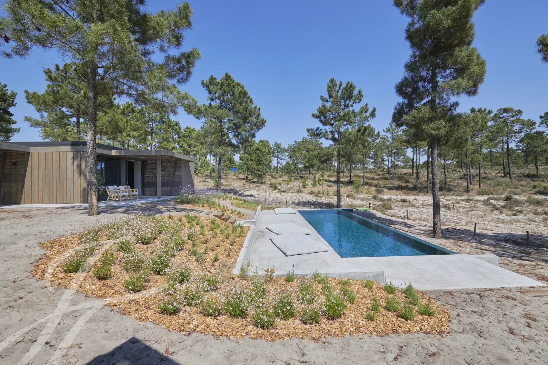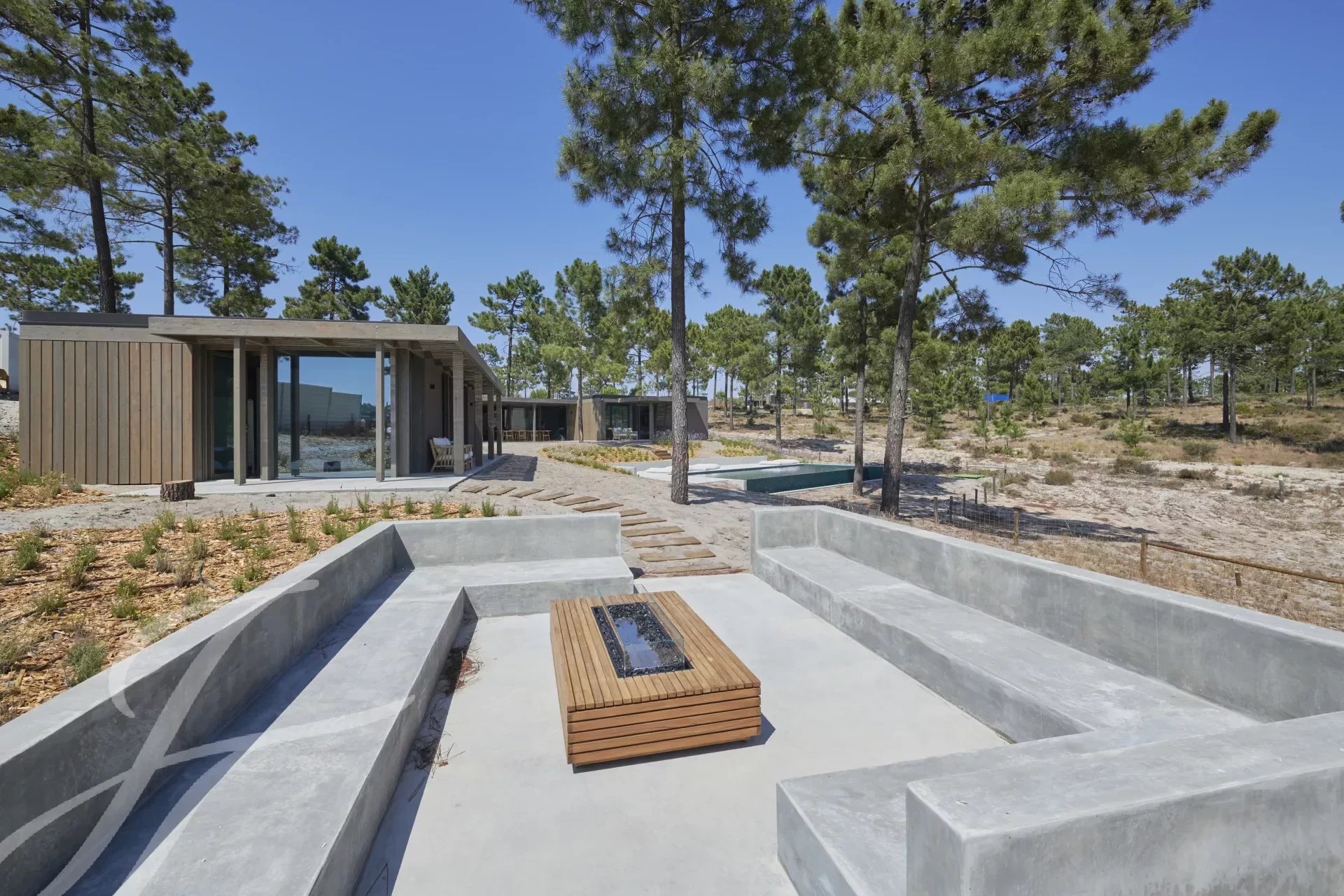 The villa has an excellent swimming pool with a south-facing deck where you can enjoy the view of the pine forest and the Comporta sun. Continuing from the pool you can walk to the fire pit where you can enjoy the surrounding nature in a relaxed and sophisticated atmosphere.