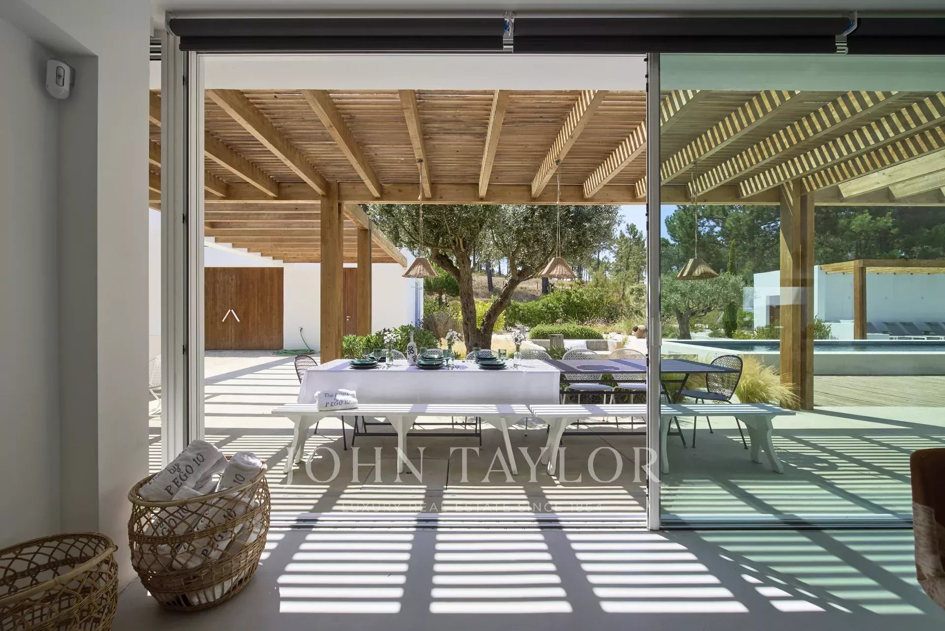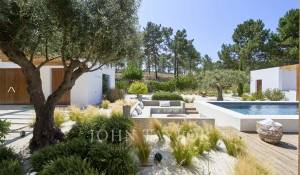 It comfortably accommodates 8 adults and 6 children, featuring 5 en-suite bedrooms, a large living room, dining area and an open-plan kitchen, its large sliding windows create an ideal connection between indoor and outdoor spaces. Outside, enjoy the pool, share unforgettable moments around the fire pit, under the starry sky of Comporta and enjoy delicious meals with family and friends. The terrace, with its stunning views, is the ideal setting to relax and enjoy the magnificent sunset. With a privileged location, just a few minutes from the most beautiful beaches in the region, just 5 minutes from the Dunas Golf Course and 3 minutes from the village of Carvalhal, where you will find various services and local shops, Casa Ammos is perfect for a memorable holiday.