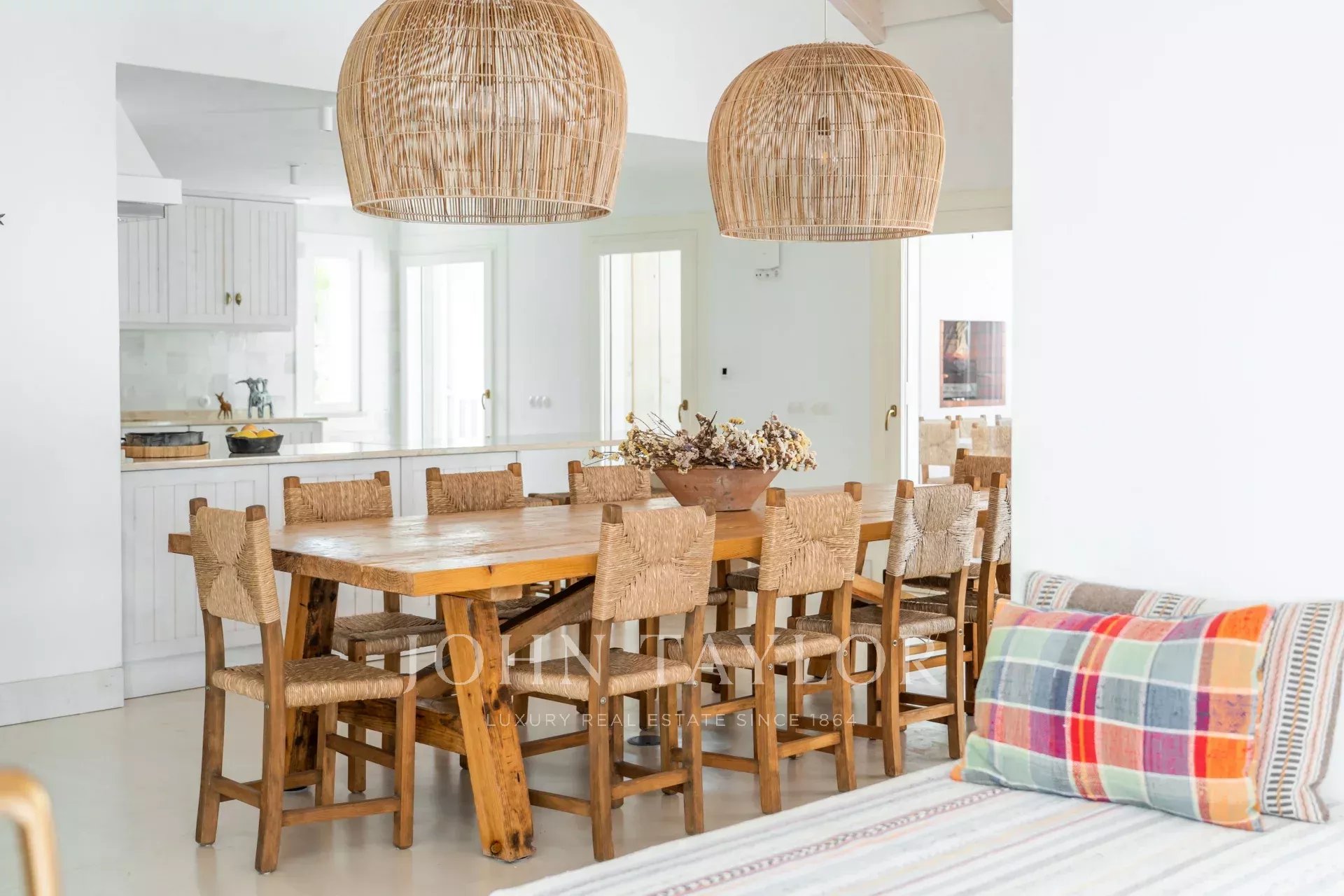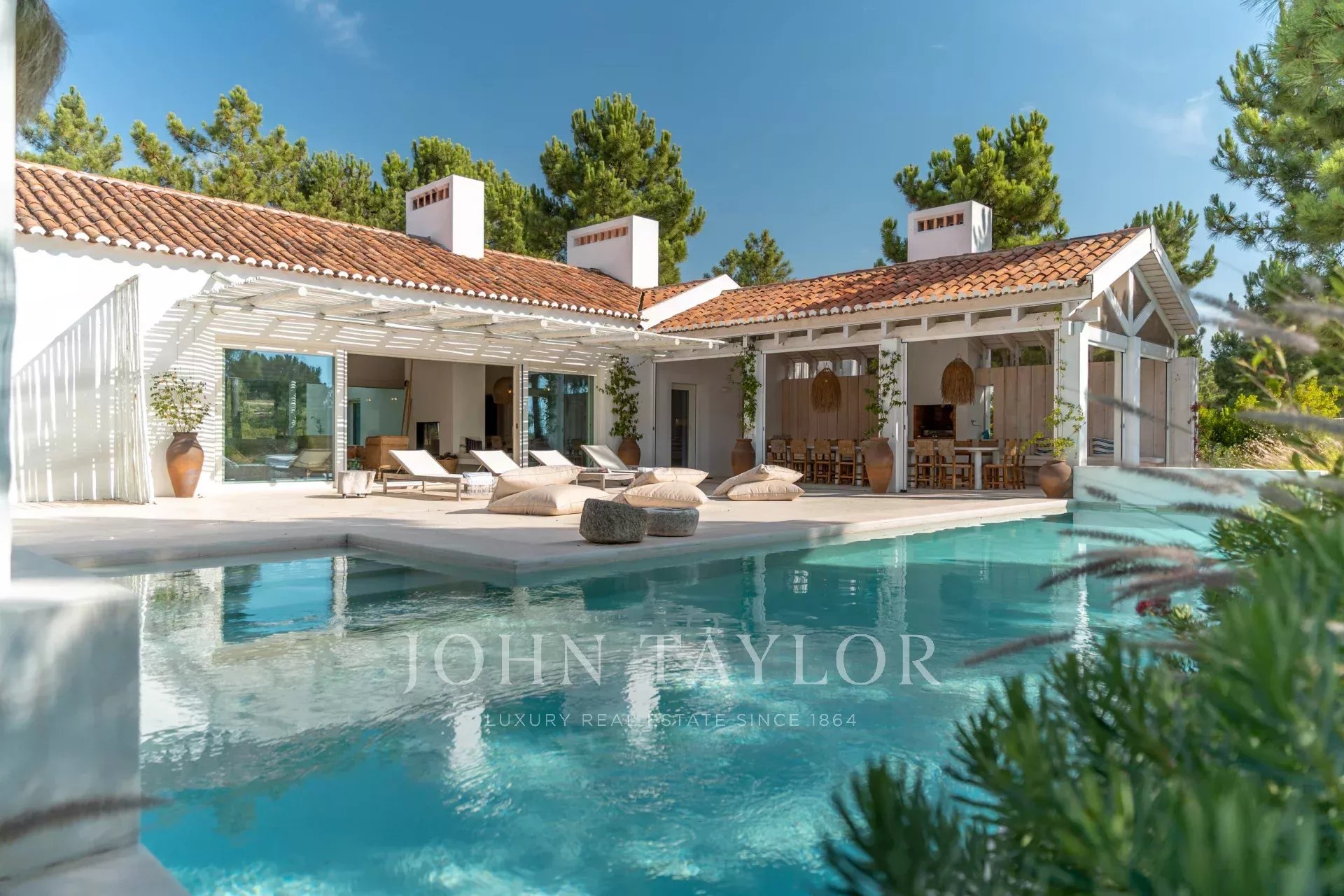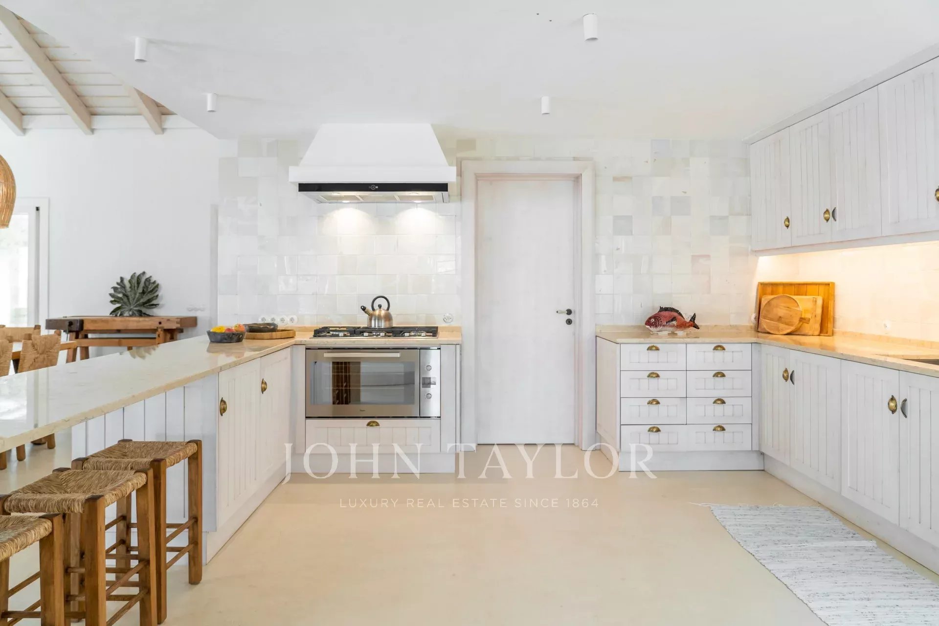 The interior spaces extend naturally to the outside, in a welcoming and relaxed atmosphere. The fully equipped kitchen opens onto the porch and outdoor dining area, ideal for long summer dinners.