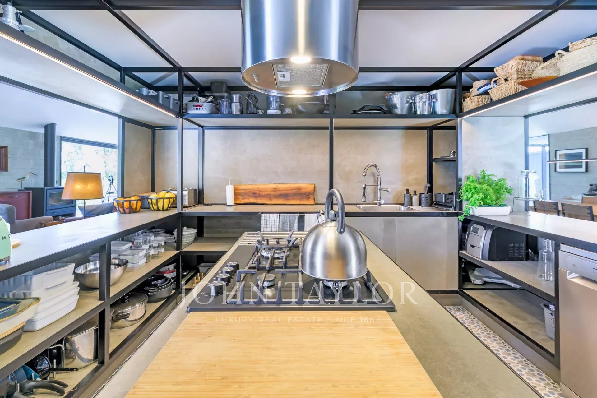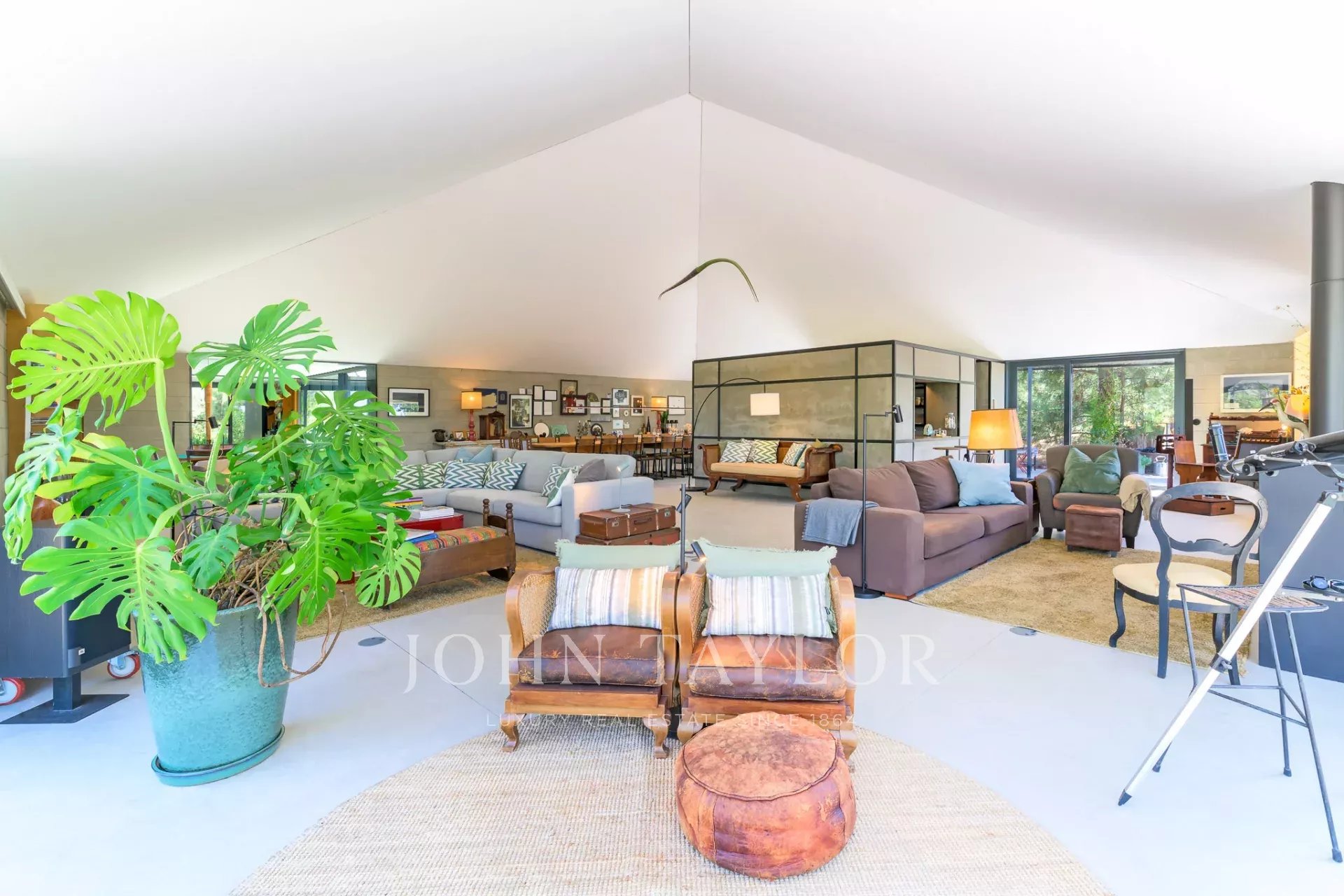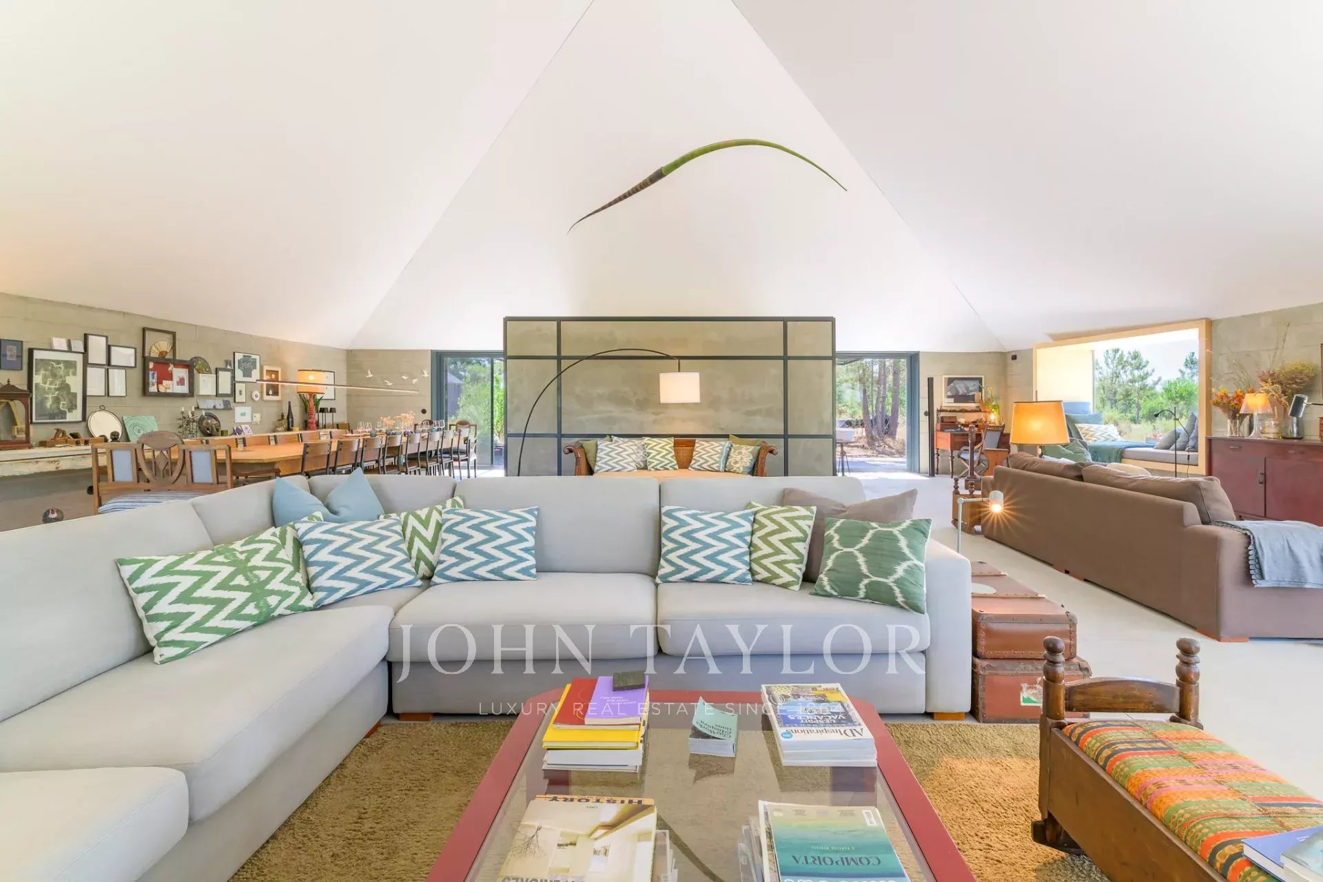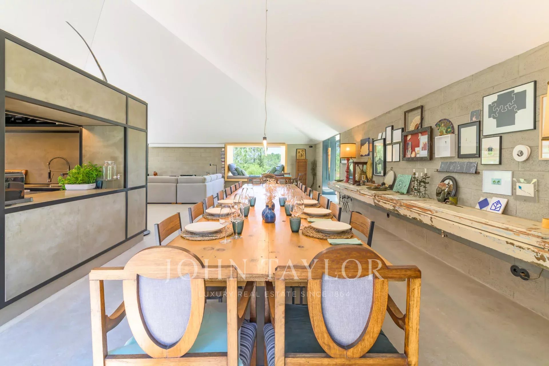 he social area features a large open-plan living space that connects seamlessly with nature. A 22-seat dining table invites long, shared meals, while the centrally placed kitchen blends into the space without dominating it—allowing for a relaxed, easy rhythm even while cooking.