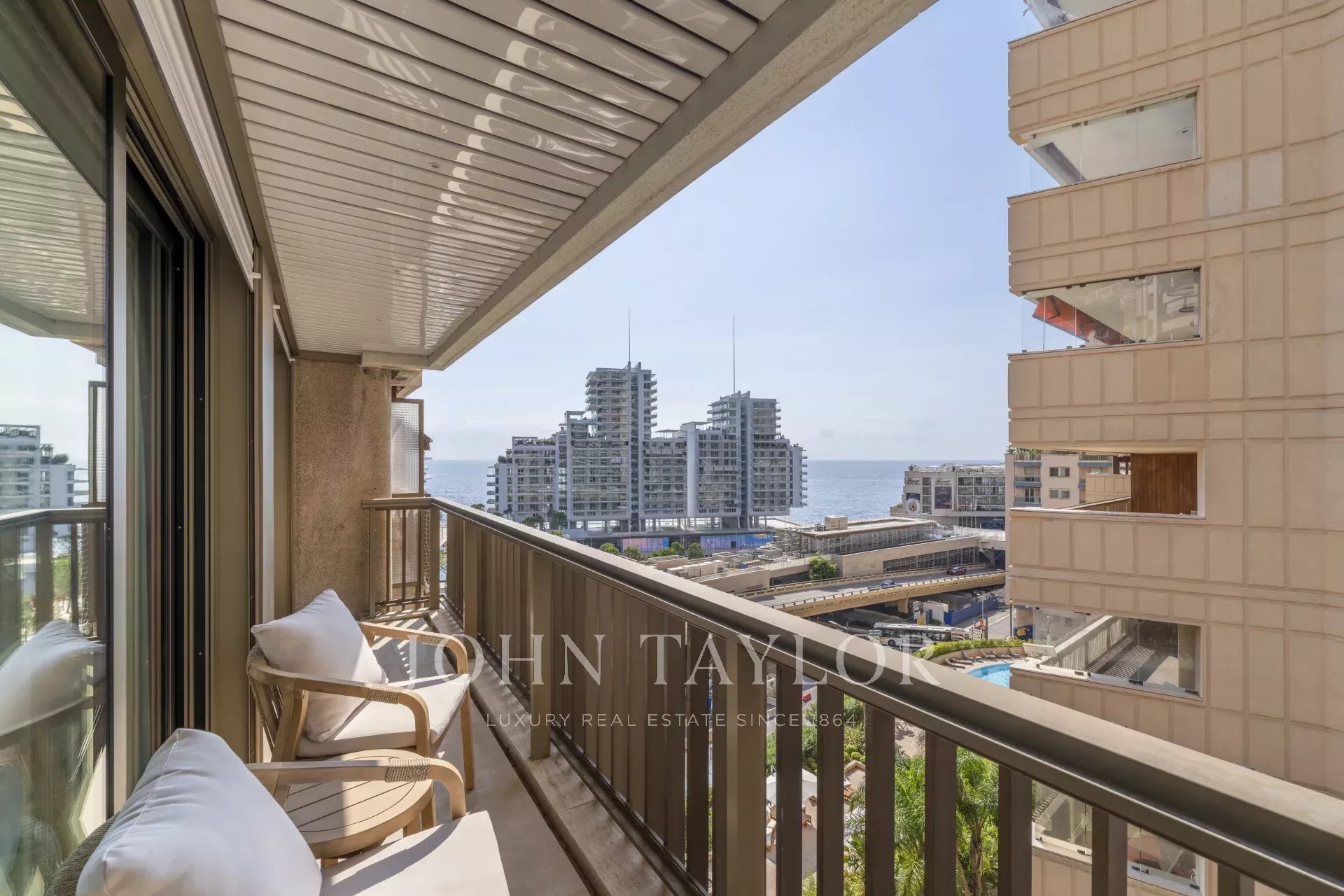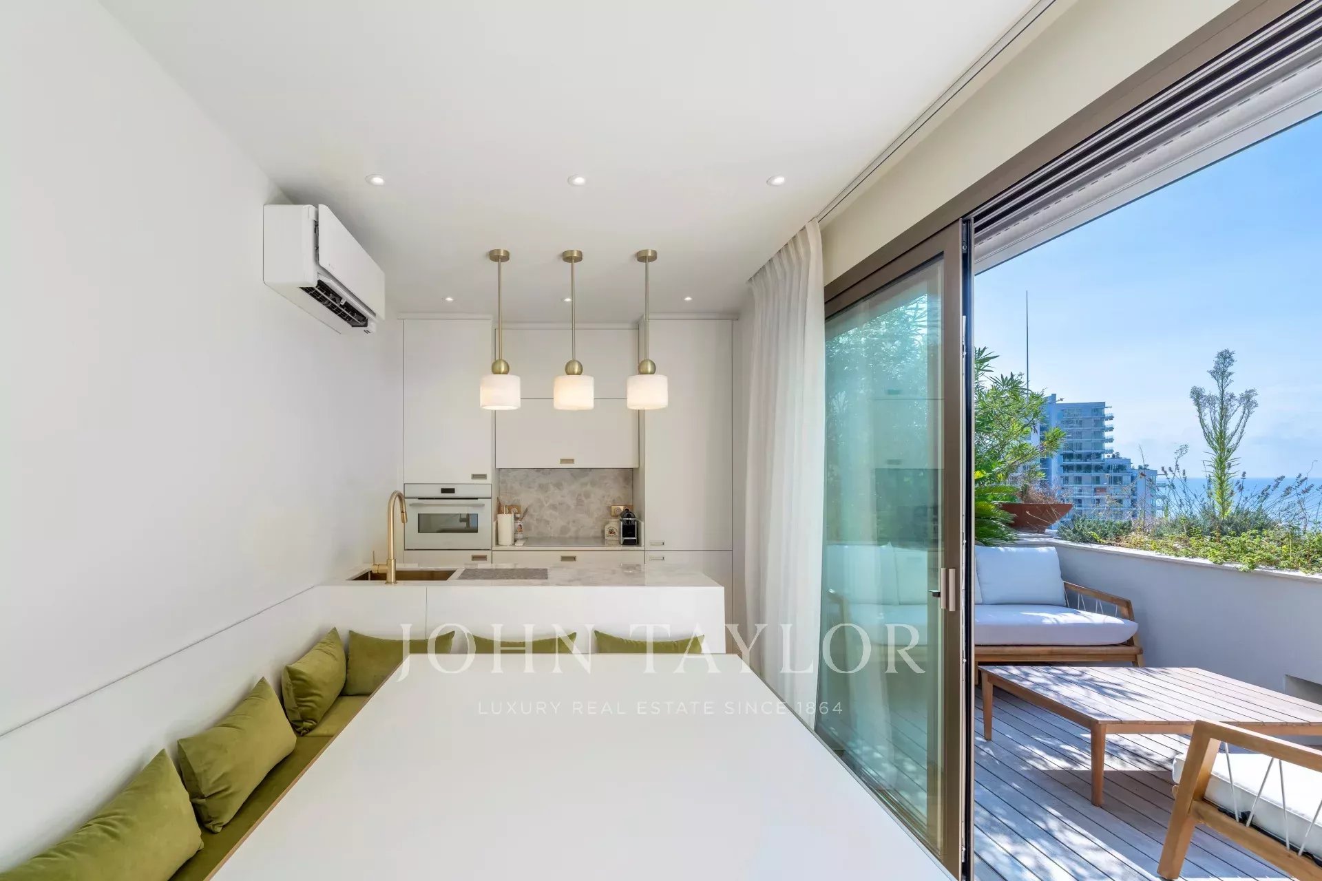 A bright south-east facing living room with sea and Mareterra views.