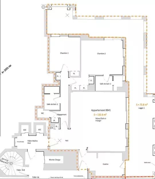 This 132 m² two-bedroom flat has two bathrooms, a large living room, a kitchen and a 75 m² loggia.